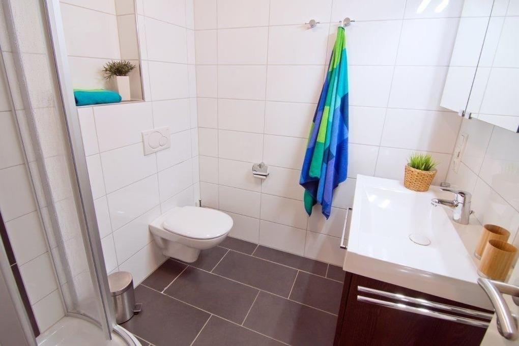 Dusche, Hänge-WC, Fußbodenheizung, Waschkombination mit großem Spiegel, Föhn