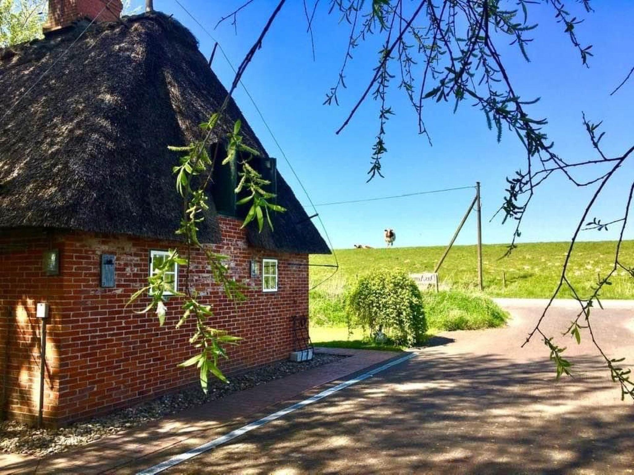 This comfortably and invitingly furnished thatched house with an extensive garden stands alone, surrounded by fields and pastures, in a very quiet location by the embankment and therefore within walking distance of the tidal flats. It is part of a tranquil community in North Frisia, to the south-west of Husum, on the north coast of the Eiderstedt peninsula.