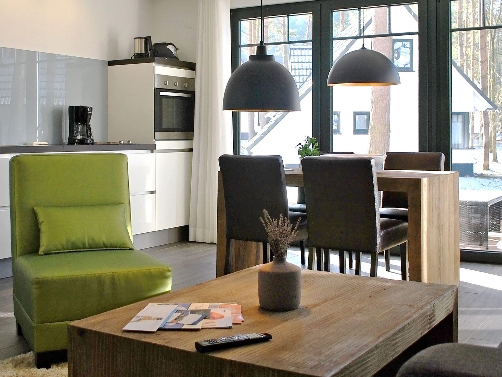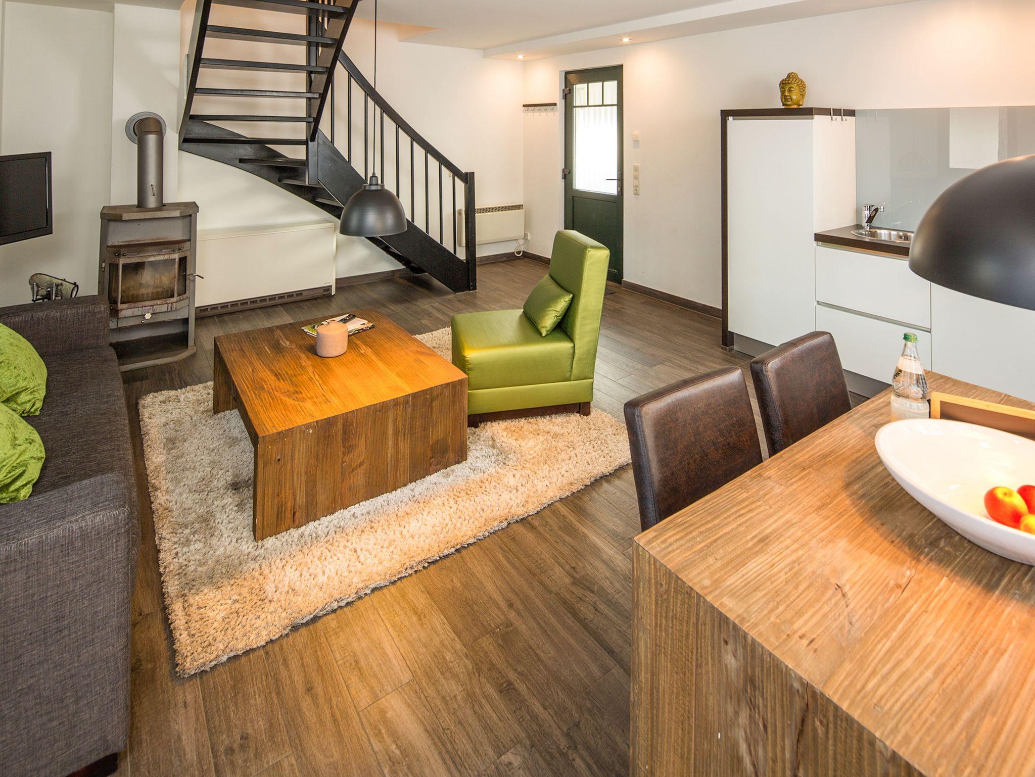 Die etwa 55m² große Ferienhaushälfte (2-4 Personen) verfügt im Erdgeschoss über einen modernen Wohnraum mit Kaminofen. Ein Essbereich sowie eine Küchenzeile (Geschirrspüler, Kühlschrank mit Gefrierfach, Backofen, zwei Kochplatten, Kaffeemaschine, Toaster, Wasserkocher) sind im Wohnraum integriert.