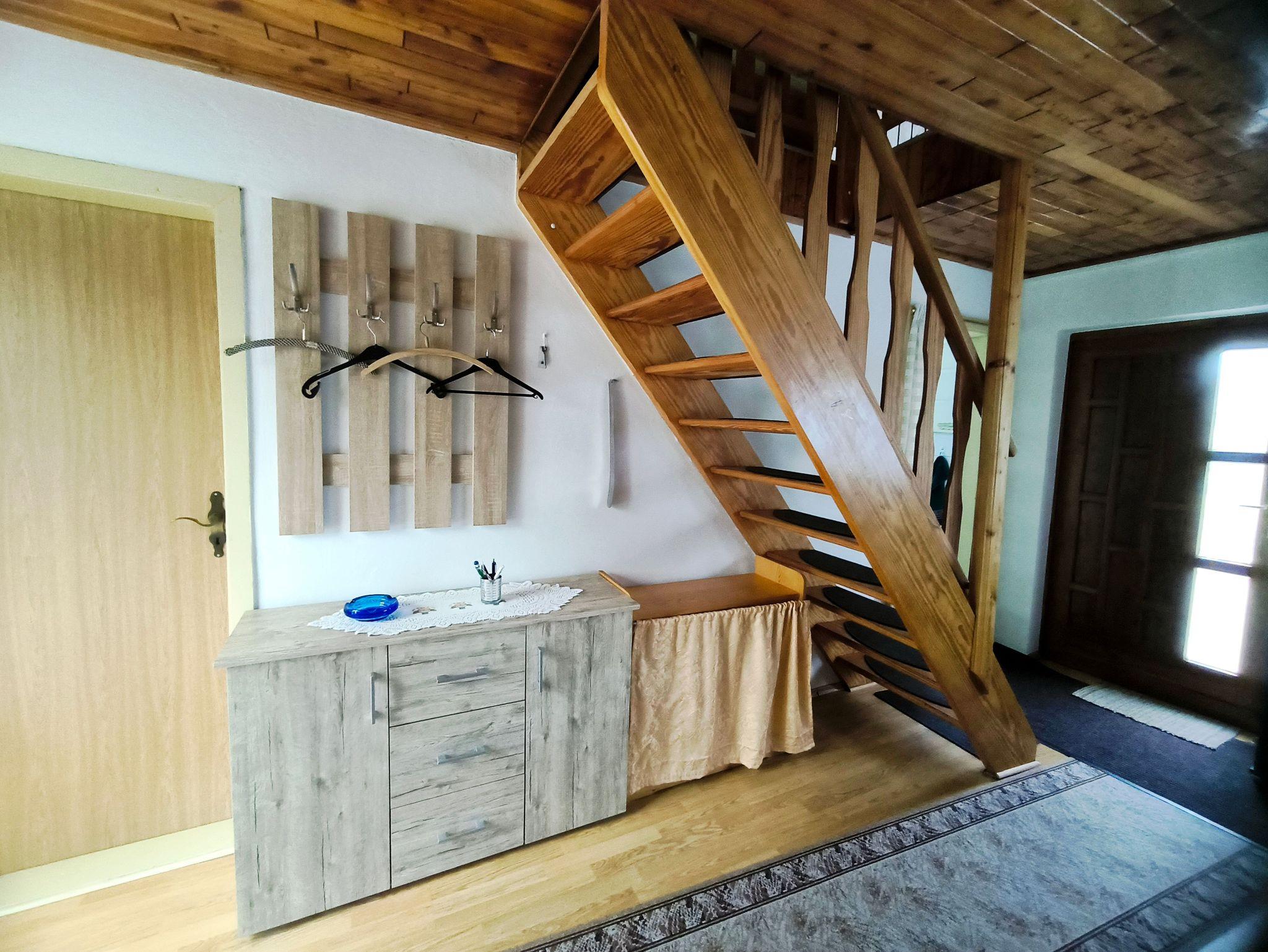 Willkommen in Ihrer gemütlichen Ferienwohnung, die Ihnen einen perfekten Rückzugsort für entspannte Tage bietet! Im Erdgeschoss erwartet Sie ein einladendes Wohnzimmer, das mit einem Kamin für wohlige Wärme sorgt. Hier können Sie es sich auf der bequemen Eckcouch oder im Sessel mit einem guten Buch gemütlich machen. Außerdem bietet einen Anbauwand - bestückt mit einer Spieleauswahl - Stauraum und zusätzlichen Komfort.