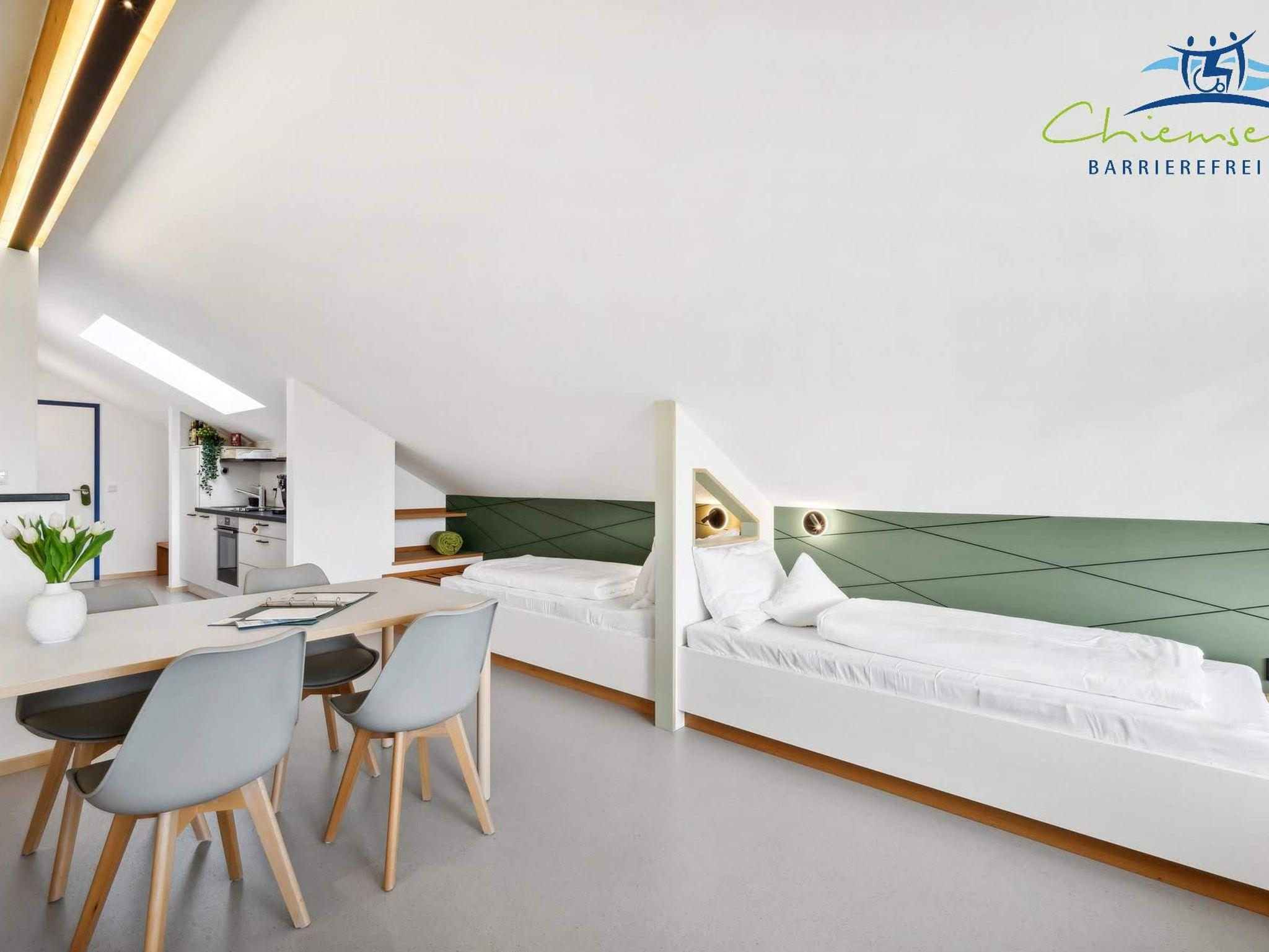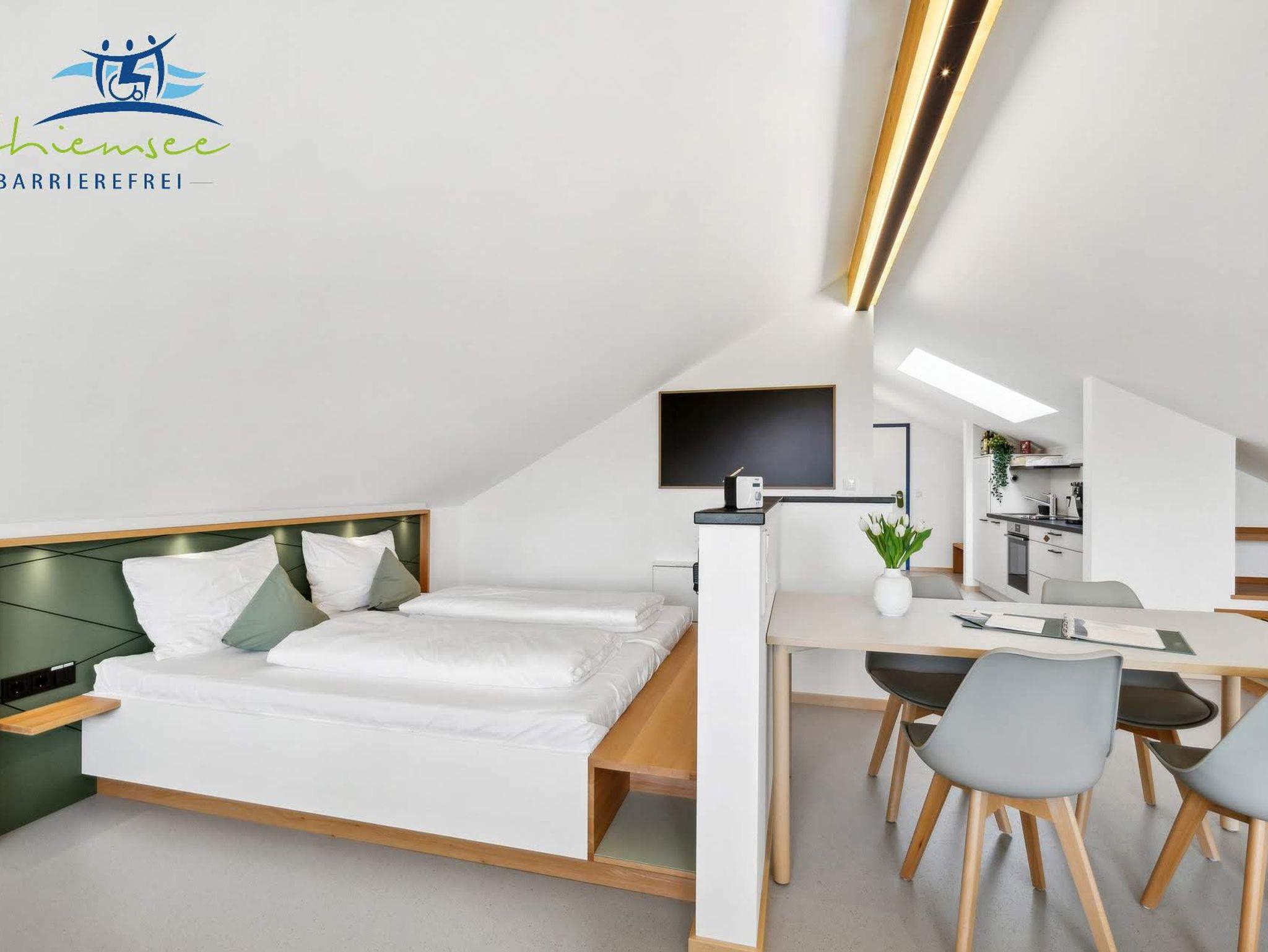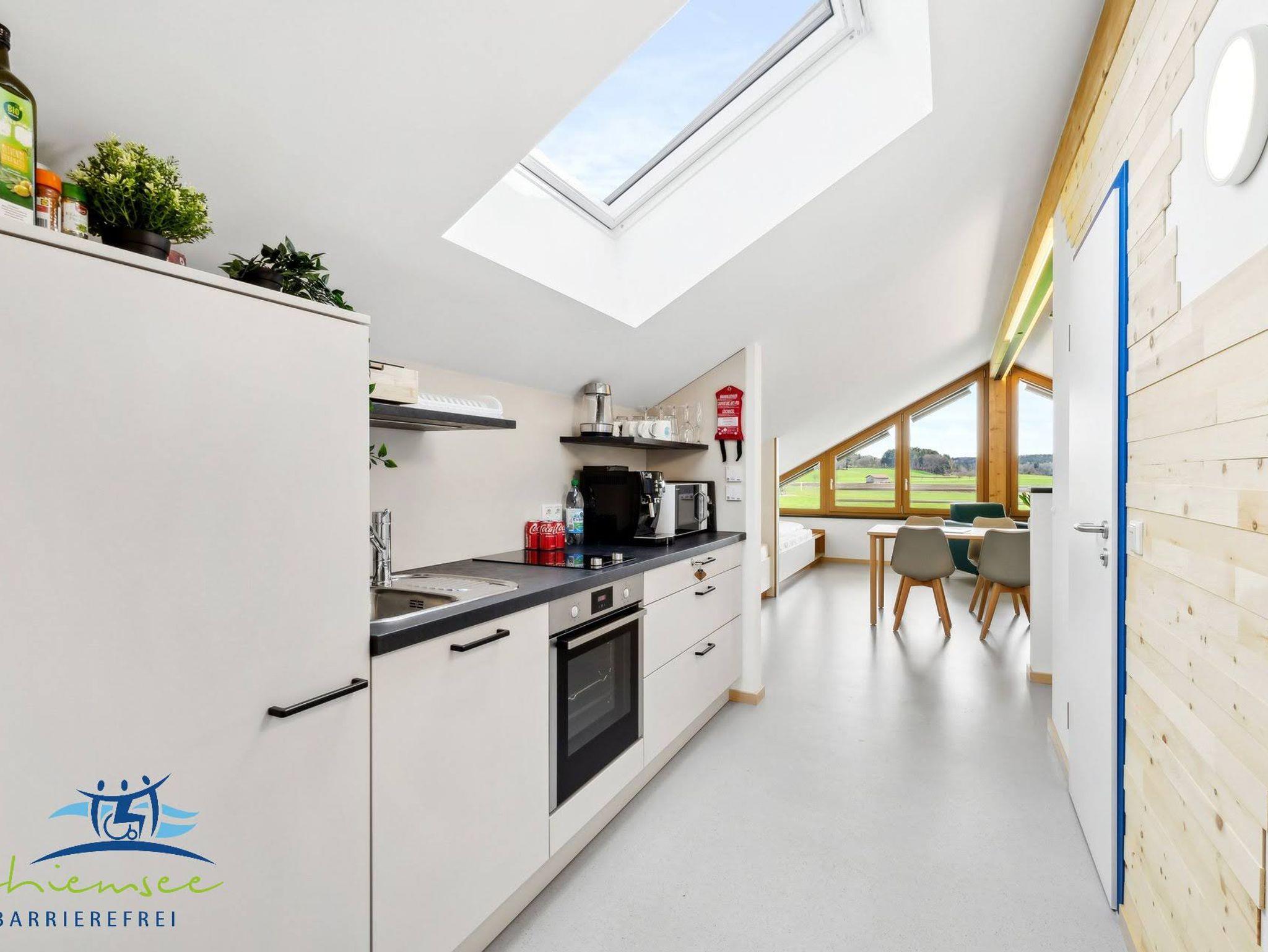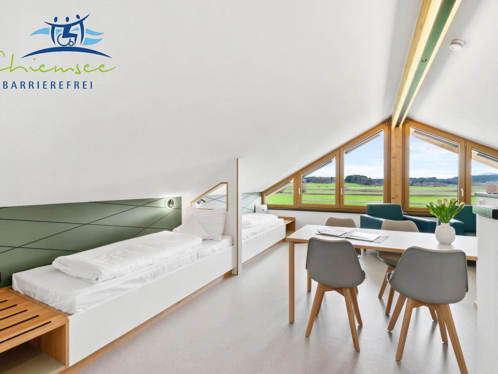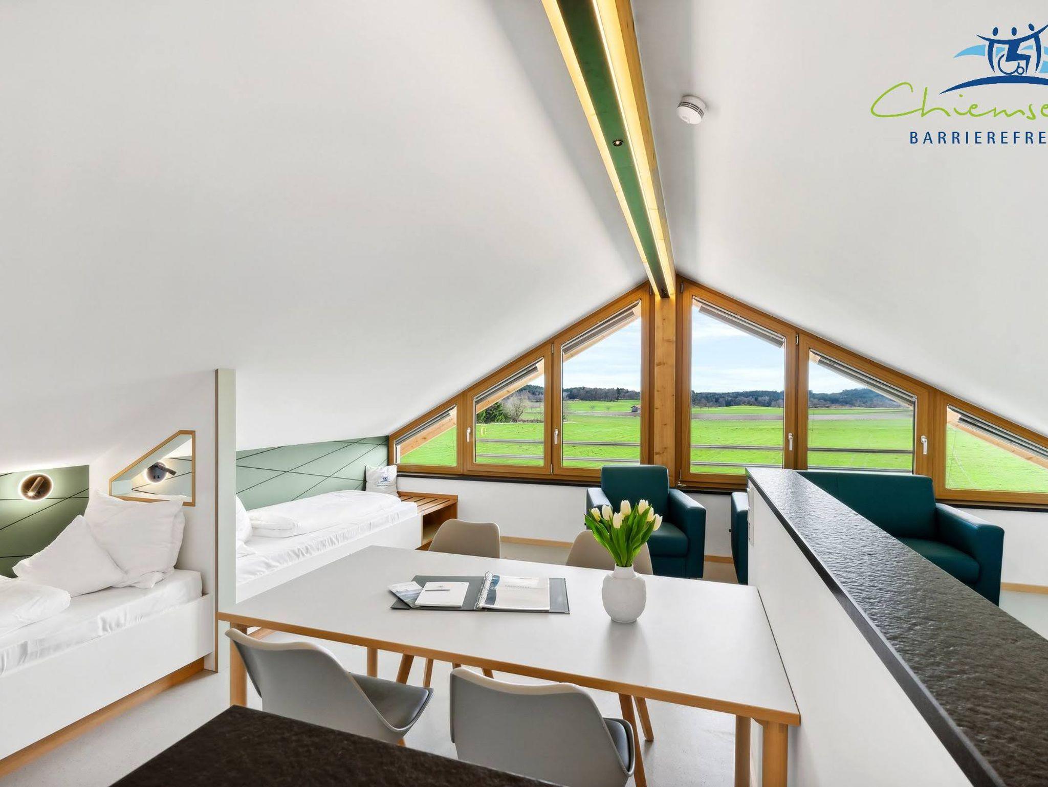Unser Panorama Apartment hat 50qm, verteilt auf einen Studio- Schlafbereich mit integriertem Koch / Essbereich, sowie Badezimmer. Das Apartment bietet einen 6 Meter breiten Panoramablick in die Berge und das davor liegende Naturschutzgebiet. Es hat eine eigene voll ausgestattete Küche. Alle Informationen sind in leichter Sprache, sowie in Brailleschrift dargestellt. Mit Buchung des Panorama Apartments haben Sie kostenfreien Zugang zu Angeboten wie Fahrräder, Kettcars, Klang- / Erlebnisgarten usw. Ein Parkplatz, W-Lan, Bettwäsche, Endreinigung und Handtücherservice sind inbegriffen, auch steht unseren Gästen eine kostenfreie Waschmaschine mit Trockner zur Verfügung. Das Panorama Apartment ist modern und ansprechend gestaltet. Ein kostenfreies Baby-Zustellbett ist auf Anfrage erhältlich. Sie können das Panorama Apartment mit bis zu vier Personen beziehen. Haustiere sind vorbehaltlich willkommen. Nutzen Sie unser Panorama Apartment als Ausgangspunkt für Tagesausflüge zum Chiemsee, in die Alpen und die umliegenden historischen Altstädte. Wir von Chiemsee barrierefrei beraten Sie gerne.