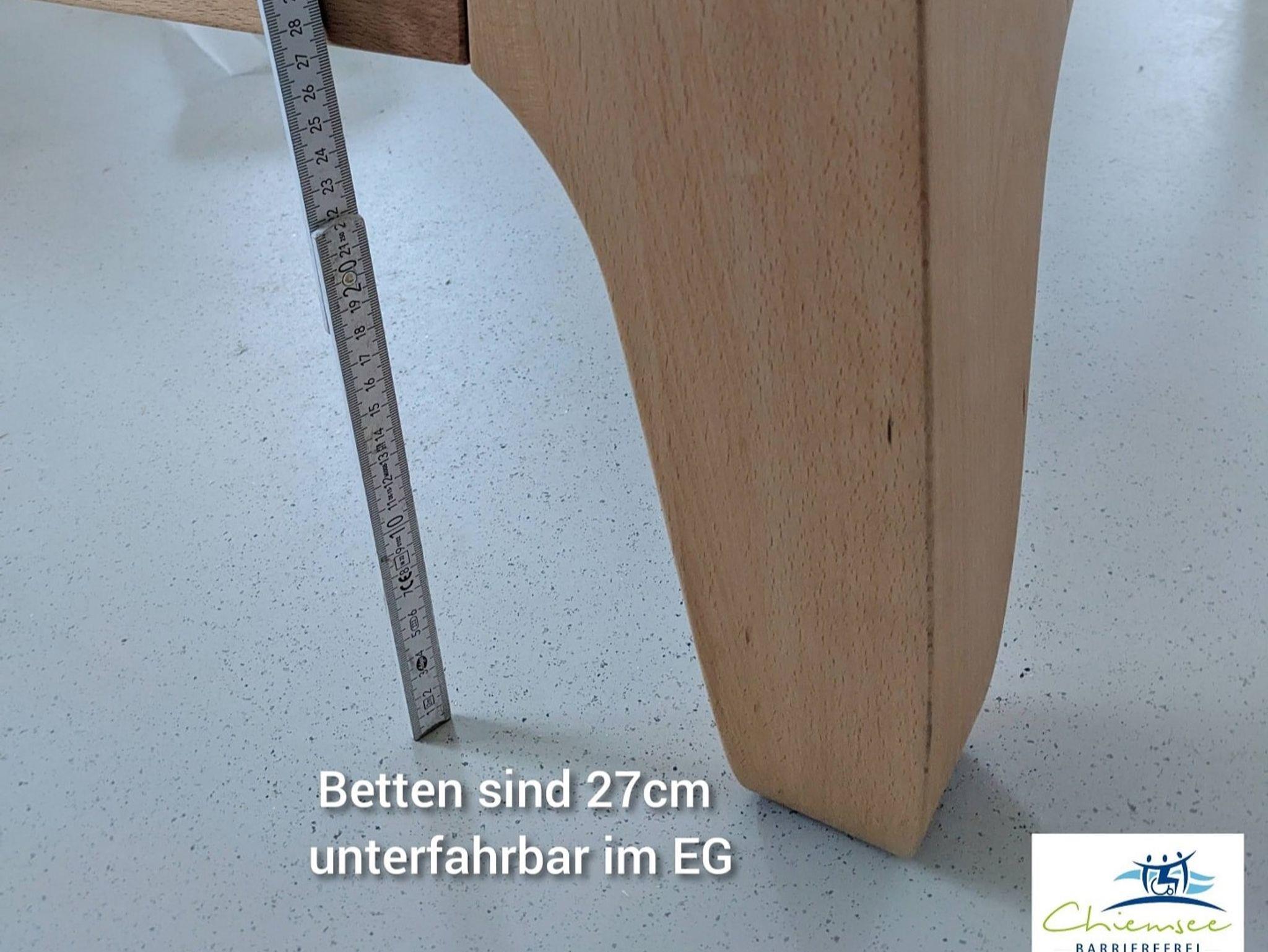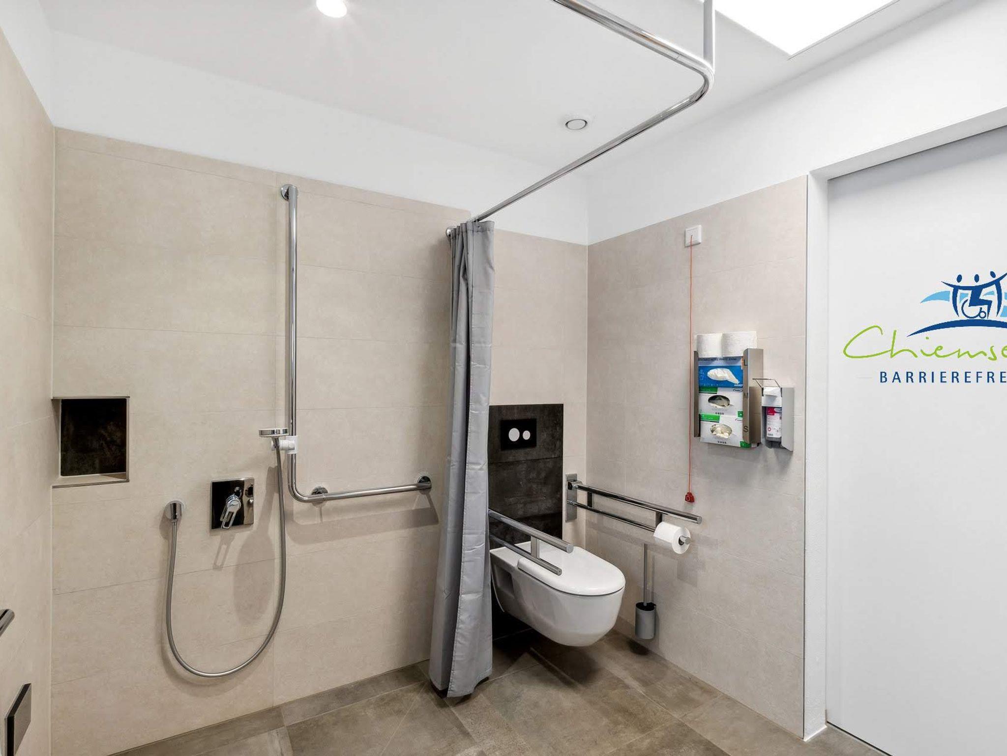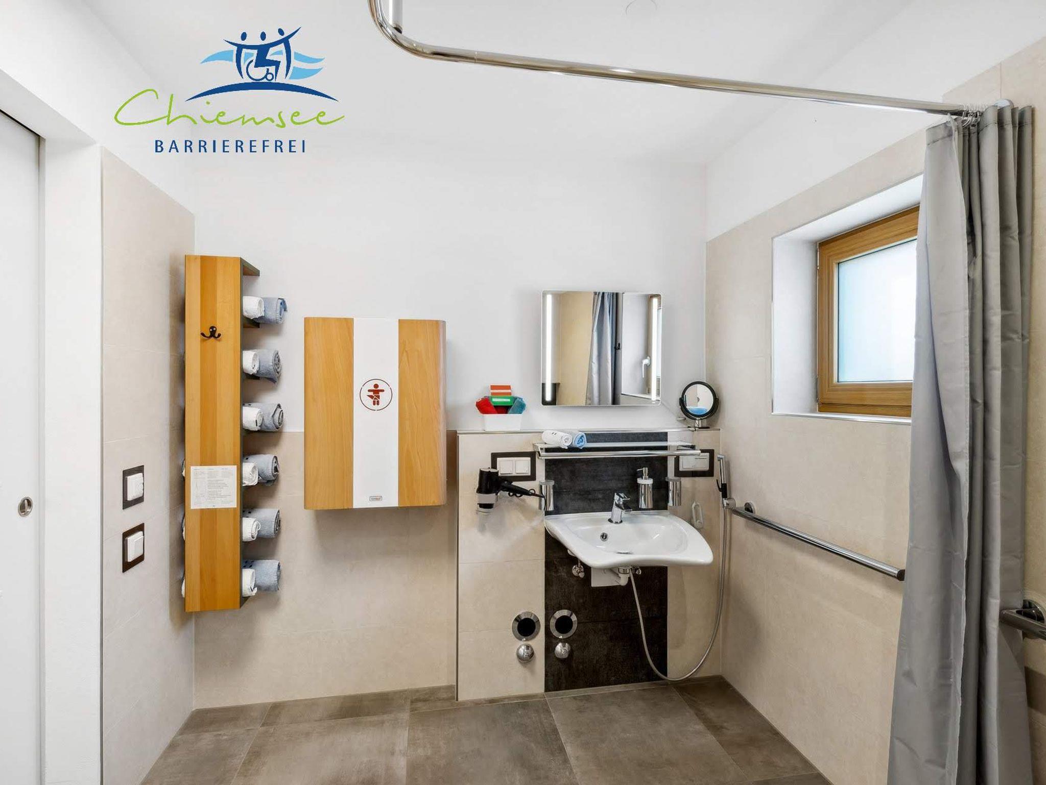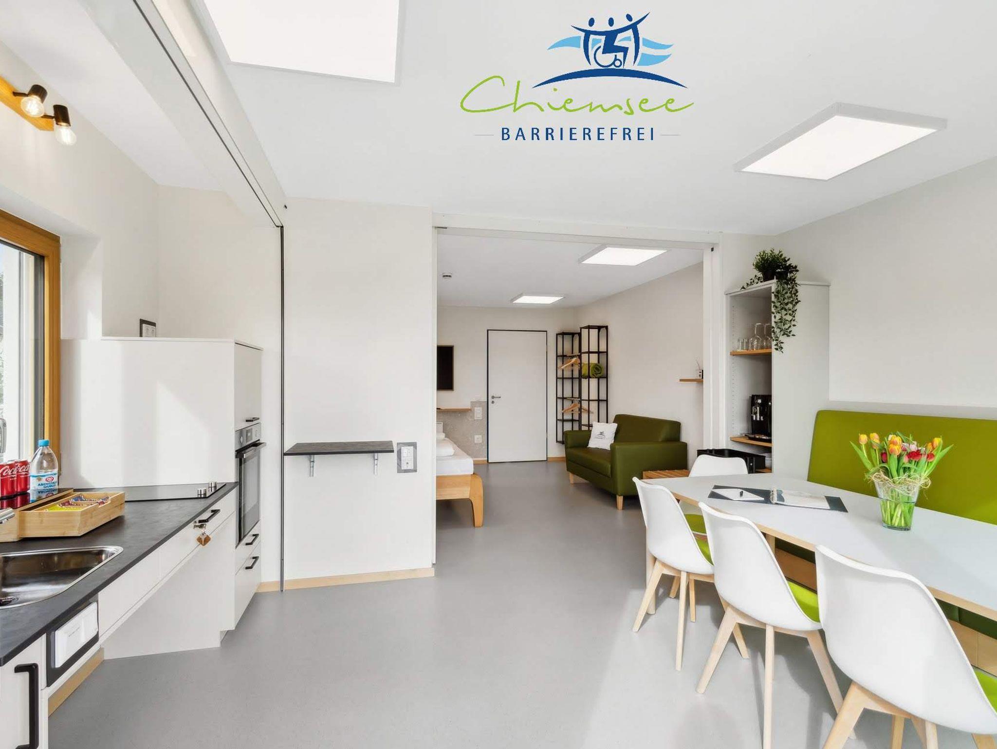 Unser Familienapartment ideal für Familien mit und ohne Behinderungen hat 60qm, verteilt auf zwei Schlafzimmer und einen Koch / Essbereich, sowie Badezimmer. Zudem haben Sie Ihre eigene Terrasse mit Panoramablick. Das Apartment hat eine eigene voll ausgestattete Küche. Es ist komplett nach DIN 18040 barrierefrei für Rollstuhlfahrer nutzbar und befindet sich schwellenfrei im Erdgeschoss. Alle Türen, Terrassentüren und Wendekreise mit 150cm sind auch für breitere E-Rollstühle nutzbar. Alle Informationen sind in leichter Sprache, sowie in Brailleschrift dargestellt. Mit Buchung des Familienapartments haben Sie alle kostenfreie Angebote wie Fahrräder, Kettcars, Klang- / Erlebnisgarten usw. Selbstverständlich alles barrierefrei zugänglich. Ein Parkplatz, W-Lan, Bettwäsche, Endreinigung und Handtücherservice inklusive, auch steht unseren Gästen eine kostenfreie Waschmaschine mit Trockner zur Verfügung (nicht körperlich barrierefrei zugänglich). Das Familienapartment ist modern und ansprechend gestaltet. Im Doppelbett ist ein elektrisch höhenverstellbarer Lattenrost verbaut. Das erleichtert das Ein- / Aussteigen. Zusätzlich benötigte Pflege- / Assistenzhilfsmittel können auf vorherige Anfrage bereitgestellt werden. Auch ein kostenfreies Baby-Zustellbett ist erhältlich. Eine Babywickelliege ist verbaut. Sie können das Familienapartment mit bis zu sechs Personen beziehen. Haustiere sind vorbehaltlich willkommen. Nutzen Sie unser Familienapartment als Ausgangspunkt für Tagesausflüge zum Chiemsee, in die Alpen und die umliegenden historischen Altstädte. Wir von Chiemsee barrierefrei beraten Sie gerne.