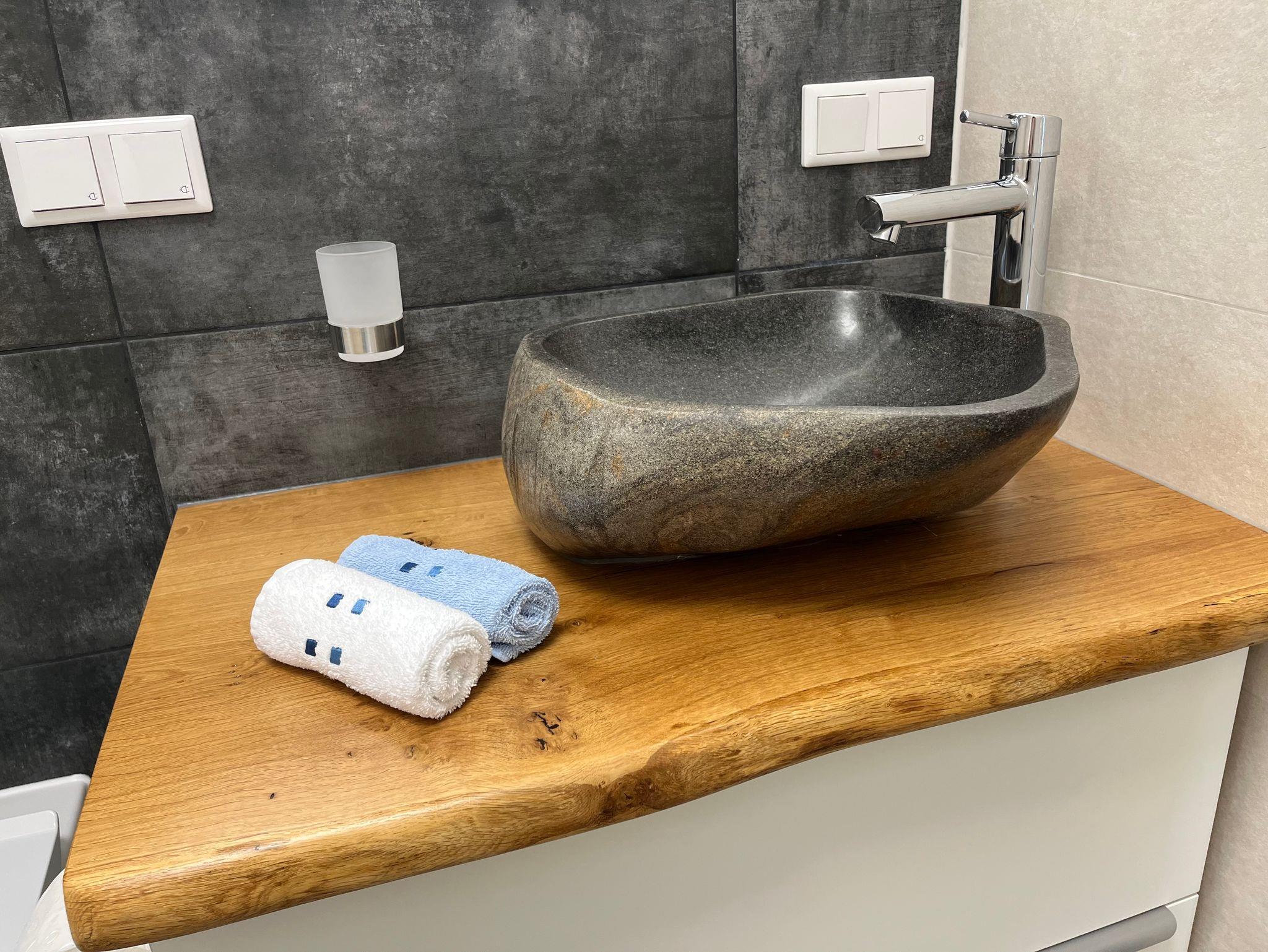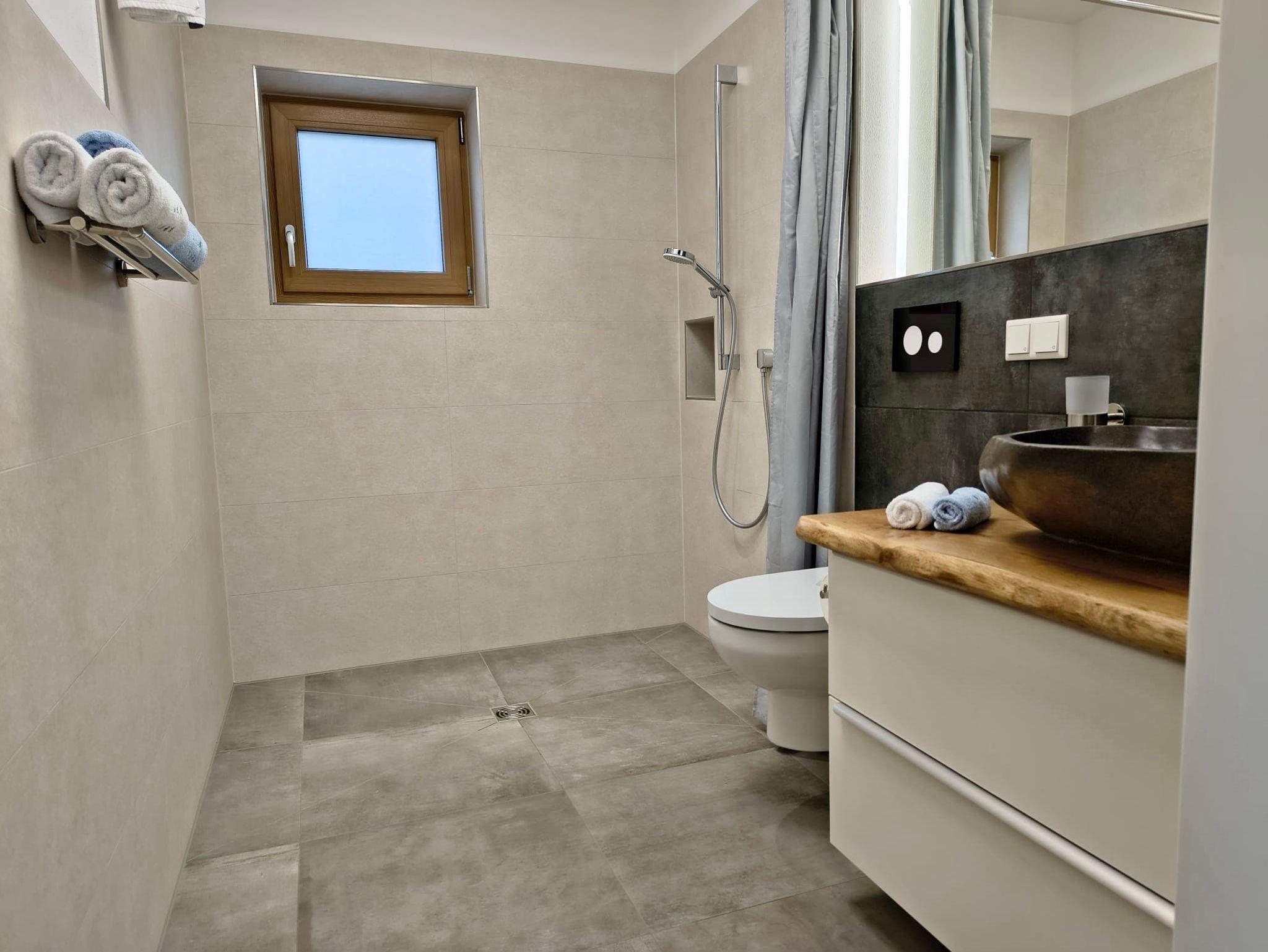 Dieses Doppelbettzimmer ist nach Nordosten ausgerichtet und bietet euch dank der beiden großen Fenster einen herrlichen Sonnenaufgang. Der Blick auf den Garten und das Naturschutzgebiet sowie den dahinterliegenden Alpen sind euch von hier aus garantiert. Eine Bettseite ist mit dem Rollstuhl nutzbar (120 cm Wendekreis). Das eigene Badezimmer ist modern gefliest und verfügt über eine schwellenfreie Dusche, Steinhandwaschbecken (nicht unterfahrbar), WC, Fußbodenheizung und großzügigen Spiegel. Der großzügige und hochwertig ausgestattete Wohn- und Essbereich mit Küche und Balkon können mitgenutzt werden.