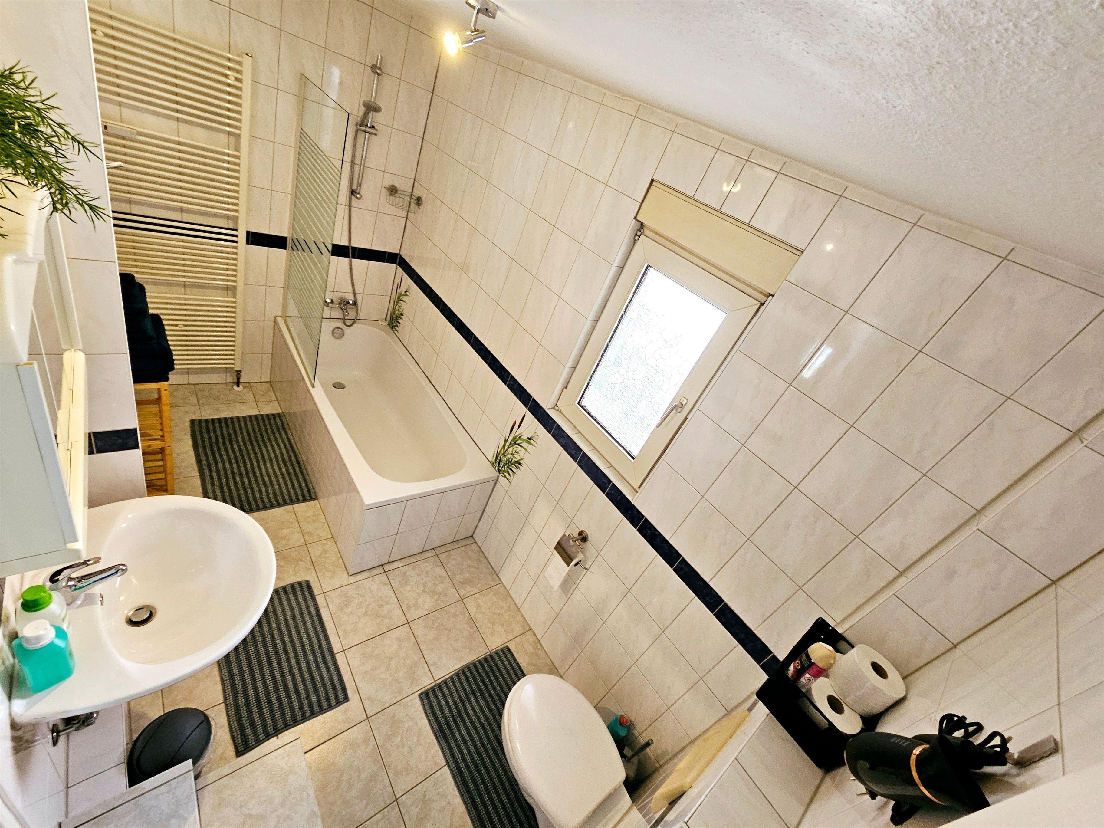 Zwei Stufen führen hinab ins moderne, weiß gekachelte, Tageslicht- Wannenbad/WC in dem Sie nach Belieben baden oder duschen können.