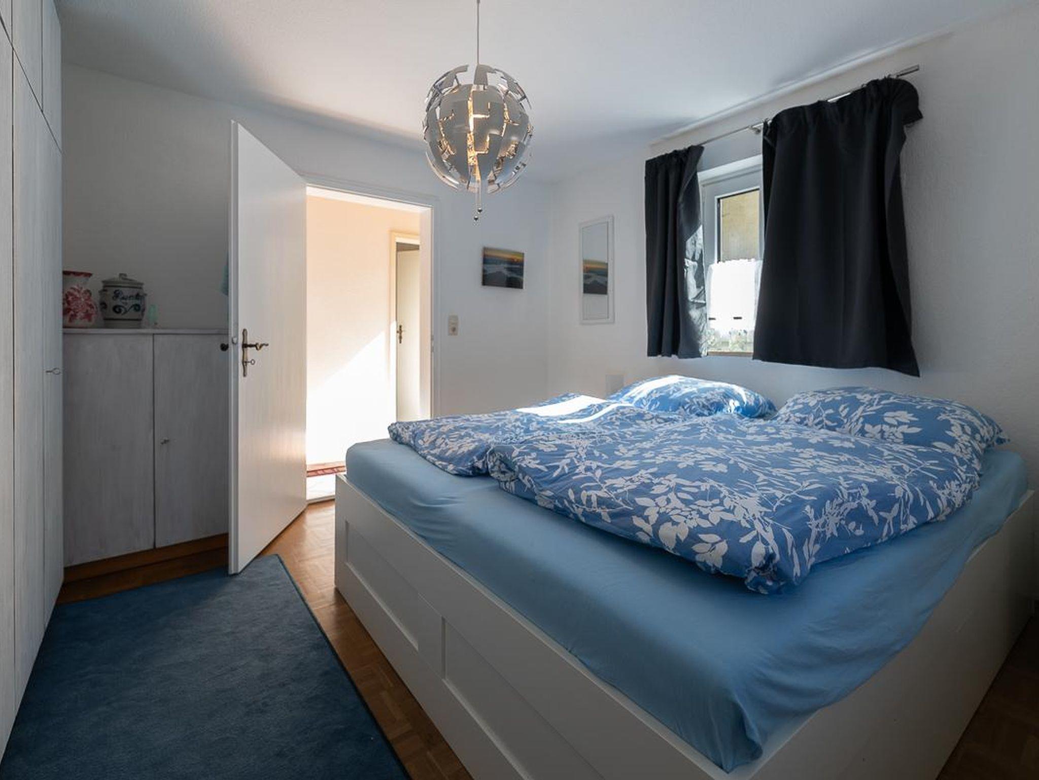 Im komfortablen Schlafzimmer befindet sich ein 1,80 m großes Bett mit hochwertigen Matratzen, einem großzügigem Kleiderschrank und einer Kommode.