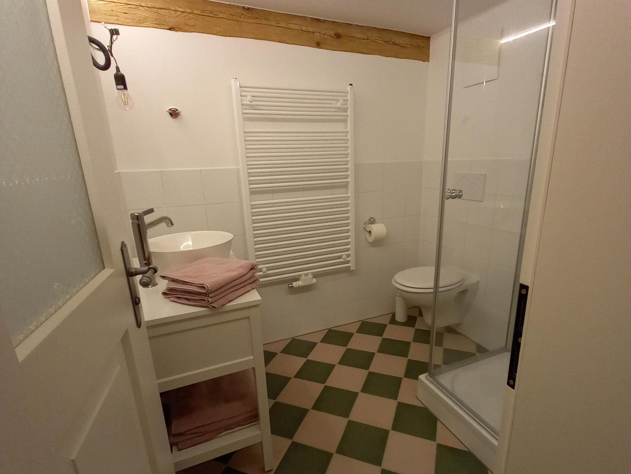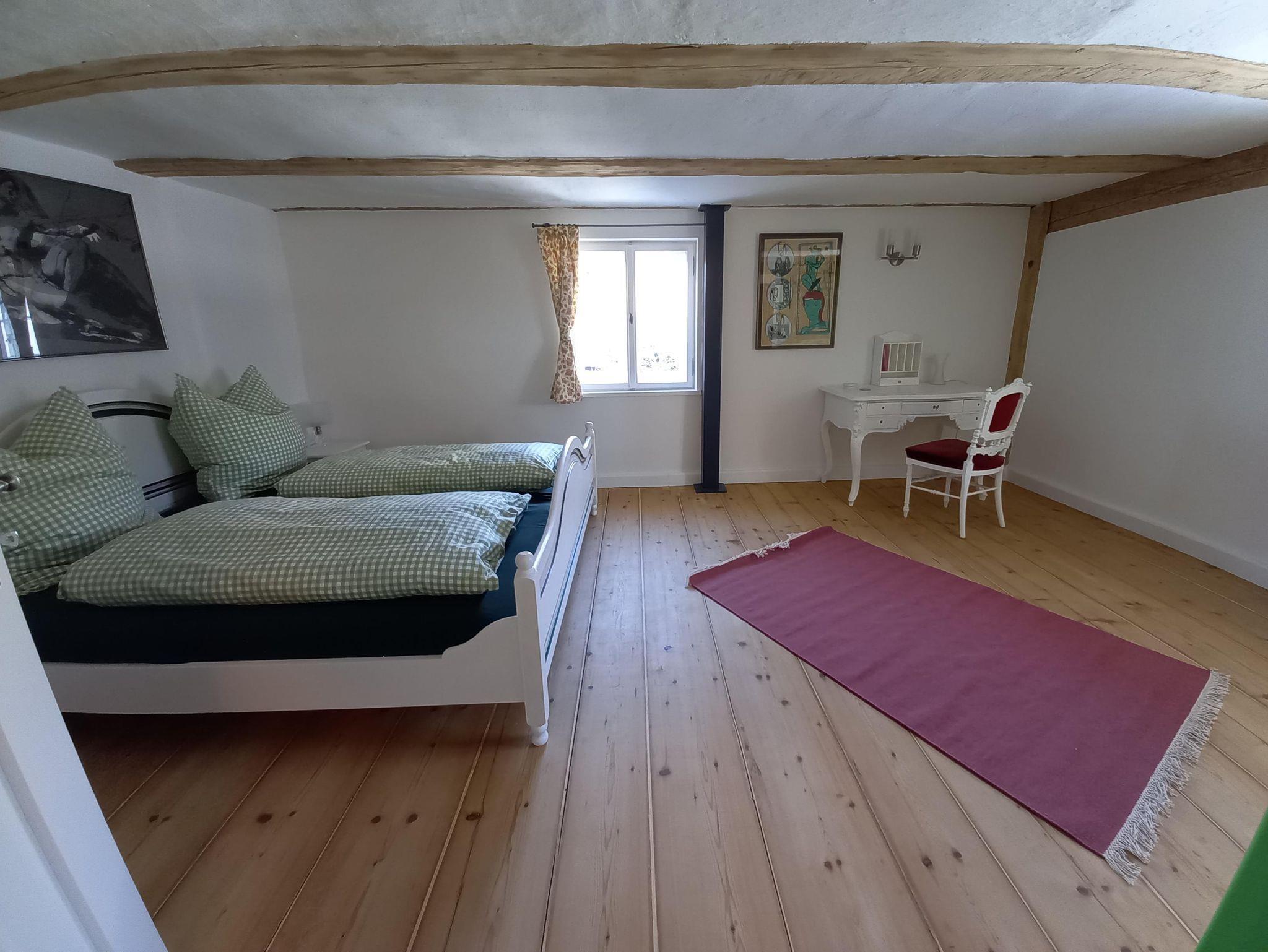 Die Ferienwohnung Rosarot liegt auf der Ostseite vom Hennalahaus, frisch renoviert verfügt sie im Erdgeschoß über ein originelles Wohnzimmer mit Sat-TV und Esstisch und eine voll ausgestattete Küche mit Backofen und Spülmaschine. Im ersten Stock befinden sich zwei Schlafzimmer, eines davon, das größere, mit Doppelbett, das kleinere mit zwei Einzelbetten. Im ersten Stock befindet sich auch das Badezimmer mit Dusche. Im ersten Stock beträgt die Deckenhöhe 2 Meter, da Sie sich in einem denkmalgeschützten Haus befinden, im Erdgeschoß ist die Deckenhöhe normal. Sie haben einen separaten Eingang, den nur Sie benutzen. Sie sind herzlich eingeladen, den Garten auf der Südseite des Hauses mitzubenutzen.
