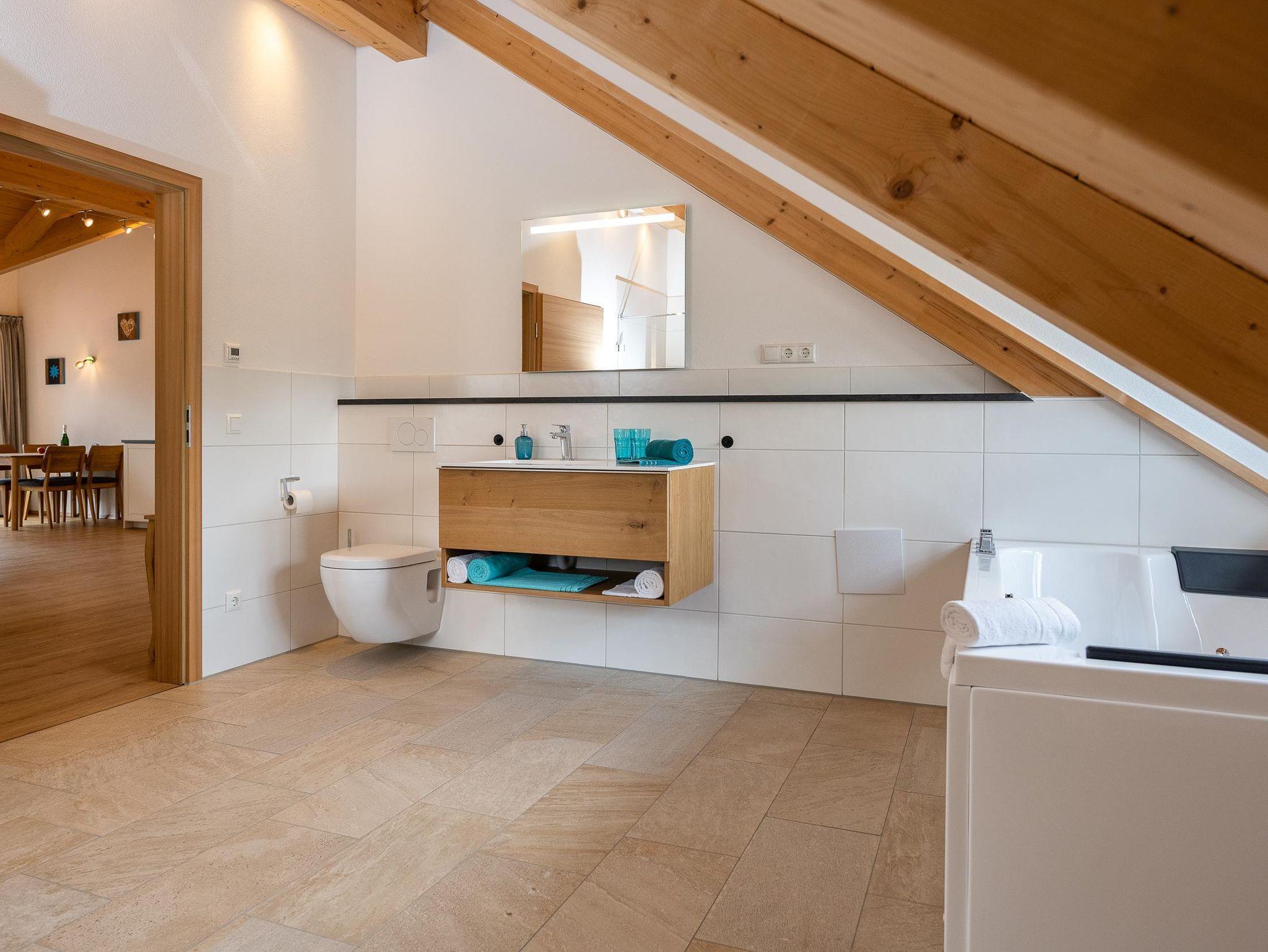 • Badezimmer mit WC, Waschtisch, ebenerdiger Dusche und Whirl-Wanne mit Panoramablick für 2 Personen