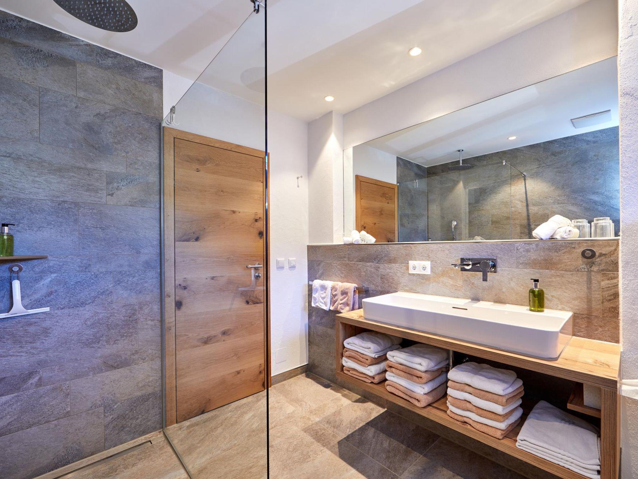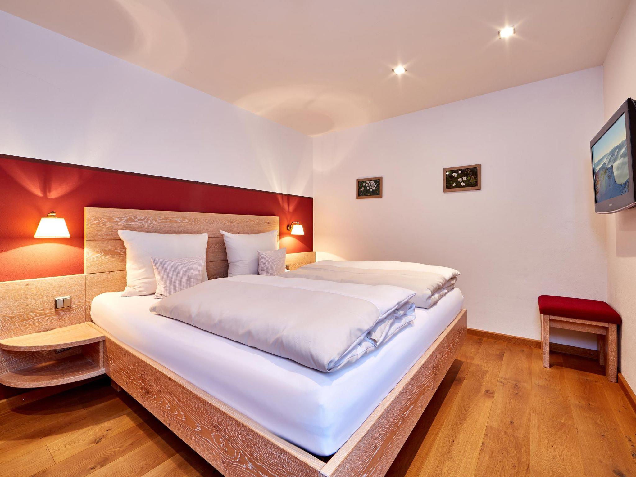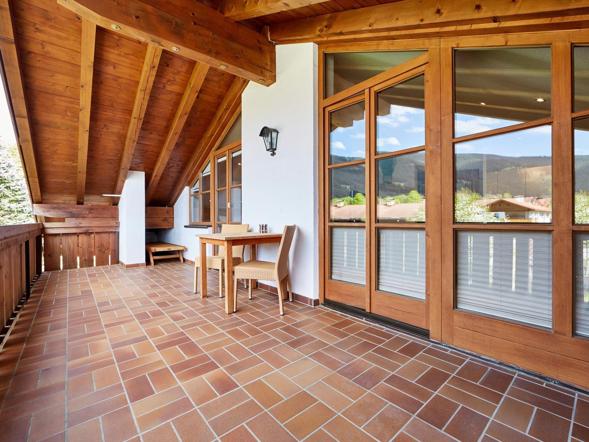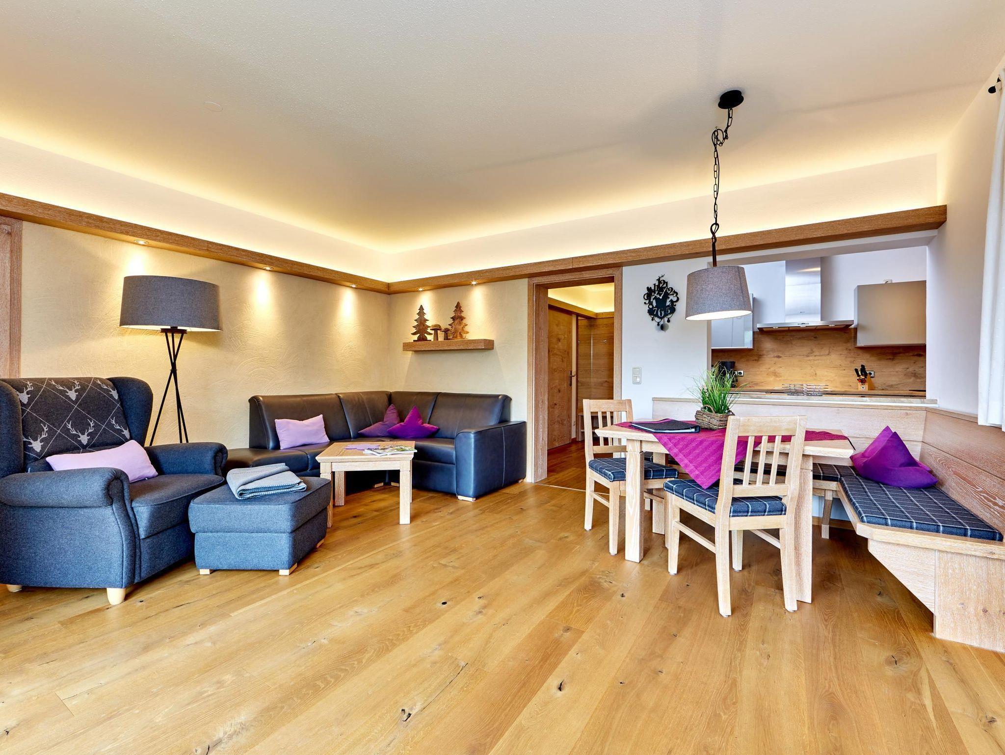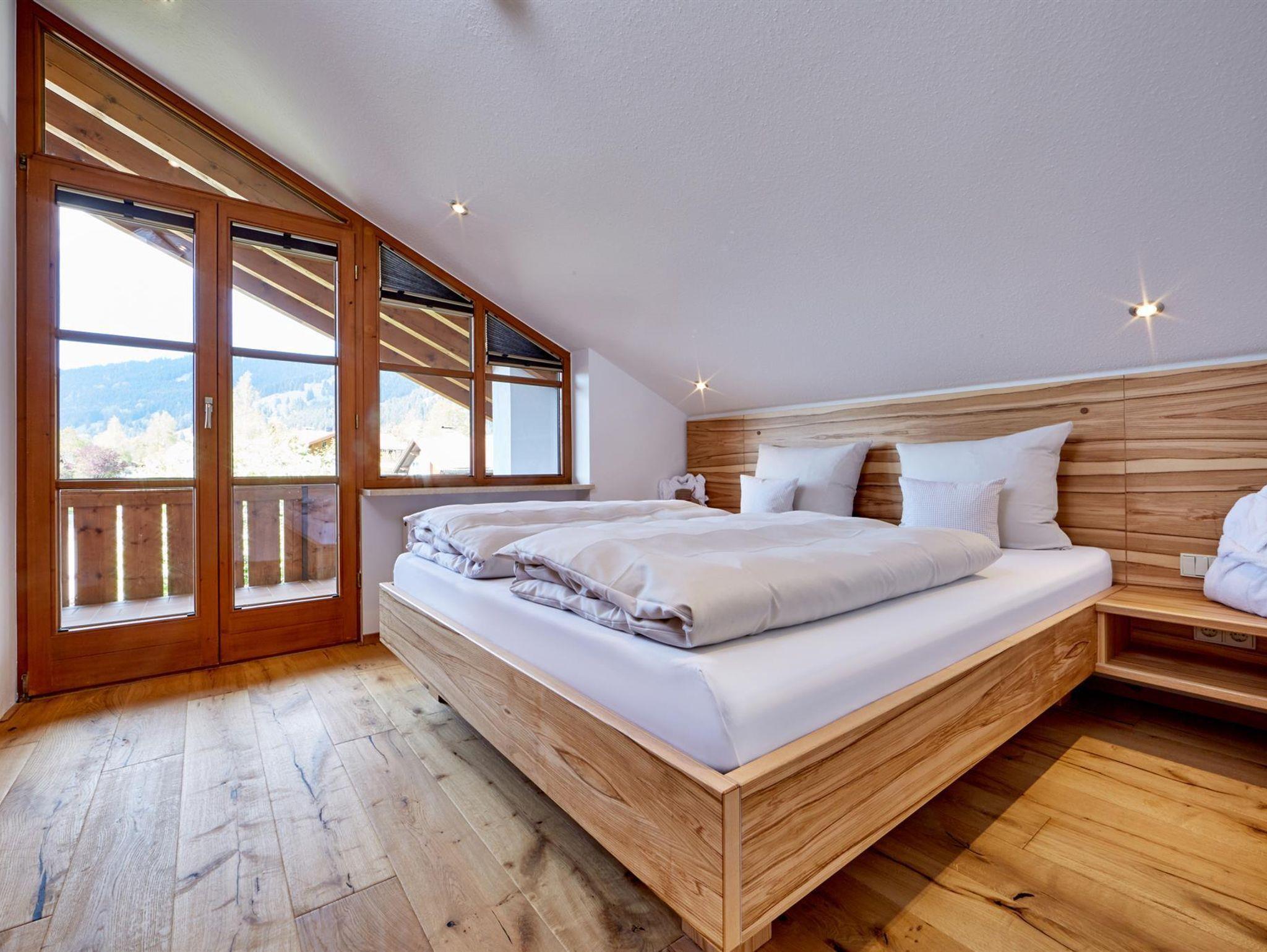 Dachgeschoss-Ferienwohnung (65 m²) mit Holzdielenboden. Einbauküche offen zum Wohnraum. 2 Balkone. Doppelzimmer, kleines Einbettzimmer mit Zustellmöglichkeit für 2. Bett. Duschbad mit WC, Einzelgarage inklusive.
