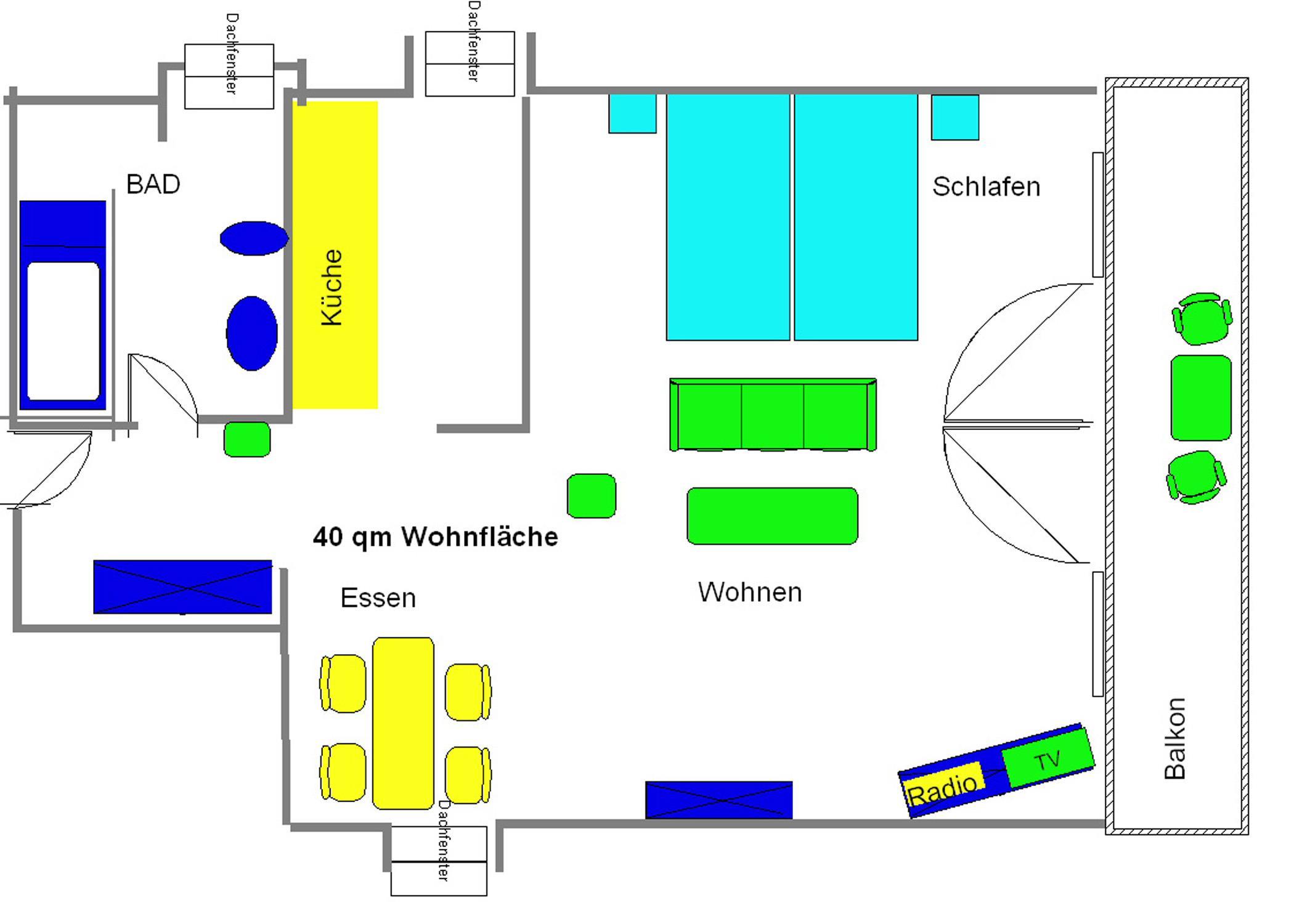 The Kranzhorn holiday flat is located in the Brünnstein residential complex on the outskirts of Oberaudorf, just a few minutes from the town centre. The exclusive and spacious holiday flat is quietly located on the top floor of the apartment complex. It is very bright due to the large panoramic window and the skylights and offers a beautiful view of the Wildbarren and the Kranzhorn. The 1 1/2-room attic studio no. 64 with 40 sqm of living space consists of a bedroom-living room with a double bed, a pull-out double couch, a dining area and a kitchenette and is an ideal flat for 2 possibly 3 people. All facilities available in the house such as indoor swimming pool (30 °, 12 x 6 m), sauna, fitness room, winter garden and library, table tennis room, children's playroom, sunbathing lawn with deckchairs are available free of charge. Coin-operated washing machine and dryer, solarium, coin-operated telephone and an internet WLAN accessible in the flat can be used for a fee. You can also use the bread service offered in the house free of charge. The holiday flat is fully furnished and equipped with towels, bed linen, crockery, micro cooker, radio and HD flat-screen TV and, as a non-smoking flat, is also preferred by allergy sufferers. An underground parking space (space no. 51) is also exclusively reserved for you.