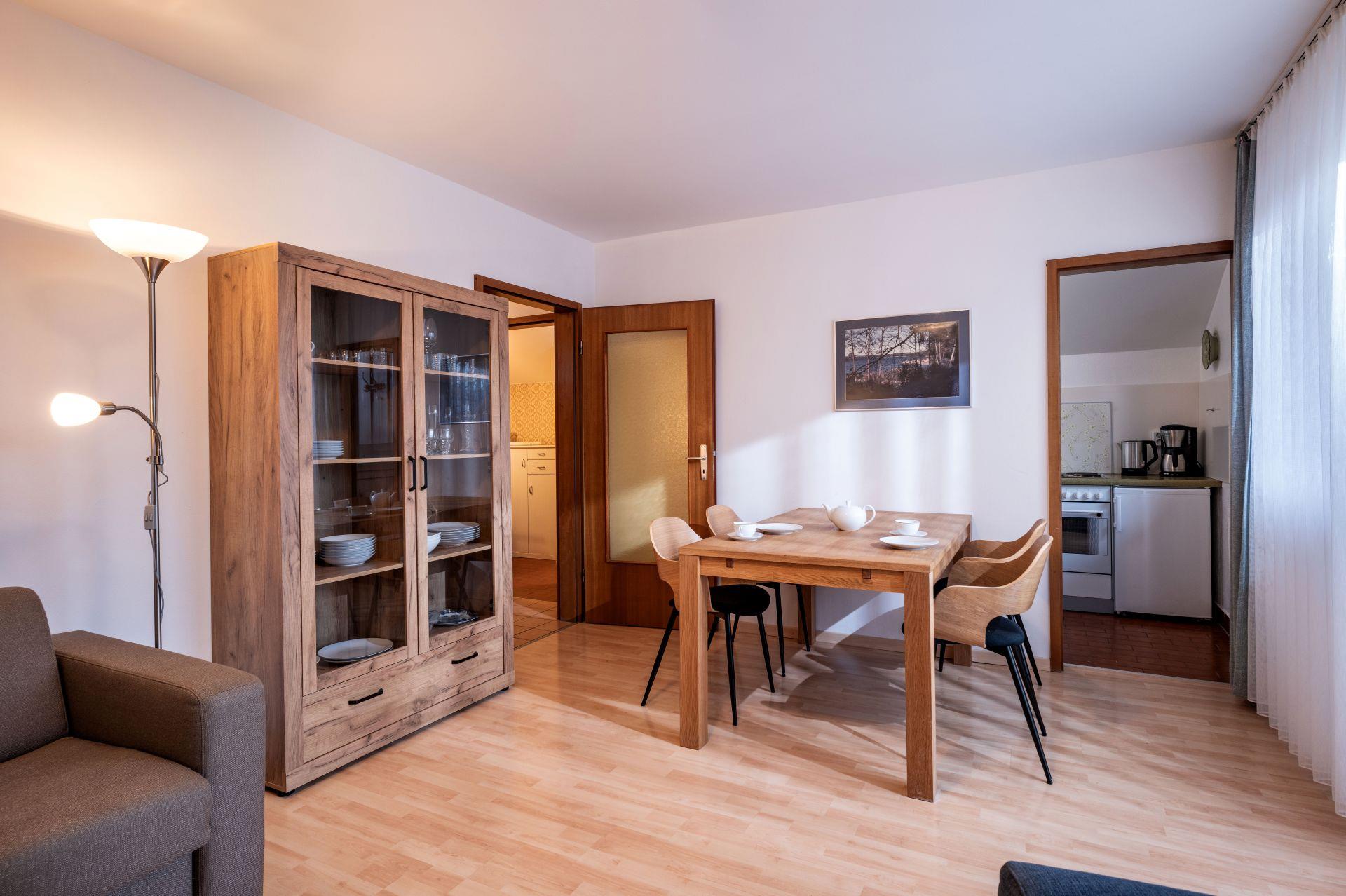 Cosy two-room flat with a view to the south of the Kaisergebirge (56 sqm, 2 to 4 people) and a sofa bed. Living room with corner bench and TV. Bedroom with double bed and wardrobe. Bathroom with WC and tub. Kitchen with 4 plate cooker, oven, refrigerator, microwave, coffee machine and toaster. After an eventful day, the balcony invites you to relax. Towels and bed linen are provided. An underground garage belongs to the flat.There is an indoor swimming pool 30 degrees, a Finnish sauna with relaxation room, as well as a fitness room and a billiard table at your disposal. For the little ones and the grown-ups there is a playroom, as well as table tennis and table football. The garden has playground equipment and garden loungers. In the nearby Pension Lavendel you can indulge yourself with a good breakfast.