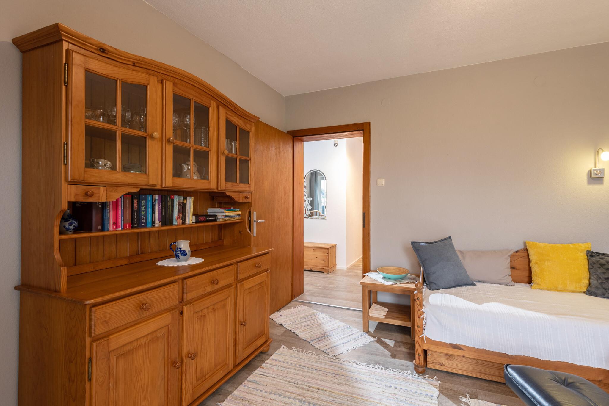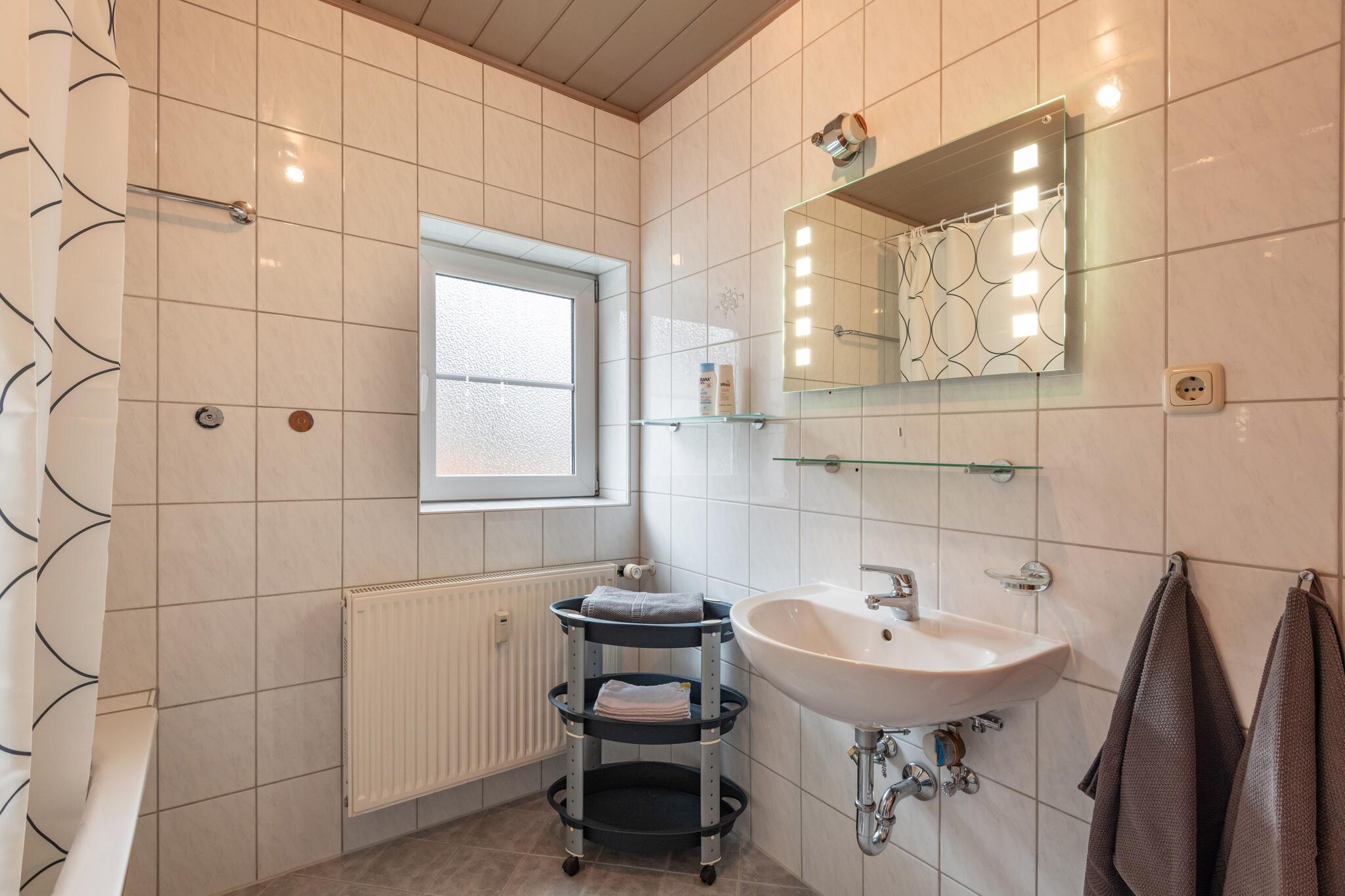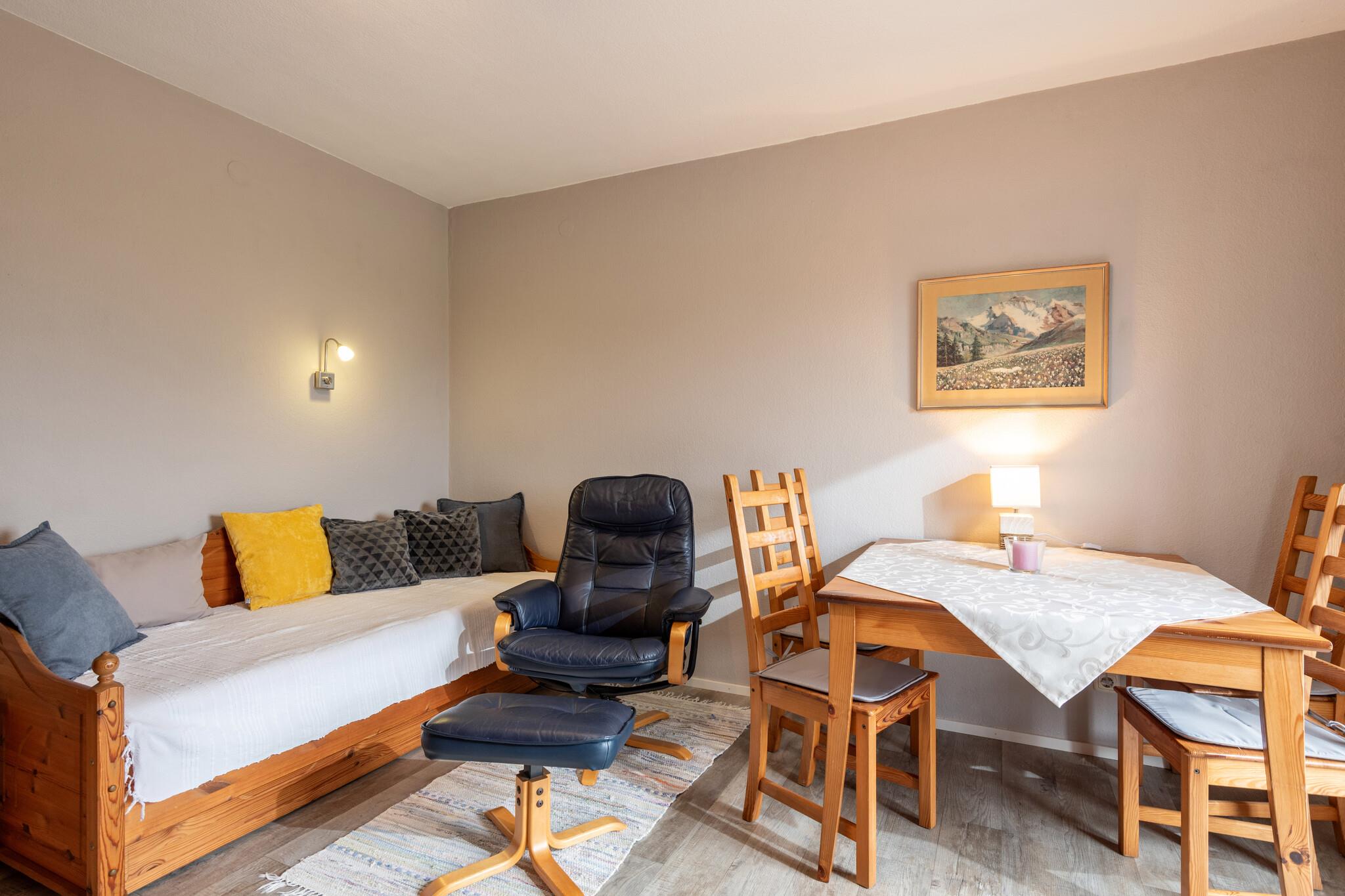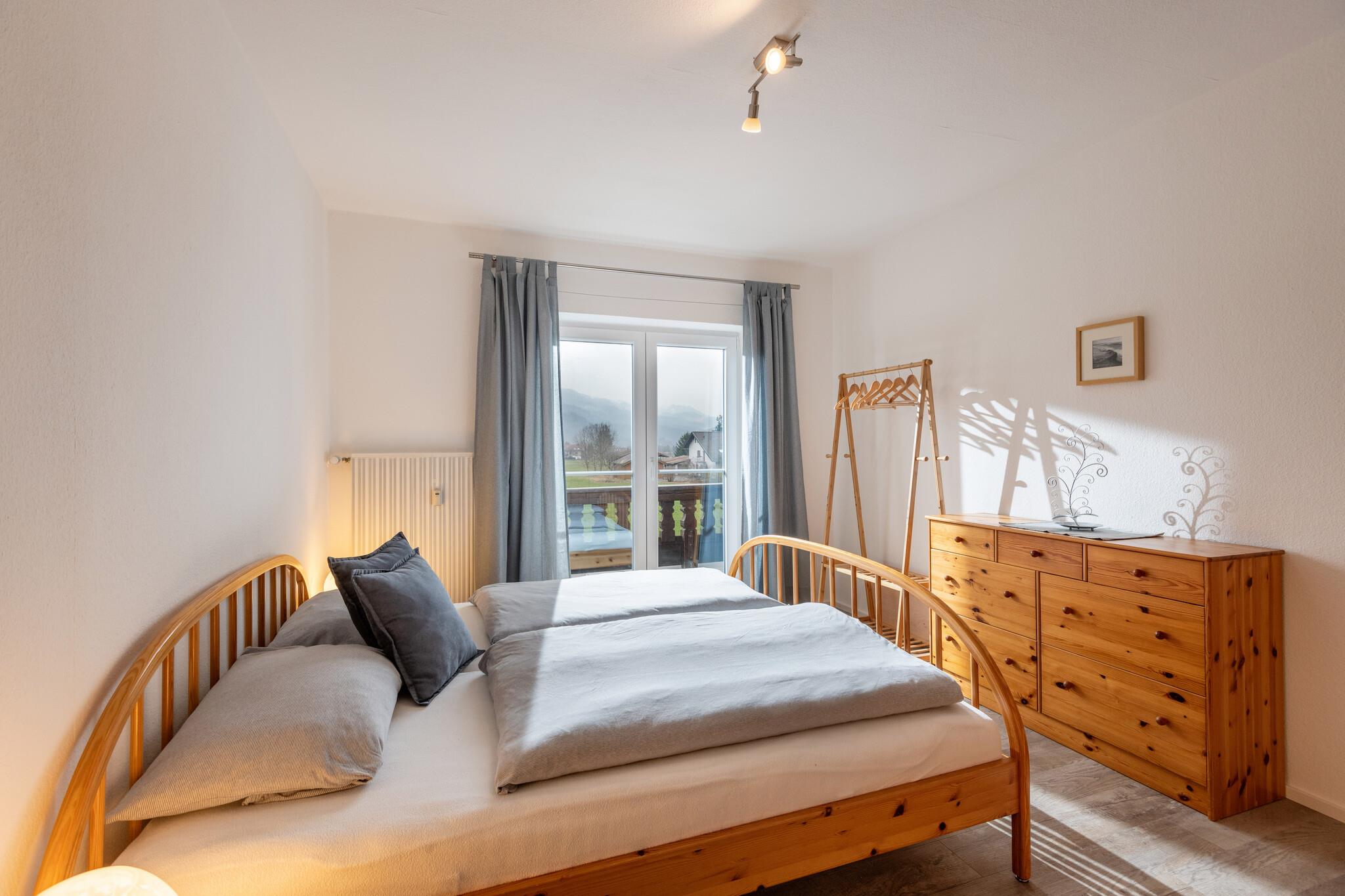 The holiday flat is located on the 1st floor and is furnished in a cosy Bavarian style. In the living room there is a day bed, which can also be used as a couch, as well as a TV armchair and a flat screen TV. There is also a dining table with seating for 4. From this room and also from the separate bedroom with a double bed, you can access the balcony, from which you can enjoy a wonderful mountain panorama. The separate kitchen is fully equipped and has a small seating area for 2 people. The bathroom has a bathtub with shower curtain and a window.