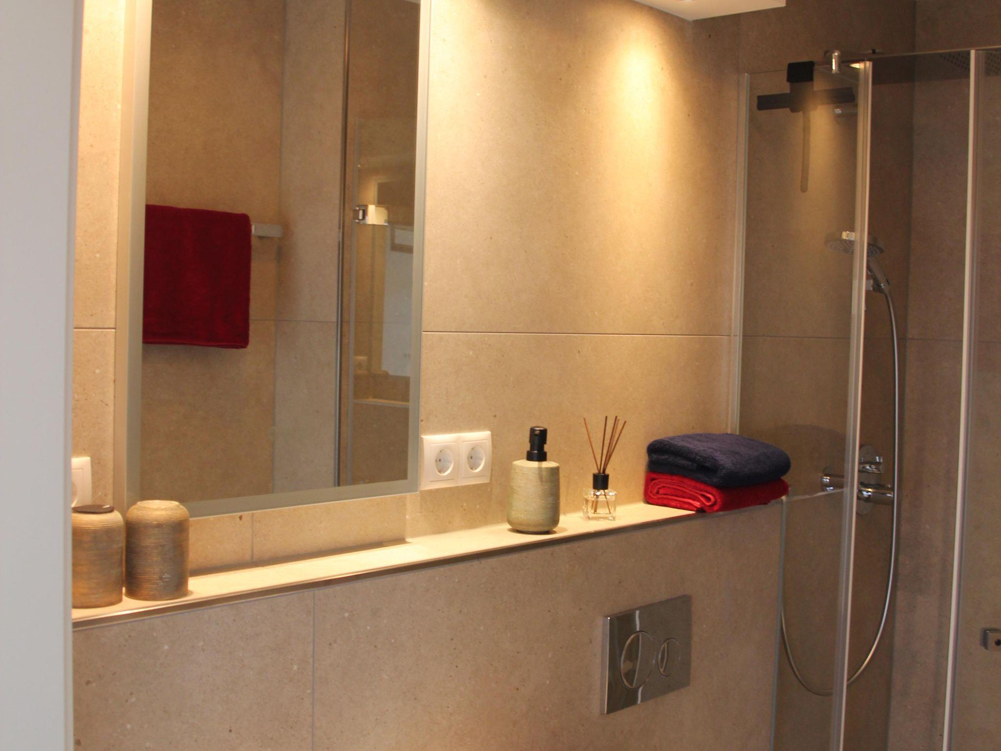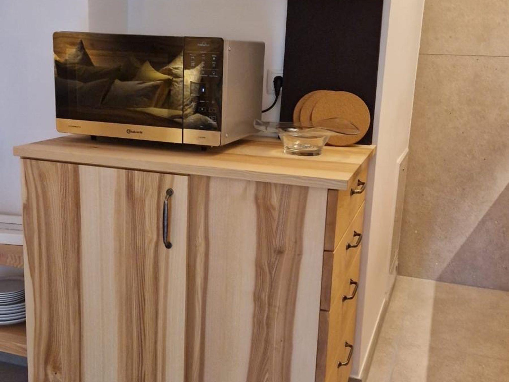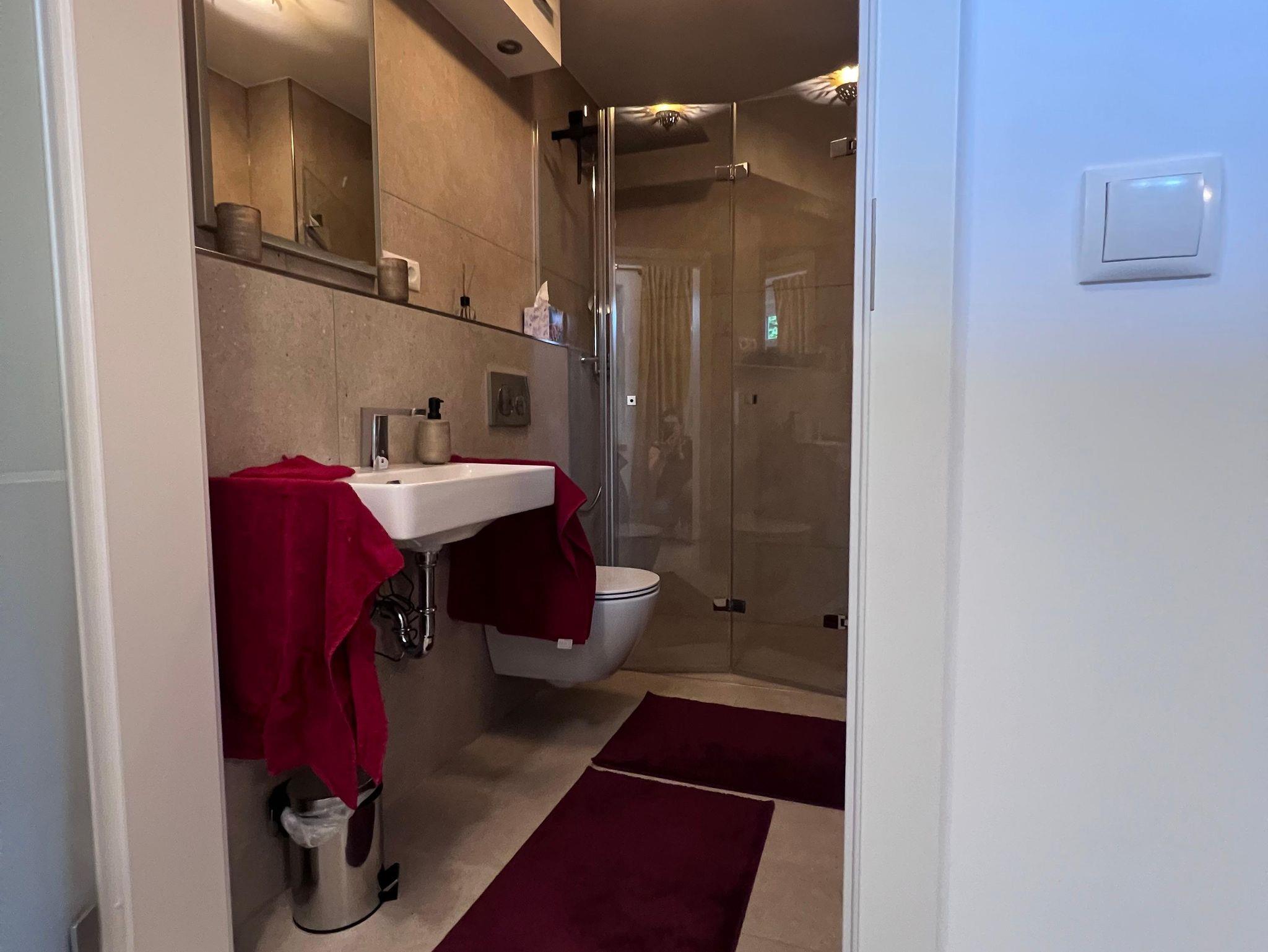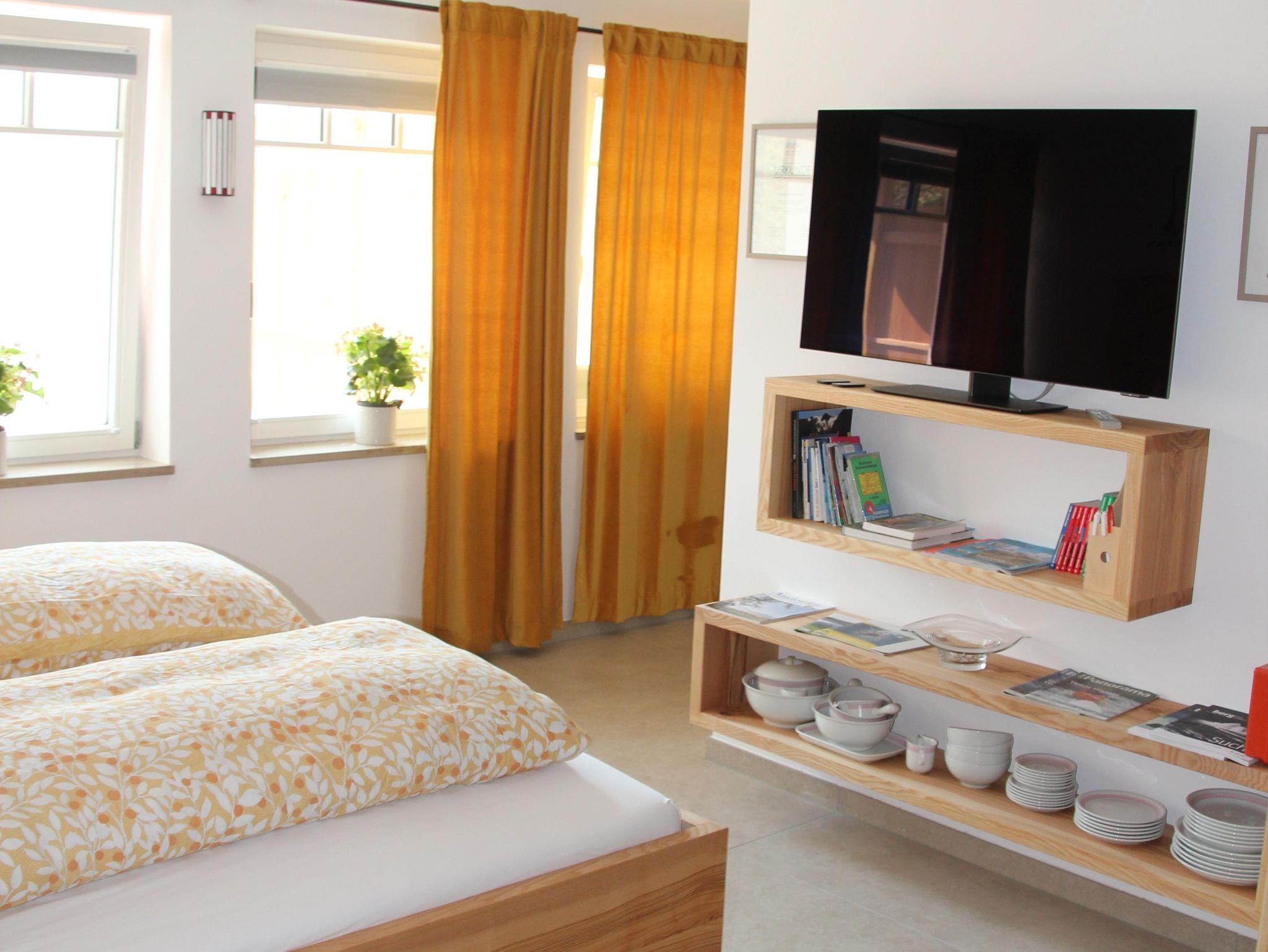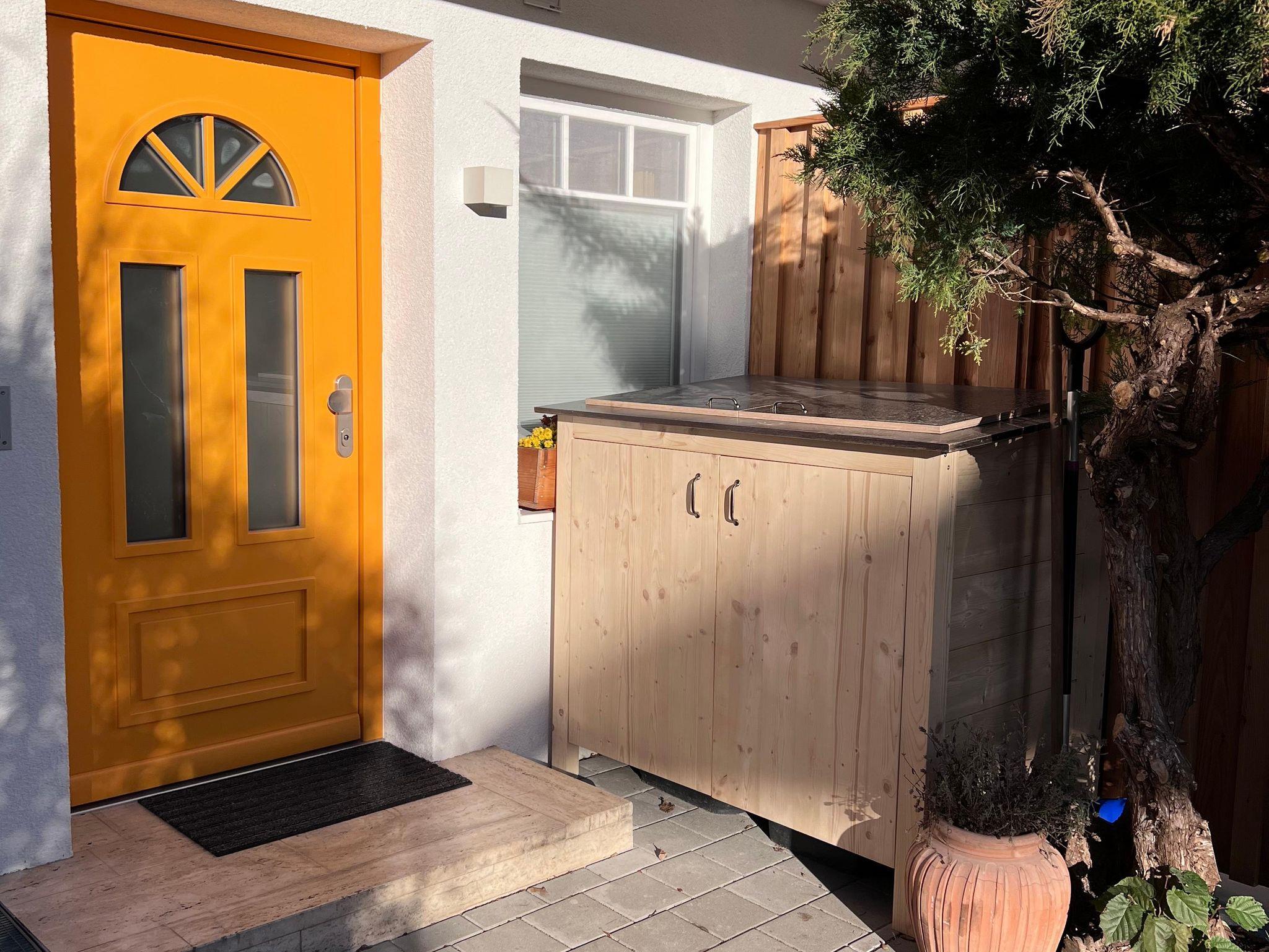 Dazu gibt es separiert, absperrbar, auf ca 7 qm, eine Waschmaschine, einen Trockner, ein Bügeleisen und -Brett sowie ein Waschbecken (gegen eine Gebühr von € 5,00 pro Nutzung). Die Terrasse ist ausgestattet mit einer teils überdachten Sitz-/Essgelegenheit, einer elektrischen Markise sowie 3 Heizstrahlern (mit Strom von der eigenen PV-Anlage). Auch eine Außendusche ist zur Abkühlung im Sommer verfügbar. Ein weiterer, absperrbarer, heller Raum mit gut 11 qm ist, mit Bett, für eine 3. Person, samt eigenem Smart-TV & eigenem Bad, flexibel zubuchbar.