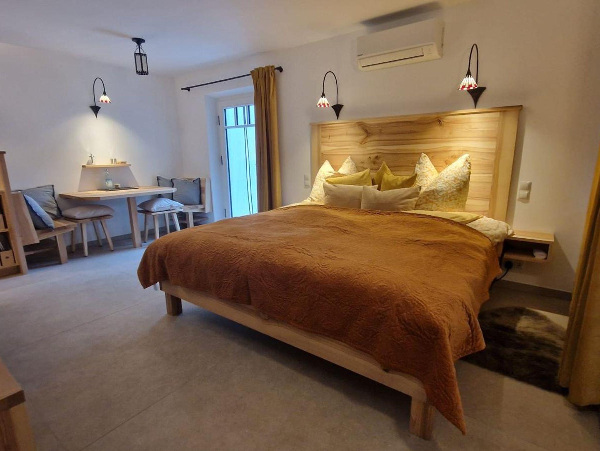 Dazu gibt es separiert, absperrbar, auf ca 7 qm, eine Waschmaschine, einen Trockner, ein Bügeleisen und -Brett sowie ein Waschbecken (auf Anfrage - gegen Gebühr). Die Terrasse ist ausgestattet mit einer teils überdachten Sitz-/Essgelegenheit, einer elektrischen Markise sowie 3 Heizstrahlern (mit Strom von der eigenen PV-Anlage). Auch eine Außendusche ist zur Abkühlung im Sommer verfügbar. Ein weiterer, absperrbarer, heller Raum mit ca 12 qm ist, mit Bett, für eine 3. Person, samt eigenem Smart-TV & eigenem Bad, flexibel zubuchbar.