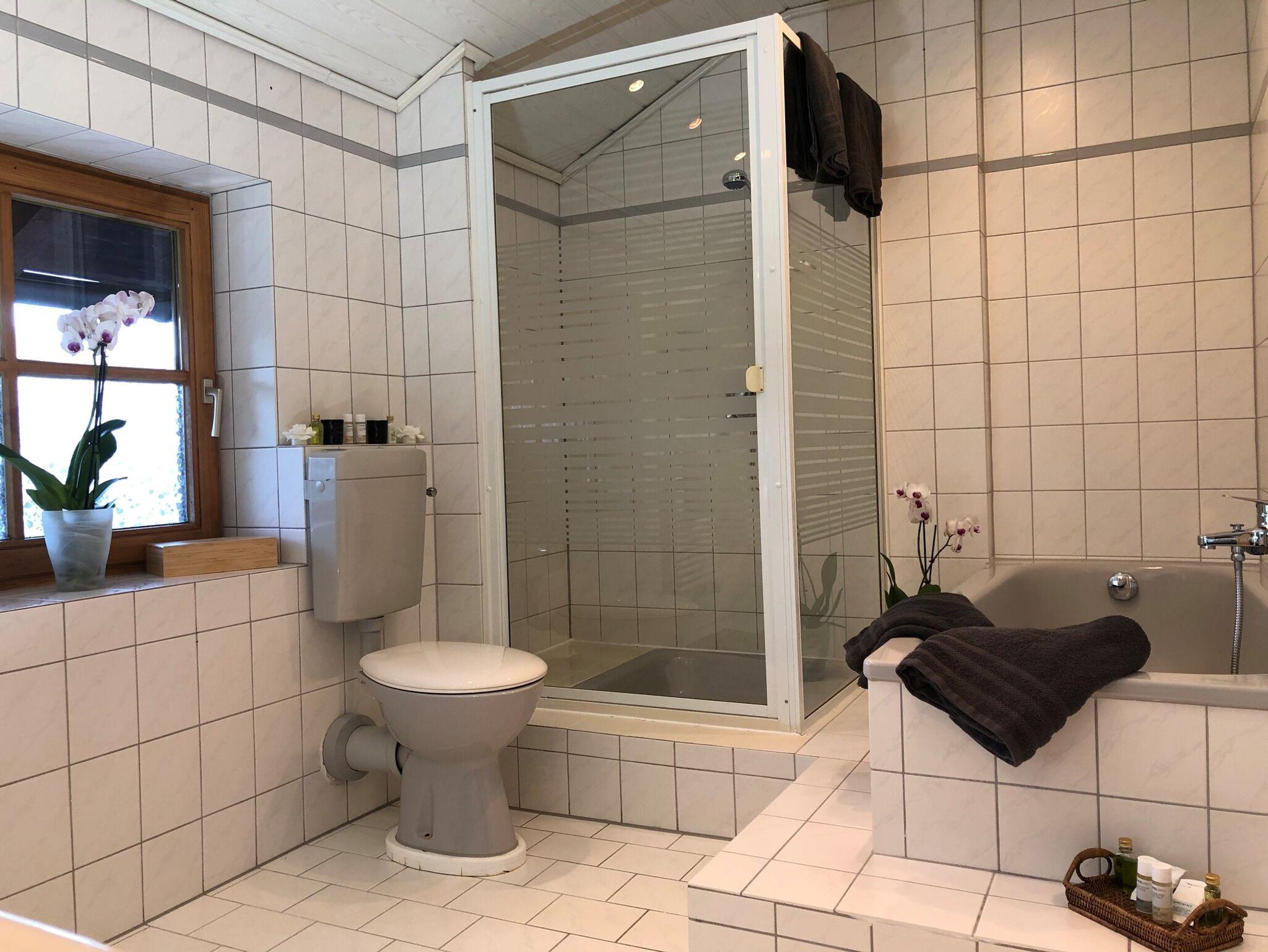 Im geräumigen Bad gibt es einen Fön, zwei Waschbecken, Dusche, Badewanne und Toilette. Im EG gibt es eine zusätzliche separate Toilette.