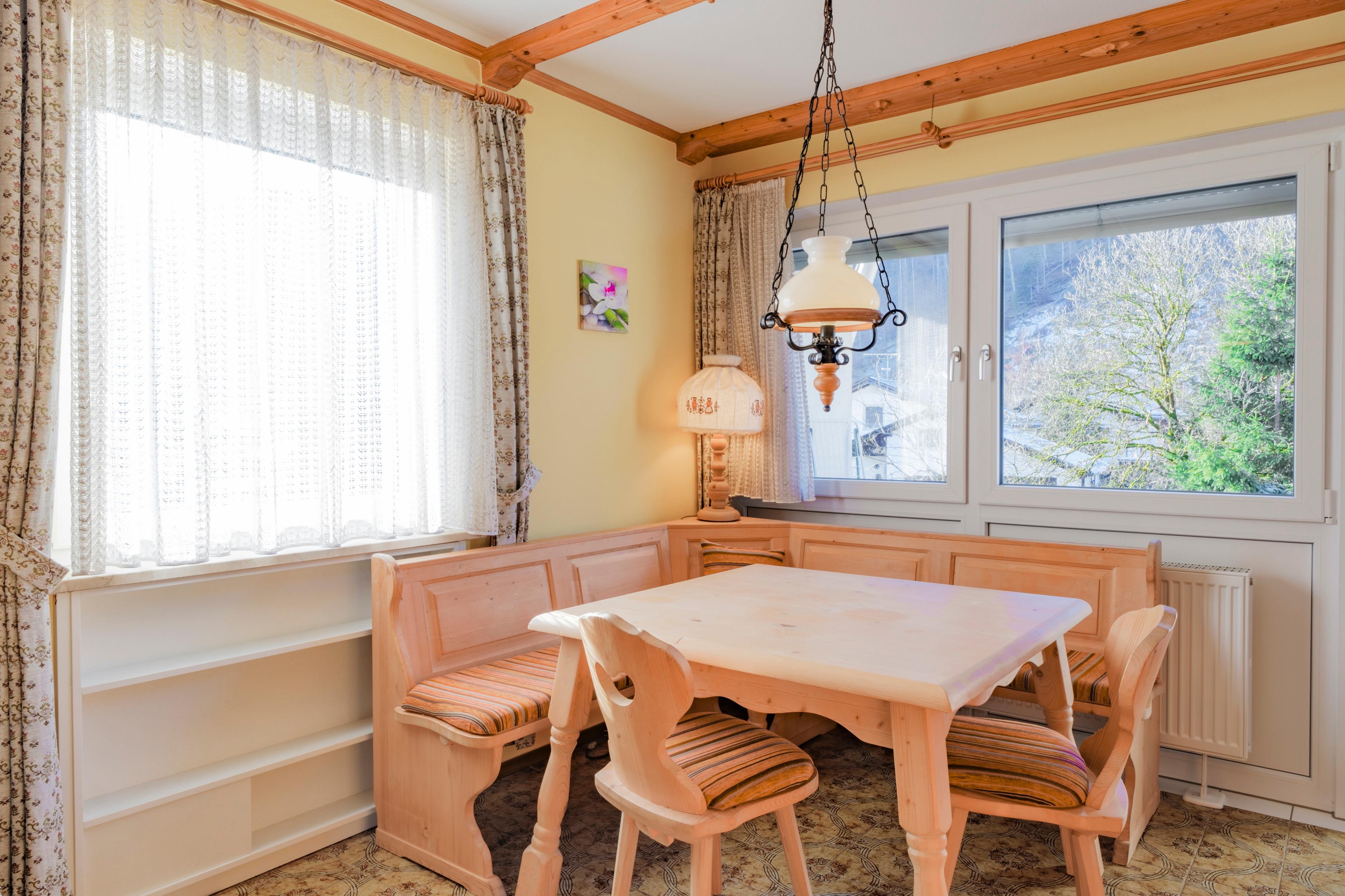 Freuen Sie sich auf einen einladenden Essplatz mit Eckbank, großem Tisch und zwei Stühlen - bei guter Aussicht auf die
