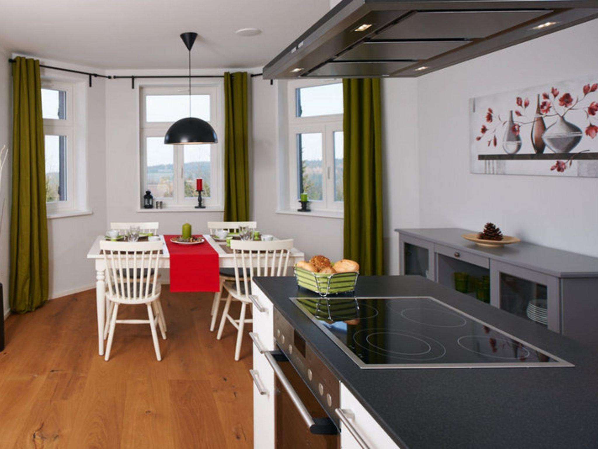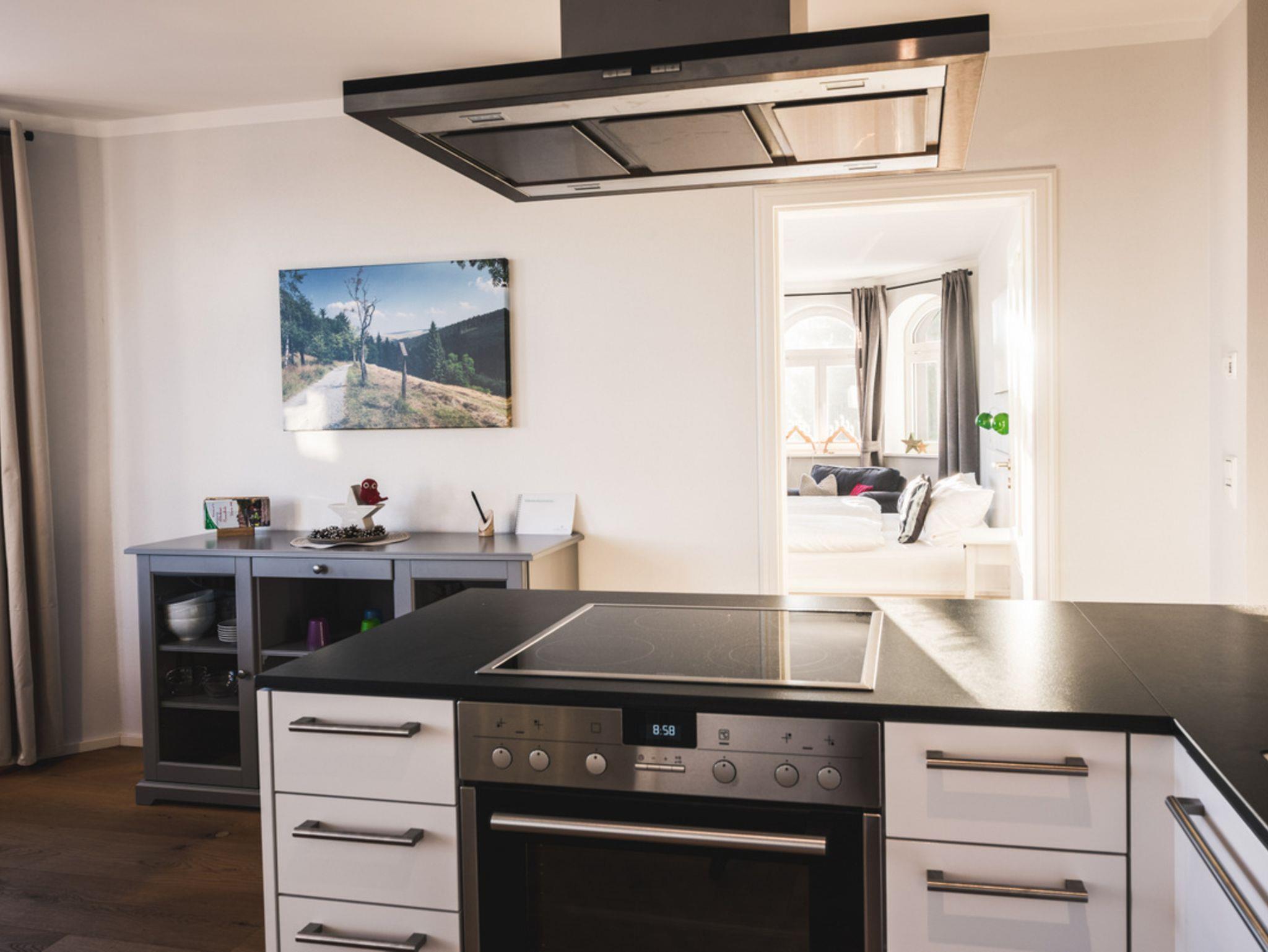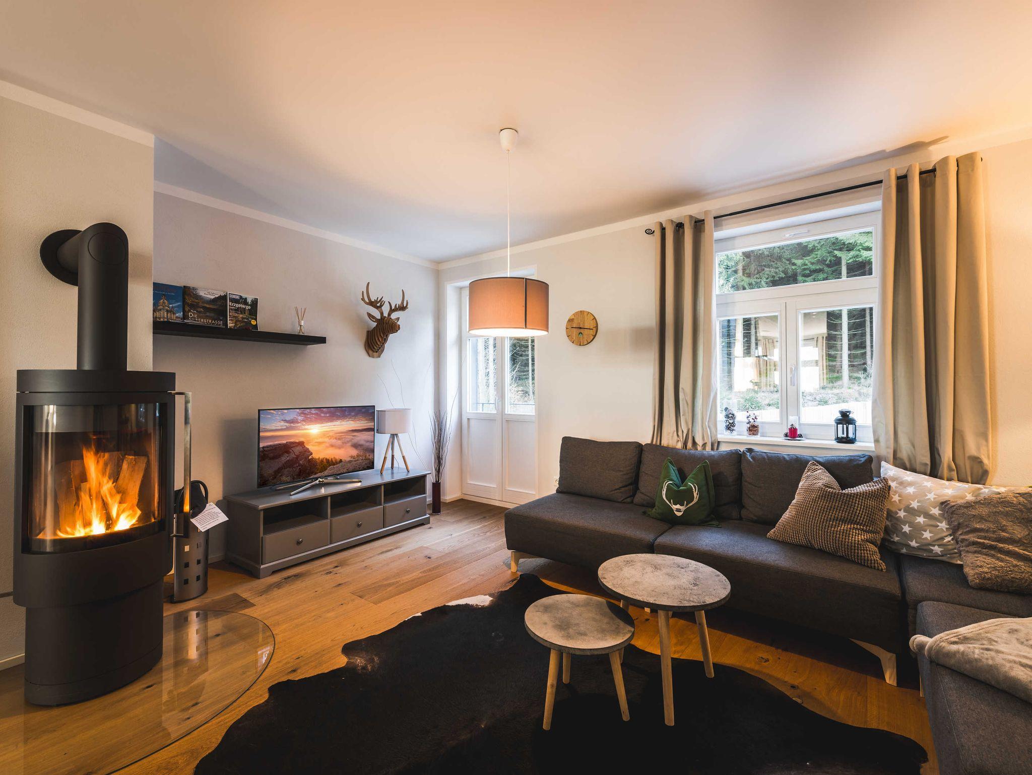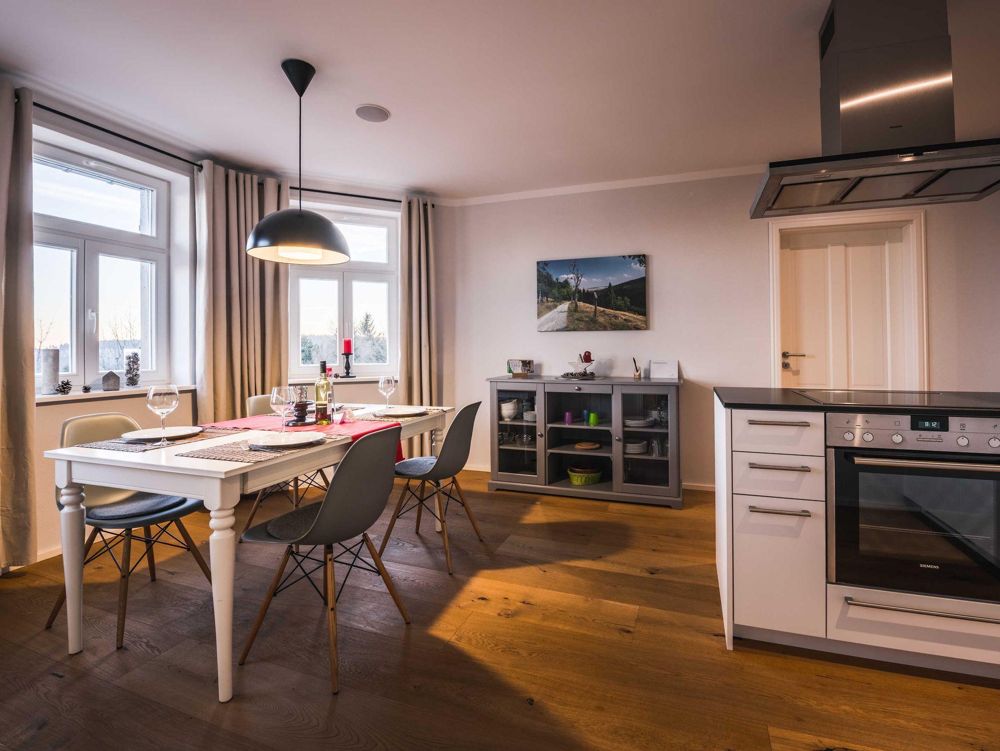 Dieses Ferienappartement ist purer Wohngenuss und bietet auf insgesamt 95 Quadratmetern viel Platz zum gemeinsamen Spielen mit den Kindern. Der gemütliche Wohnbereich mit Kamin grenzt an den großzügig und offen gestalteten, modernen Koch- und Essbereich. Von hier aus können Sie den Ausblick über das Erzgebirge Richtung Elbtal genießen und unter der großzügigen farblich beleuchteten Wellnessdusche alle Sorgen des Alltags vergessen. Die zwei getrennten Schlafzimmer mit Doppelbett sind Rückzugsort für jeden und laden zum Entspannen und Träumen ein.