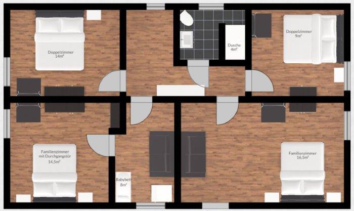 Das Haus ist 2024 komplett neu renoviert und mit neuen Möbel eingerichtet.Es gibt 5 Dopplz.1 davon ist im Erdgeschoss, die anderen 4 Zimmer im 1.Stock.Wir haben davon 1 Familienzimmer mit einer Durchgangstür ,mit Kinderbett + Wickeltisch und einem Schlafsofa.Sie finden im Erdgeschoss und im 1.Stock jeweils 1 kleines Badezimmer (je 4m²) mit einer begehbaren Dusche und WC. Eine Fußbodenheizung gibt es im Bad im 1.Stock.Ein schönes helles Esszimmer mit Sitzgelegenheit bis zu 12 Pers. Im Esszimmer finden Sie auch ein Sofa und einen TV vor.Bei schlechten Wetter haben wir im Erdgeschoss einen großen Aufenthaltsraum (ca.40m²) mit Kicker, Spielecke, großen Sofa, TV, Getränkekühlschrank.Natürlich eine voll ausgestattete neue Küche, mit Durchgangstür zum Esszimmer.Das Highlight, Sie haben die Möglichkeit von Küche + Esszimmer + Aufenthaltsraumauf die Terrasse zu kommen.Im eigenen Garten haben die Kinder viel Platz zum spielen, und die Eltern können entspanntihren Kaffee genießen oder in die Fasssauna gehen.Einen Grillplatz haben wir natürlich auch.Es soll an nichts fehlen !Schließlich möchten wir ja, dass Sie bei uns Ihre schönste Zeit des Jahres haben.Ihre Familie Hochreuther
