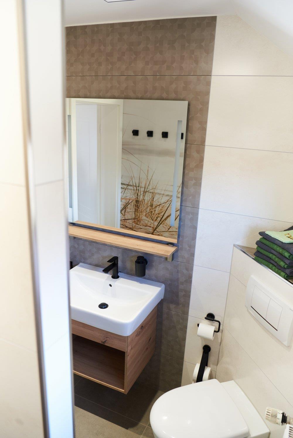 Badezimmer mit Fenster, Dusche, Handtuchtrockner, WC