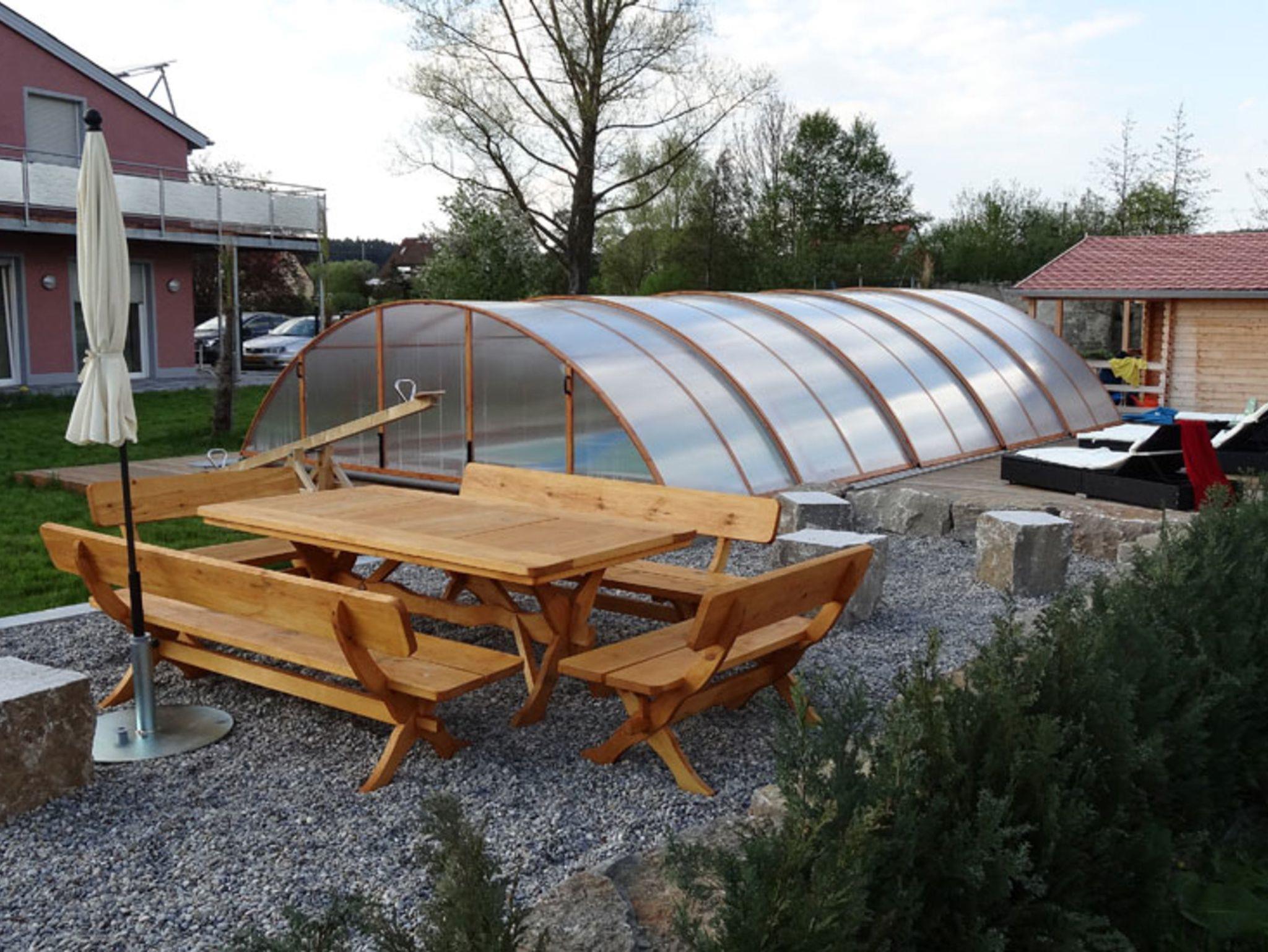 An unserem 8x4 Meter großen Pool mit Sprungbrett und Schiebehalle (Nutzung auch bei schlechtem Wetter von Mai - Ende September möglich) können Sie im Sommer ein paar schöne Stunden in der Sonne genießen.