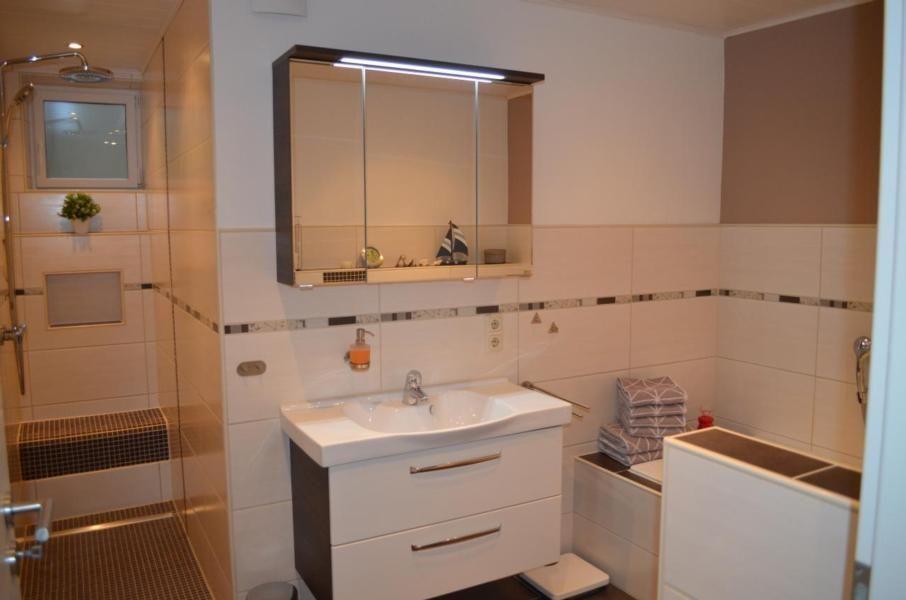 - A modern bathroom equipped with a large bathtub, shower with hand and rain shower and bench as well as a stool. Towels and hairdryer are provided.