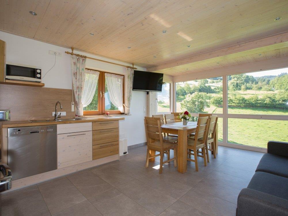 Das Ferienhaus liegt rechts unterhalb des Hofes und hat im Erdgeschoss und im Obergeschoss jeweils eine Ferienwohnung für 6 Personen.Die Wohnung im Erdgeschoss des Ferienhauses besteht aus 3 Schlafzimmern, einem Bad mit Dusche und WC, einer Wohnküche mit Panoramafenster, einem Balkon und einer Terasse. Sie ist rollstuhlgerecht. Ausstattung der Schlafzimmer:Ein Schlafzimmer ist mit einem Doppelbett, das zweite mit 2 Einzelbetten, das dritte Schlafzimmer ist ein Wohn-/ Schlafzimmer und mit einer komfortablen Schlafcouch (mit Matratzenauflage ? 1,60 x 2,00 m) ausgestattet. Zusätzlich gibt es die Möglichkeit in der Wohnküche eine komfortable Schlafcouch (1,84 x 1,96 m) auszuziehen und Platz für eine weitere erwachsene Person zu schaffen. Für die Schlafcouch haben wir zusätzlich eine Matratzenauflage für eine gute Schlaf-Qualität.