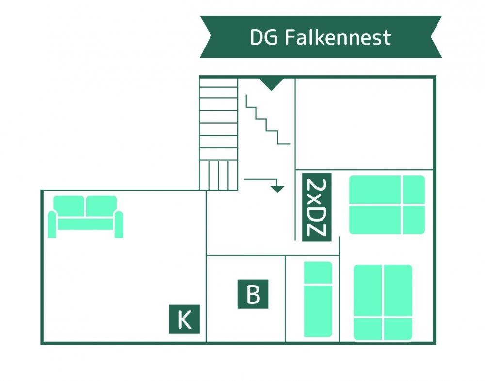 Das wunderschöne Leibgedinghaus mit den Ferienwohnungen "Falkennest", "Adlerhorst" und "Auerhahn" befindet sich links oberhalb des Breigenhofes in freier Lage mit südwestlicher Ausrichtung.Die Ferienwohnung im Dachgeschoss des Leibgedinghauses ist 70 m² groß und nicht barrierefrei. Sie hat ein geräumiges Schlafzimmer mit einem Doppelbett und einem Einzelbett (1,40 x 2 m), ein kleines Zimmer mit einem Kinderbett (0,90 x 2 m), ein Bad mit Dusche und WC. Außerdem verfügt Sie über einen geräumigen Wohn- und Essbereich mit einer Leseecke und einer komfortablen, ausziehbaren Schlafcouch (Liegefläche 1,60 x 2 m). Vom Dachfenster des Schlafzimmers haben Sie einen herrlichen Blick ins Harmersbachtal bis zur Burgruine Geroldseck. Die Wohnung verfügt über einen großen Balkon (2,5 x 7,5 m) mit Blick ins Grüne.