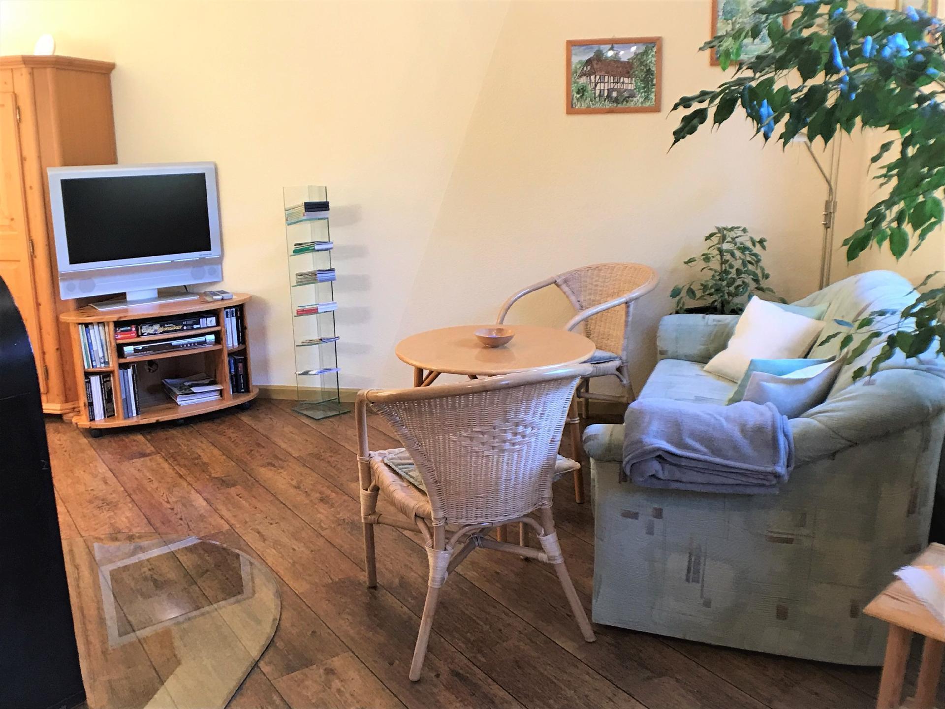 The spacious, bright one-room flat offers a feel-good atmosphere on 40 square metres on the ground floor. A cosy seating area in the living area invites you to relax, where you will also find a satellite TV with DVD and CD player. The "Anna" flat is particularly popular with guests because it is only a few steps to the garden and in winter you can spend cosy evenings in front of the wood-burning stove. The extensive information material about the Harz Mountains will make it easier for you to plan your excursions and board games, books, DVDs and CDs will keep you entertained on long winter evenings or a rainy day. The living area is adjoined by the sleeping area with double bed (180 x 200). You will find plenty of storage space for your holiday clothes in the wardrobe and chest of drawers. On the other side of the living area you will find the open-plan kitchen with dining table and 4 chairs, kitchenette with ceramic hob (2 plates), fridge with freezer compartment, coffee machine, toaster, kettle and microwave. The kitchenette naturally also contains sufficient crockery, glasses, cutlery, pots and pans.the flat has a shower room with daylight window, shower, toilet and washbasin, which is accessible from the small hallway.the flat is lockable directly in the entrance area and of course has central heating in addition to the wood-burning stove.