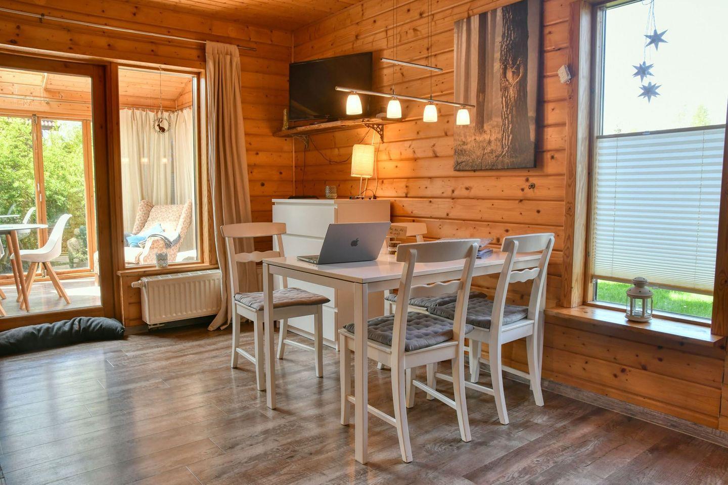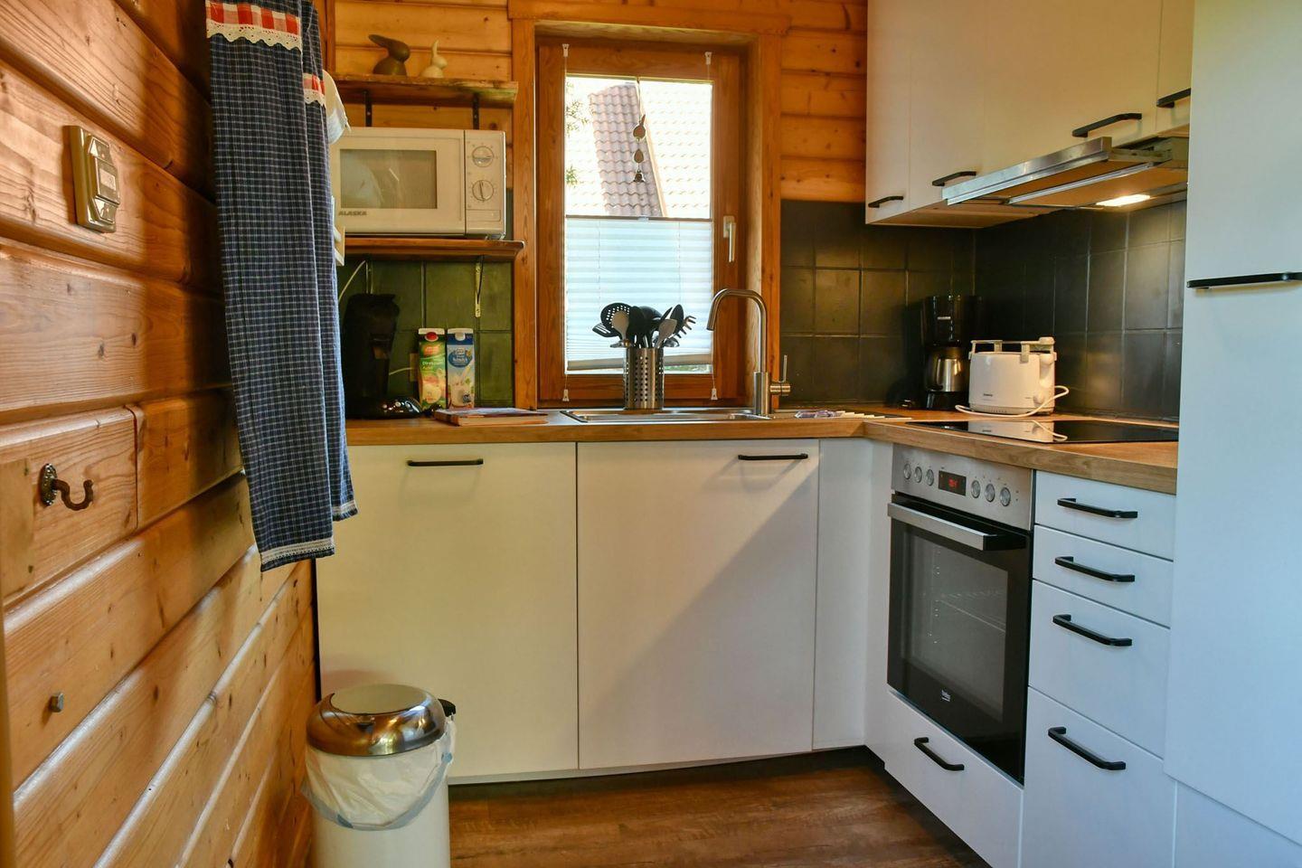 Das 64 m² große Ferienhaus begrüßt Sie mit einem offenen Wohn- und Essbereich, der gemütlich und einladend gestaltet ist. Die große Fensterfront sorgt für viel Tageslicht und einen herrlichen Blick auf die umliegende Natur. Hier finden Sie ein bequemes Sofa und einen Essbereich, an dem Sie mit der Familie oder Freunden schöne Abende verbringen können. In der voll ausgestatteten Küche sind Ihrer Kreativität beim Kochen keine Grenzen gesetzt. Sie bietet nicht nur einen Ceranfeldherd und einen Backofen, sondern auch eine Spülmaschine, einen Kühlschrank mit Gefrierfach, eine Mikrowelle und viele nützliche Küchenutensilien.