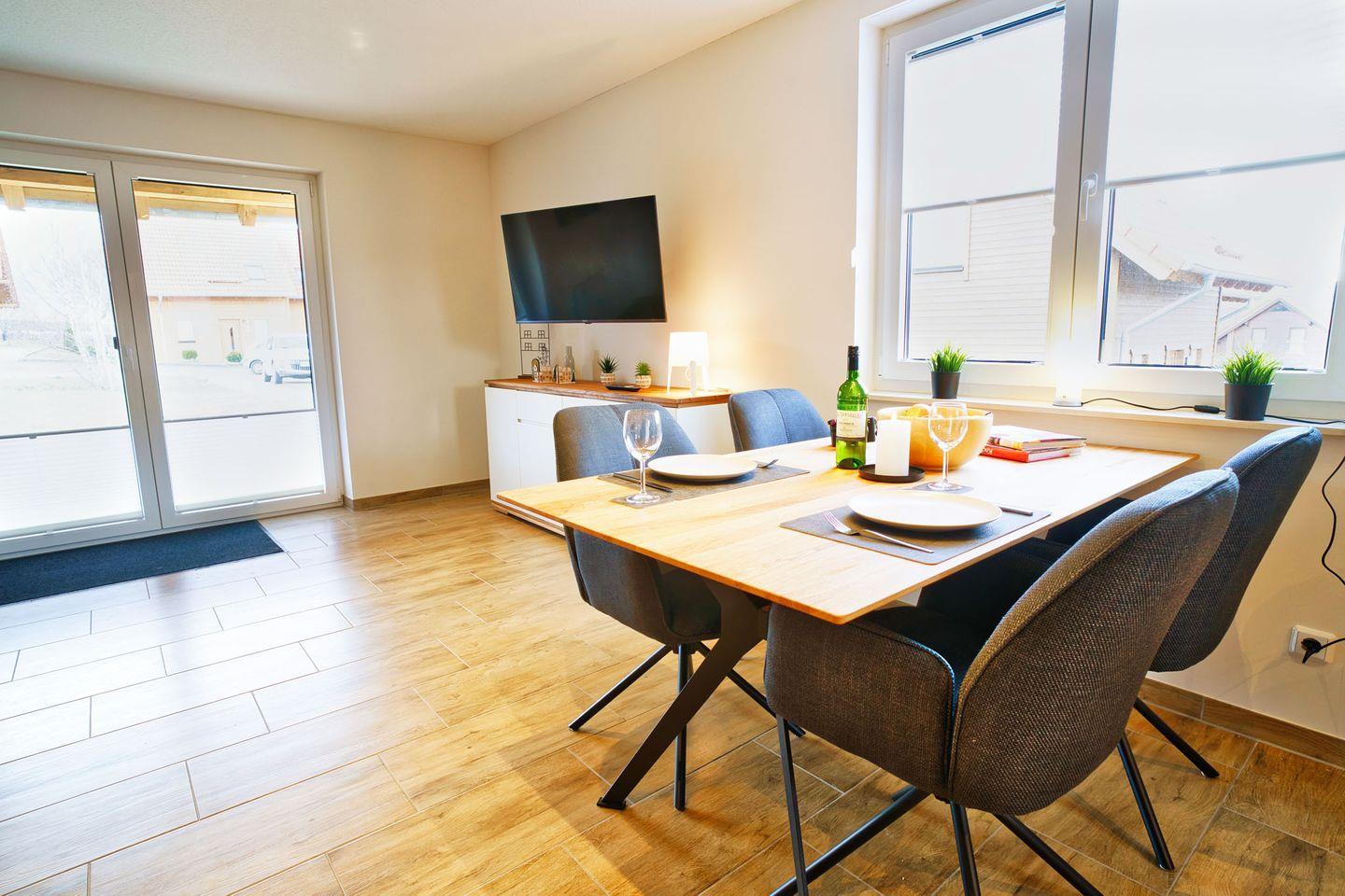 Das lichtdurchflutete Ferienhaus besticht durch ihre moderne offene Küche, die direkt in den großzügigen Wohnbereich integriert ist. Hier können Sie gemeinsam kochen, essen und entspannen. Die voll ausgestattete Küche mit Cerankochfeld, Backofen, Kühlschrank, Gefrierschrank, Geschirrspüler, Mikrowelle, Kaffeemaschine und Toaster lässt keine Wünsche offen. Genießen Sie Ihre Mahlzeiten am Esstisch oder auf der überdachten Terrasse, die mit einem gemütlichen Gartenblick einlädt. Die Terrasse ist zudem der perfekte Ort, um den Tag bei einem Glas Wein ausklingen zu lassen oder sich im Grillbereich kulinarisch auszutoben.