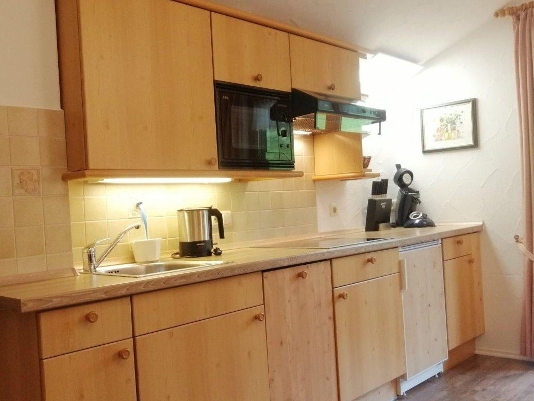 Die Küchenzeile ist ausgestattet mit einer Senseo Kaffeepadmaschine, Spülmaschine, einem 4-Platten-Cerankochfeld, Wasserkocher, Toaster, Mikrowelle sowie Ess- und Kochgeschirr.