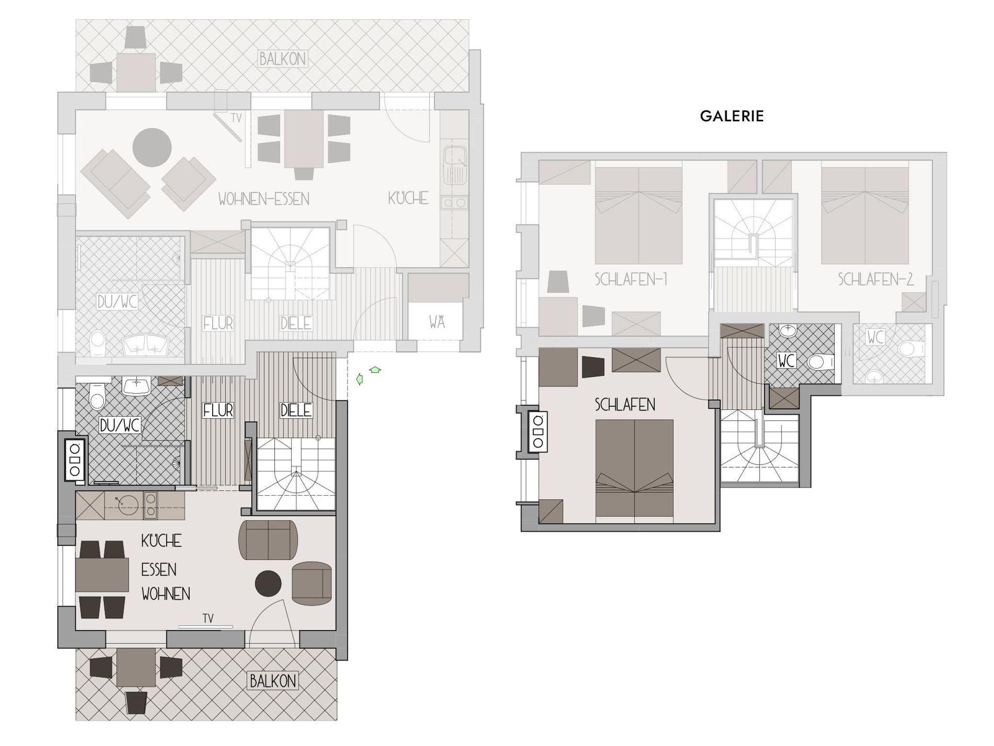 Die Ferienwohnung EINS bietet auf 42 m² Platz für 2 Personen und einen schönen West-Balkon mit Ausblick auf den Wannenkopf und die Hörnerkette.