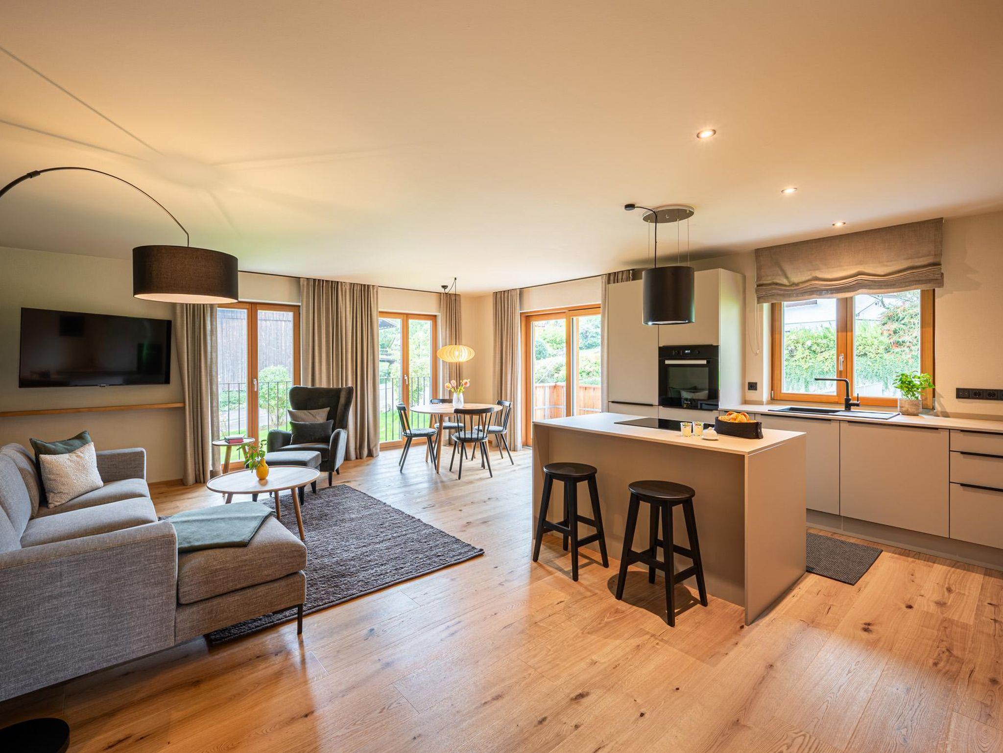 Die offene Wohnküche ist mit Spülmaschine, Kühlschrank, Herd und Backofen voll ausgestattet – ideal für unkomplizierte Mahlzeiten oder ausgedehnte Kochabende. Direkt angeschlossen ist der gemütliche Wohnbereich mit Sofa, Sessel und TV – genau richtig zum Zurücklehnen nach einem erlebnisreichen Tag.