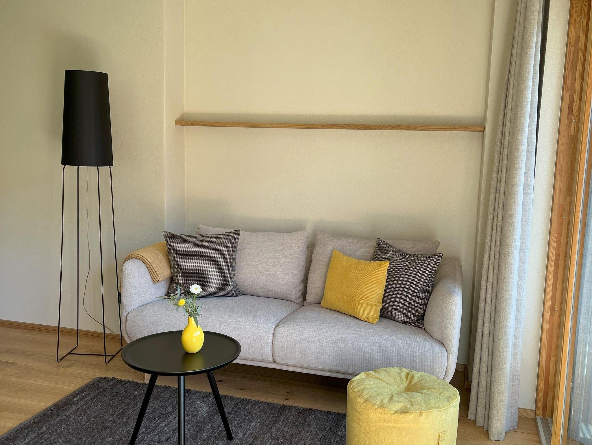 Die offene Wohnküche ist mit Spülmaschine, Kühlschrank, Herd und Backofen ausgestattet – alles da für ein entspanntes Frühstück oder ein selbstgekochtes Abendessen. Der Esstisch für zwei lädt zum Verweilen ein, während das Sofa im Wohnbereich der perfekte Ort zum Abschalten ist.