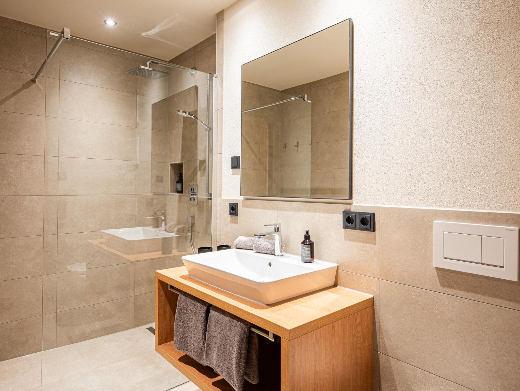 Das separate Schlafzimmer mit einem gemütlichen Doppelbett (1,80 m) sorgt für erholsame Nächte. Das Bad ist modern und praktisch mit Dusche, Waschbecken und WC ausgestattet.