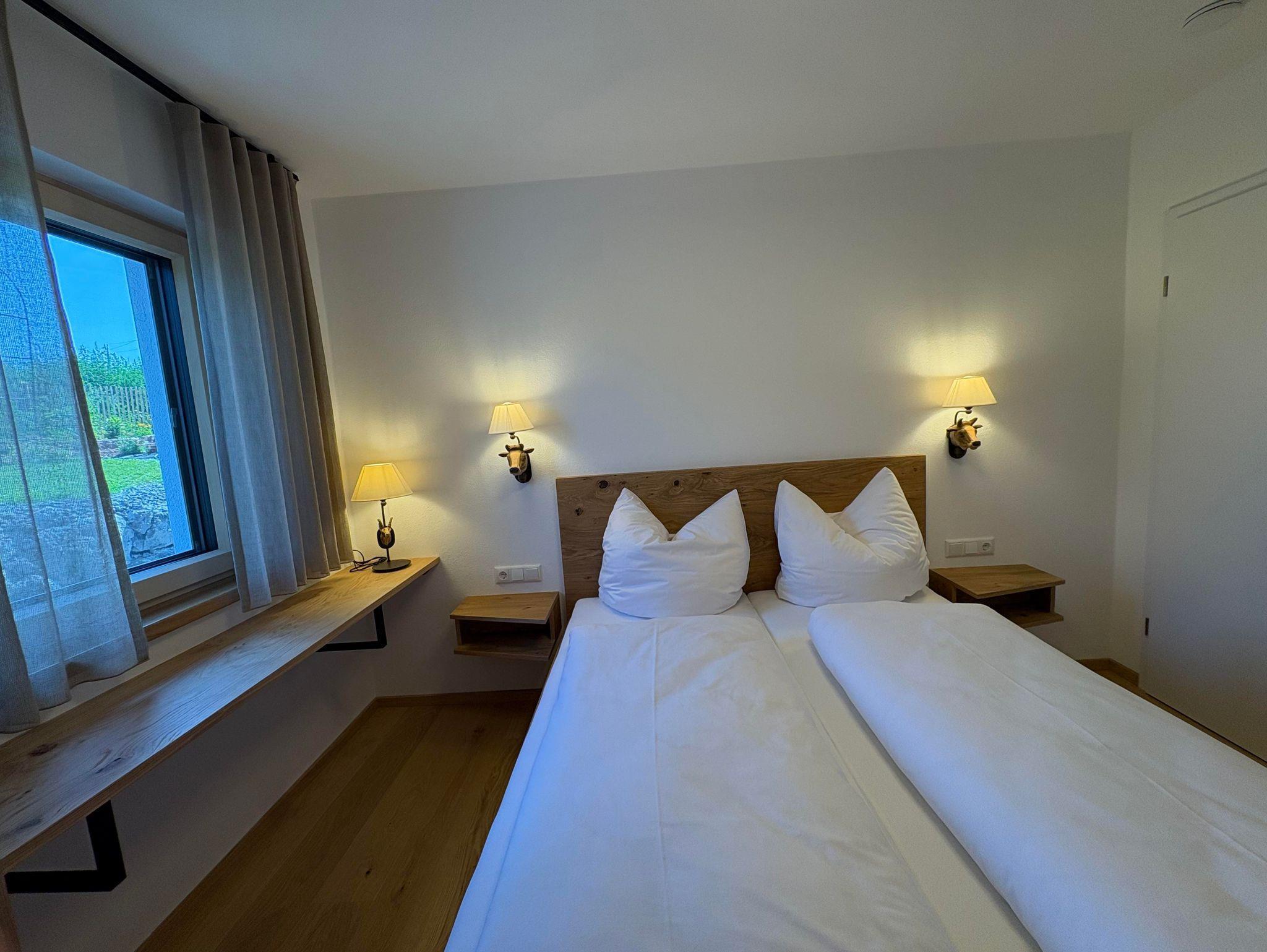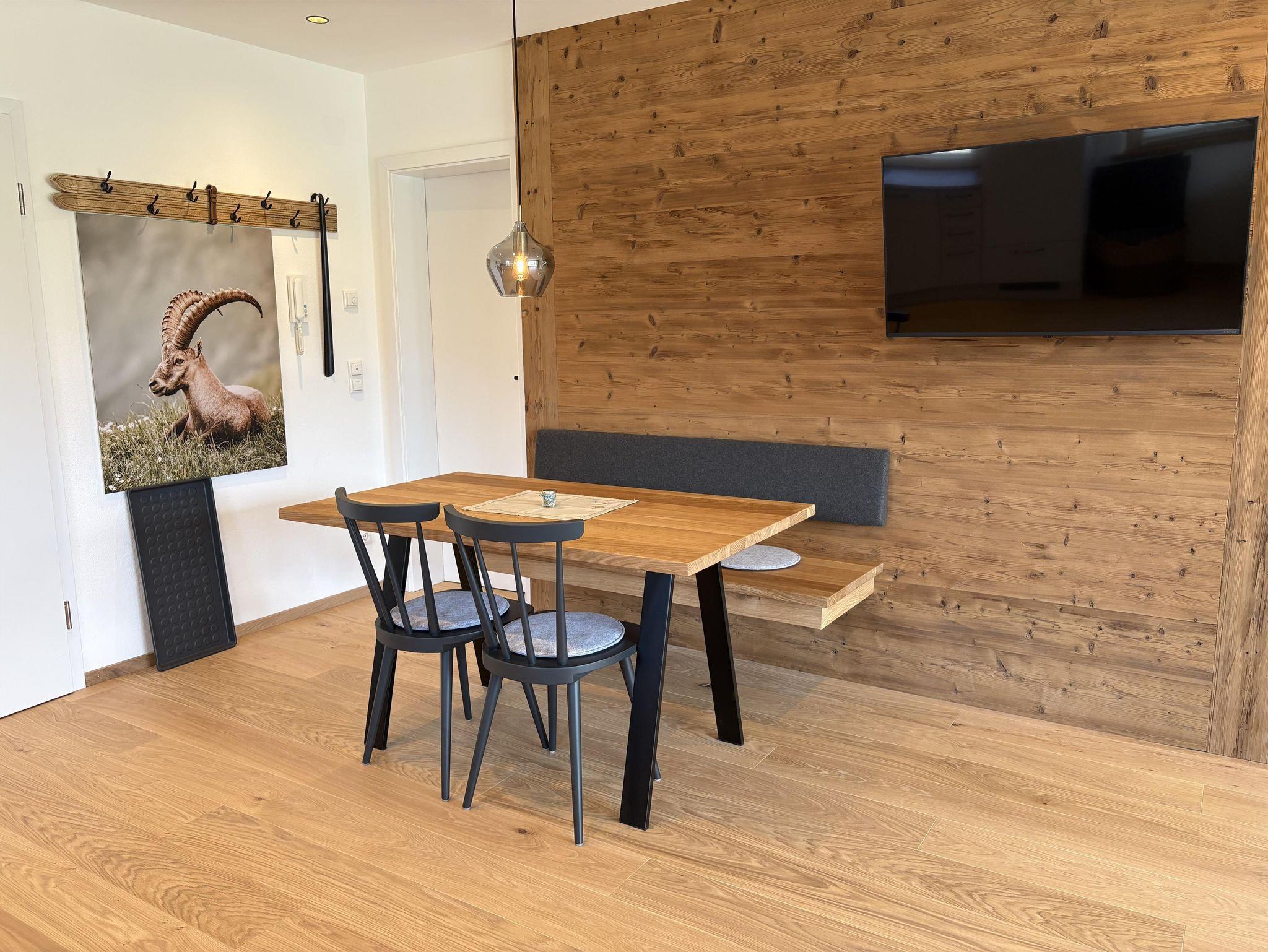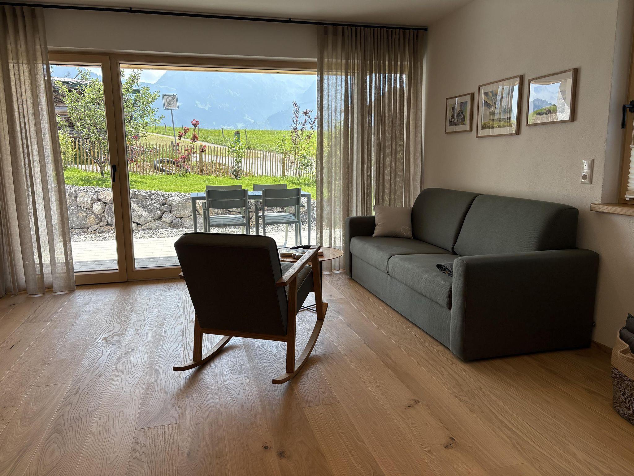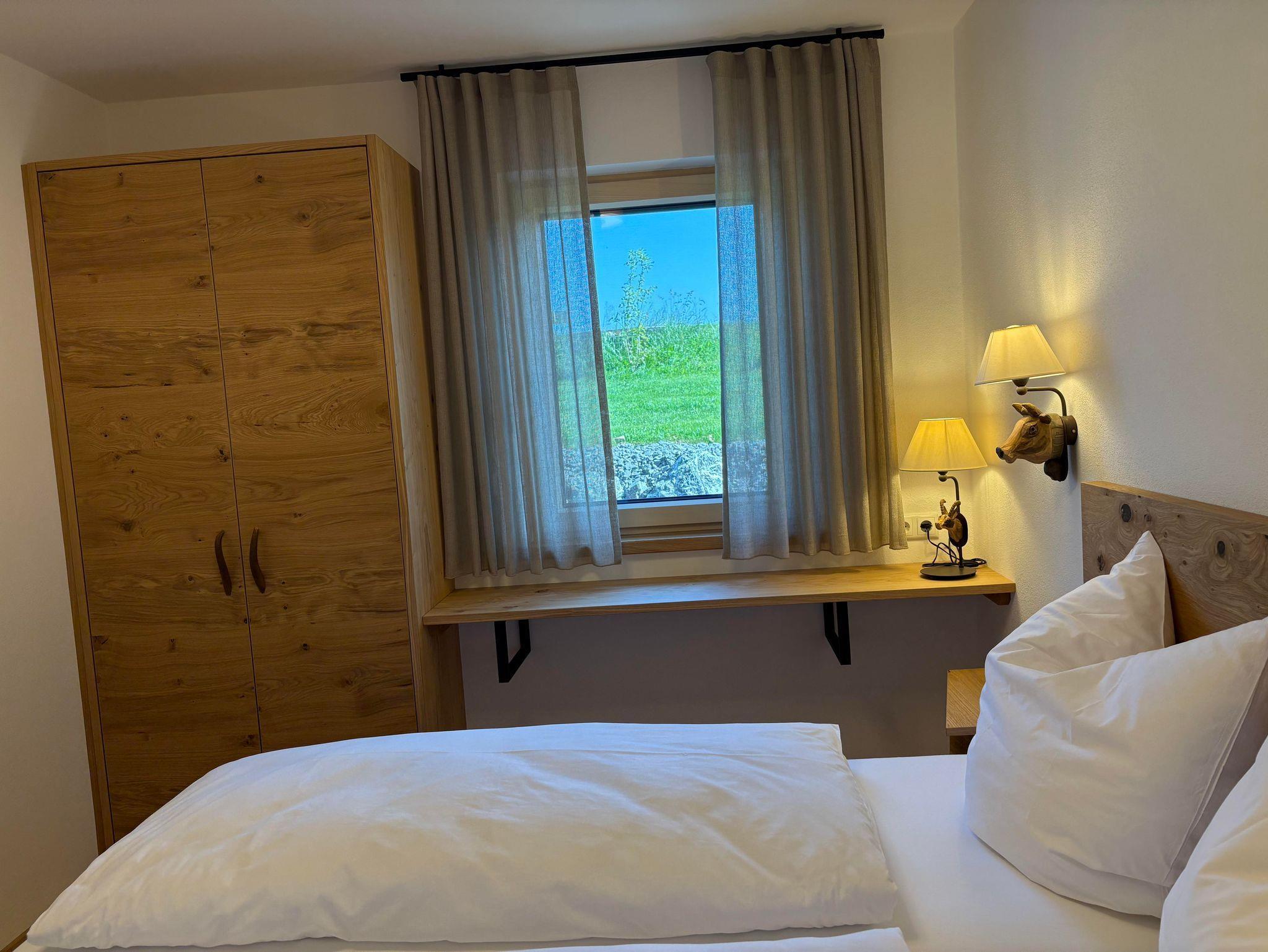 Die Ferienwohnung Salbei bietet auf 60 m² Platz für bis zu 4 Personen und befindet sich im Erdgeschoss. Sie verfügt über zwei separate Schlafzimmer, sowie ein modernes Badezimmer mit Walk-In Dusche. Der offene Wohn-/Essbereich umfasst eine gut ausgestattete Küche mit Kaffeemaschine, Geschirrspüler, Backofen und Wasserkocher. Zudem gibt es Fernsehr, kostenloses WLAN sowie zwei Schreibtische als Homeoffice-Möglichkeit. Eine Fußbodenheizung, ein Safe und ein Parkplatz am Haus sorgen für zusätzlichen Komfort. Ein Kinderbett ist ebenfalls auf Anfrage erhältlich. Die Ferienwohnung ist eine Nichtraucherwohnung und bietet mit ihrer Süd-/Ostterrasse einen wunderschönen direkten Bergblick.