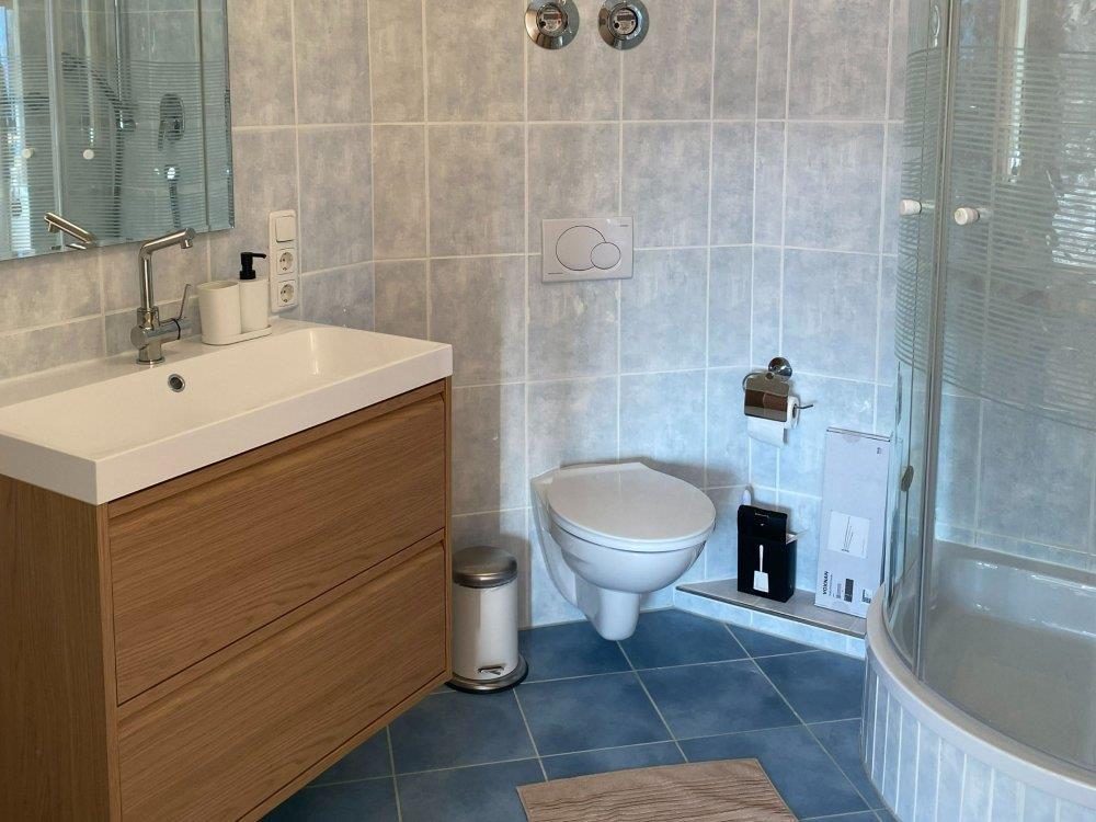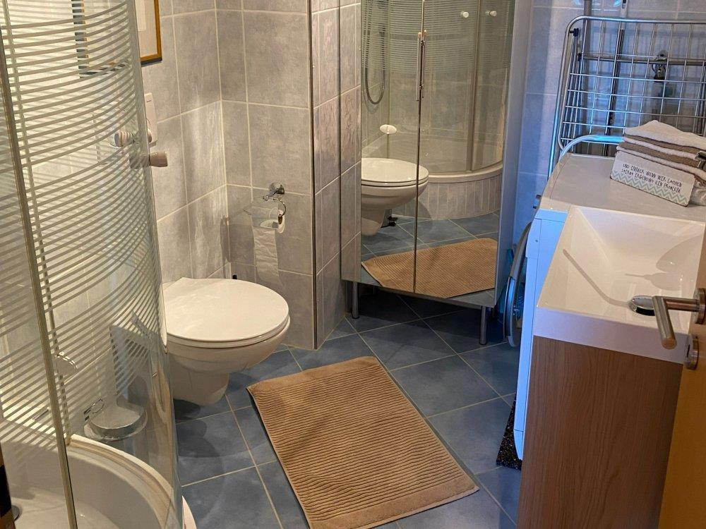 Dusche, Handtuchtrockner, Waschbecken, WC, WC und Dusche