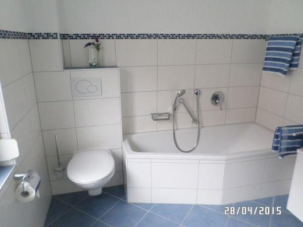Das moderne Badezimmer mit Wanne, Dusche und Fenster rundet das schöne Ambiente ab.