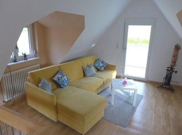 Das geräumige und freundlich eingerichtete Wohnzimmer befindet sich im Obergeschoss des Ferienhauses. Hier erwartet Sie ein gemütliches Ecksofa,. Ein TV-Gerät sorgt für die Unterhaltung am Abend. Auch ein Balkon steht Ihnen hier zur Verfügung.