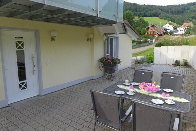 Im Aussenbereich können Sie auf der Terrasse bei einem ausgiebigen Frühstück so richtig entspannen und den Ausblick auf die schönen Wiesen und Wälder genießen.