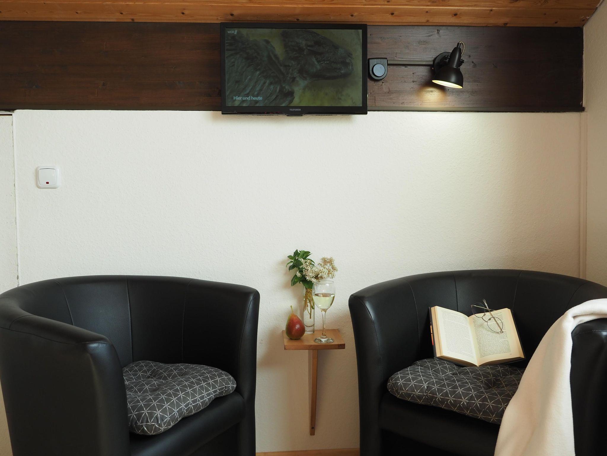 Die Wohnung bietet Ihnen eine gemütliche Essecke aus massivem Eichenholz, ein helles Schlafzimmer mit Lesesessel im Obergeschoss und ein modernes Badezimmer mit Dusche und WC.