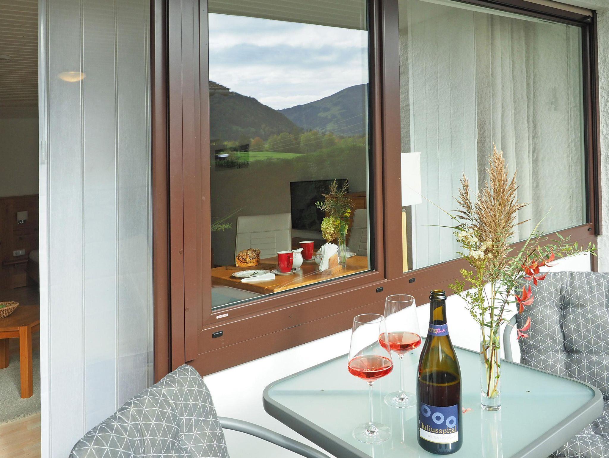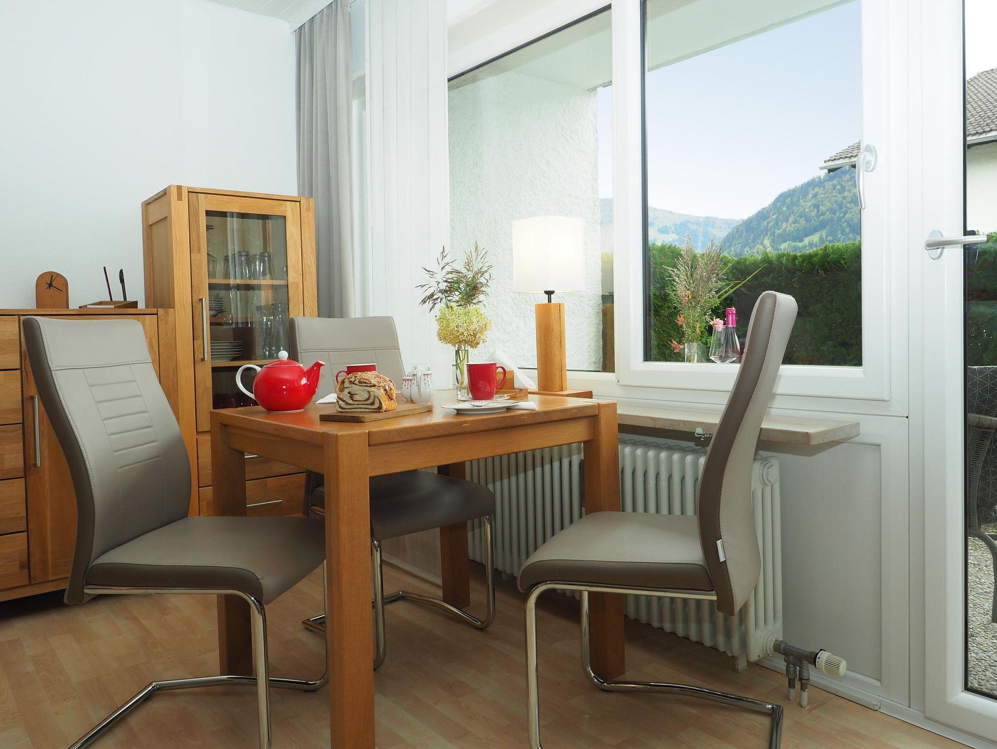 Freuen Sie sich auf einen Essplatz am Fenster mit Blick auf die Allgäuer Berge. Genießen Sie die Aussicht auf den Hochgrat vom Sofa oder von der Terrasse aus.