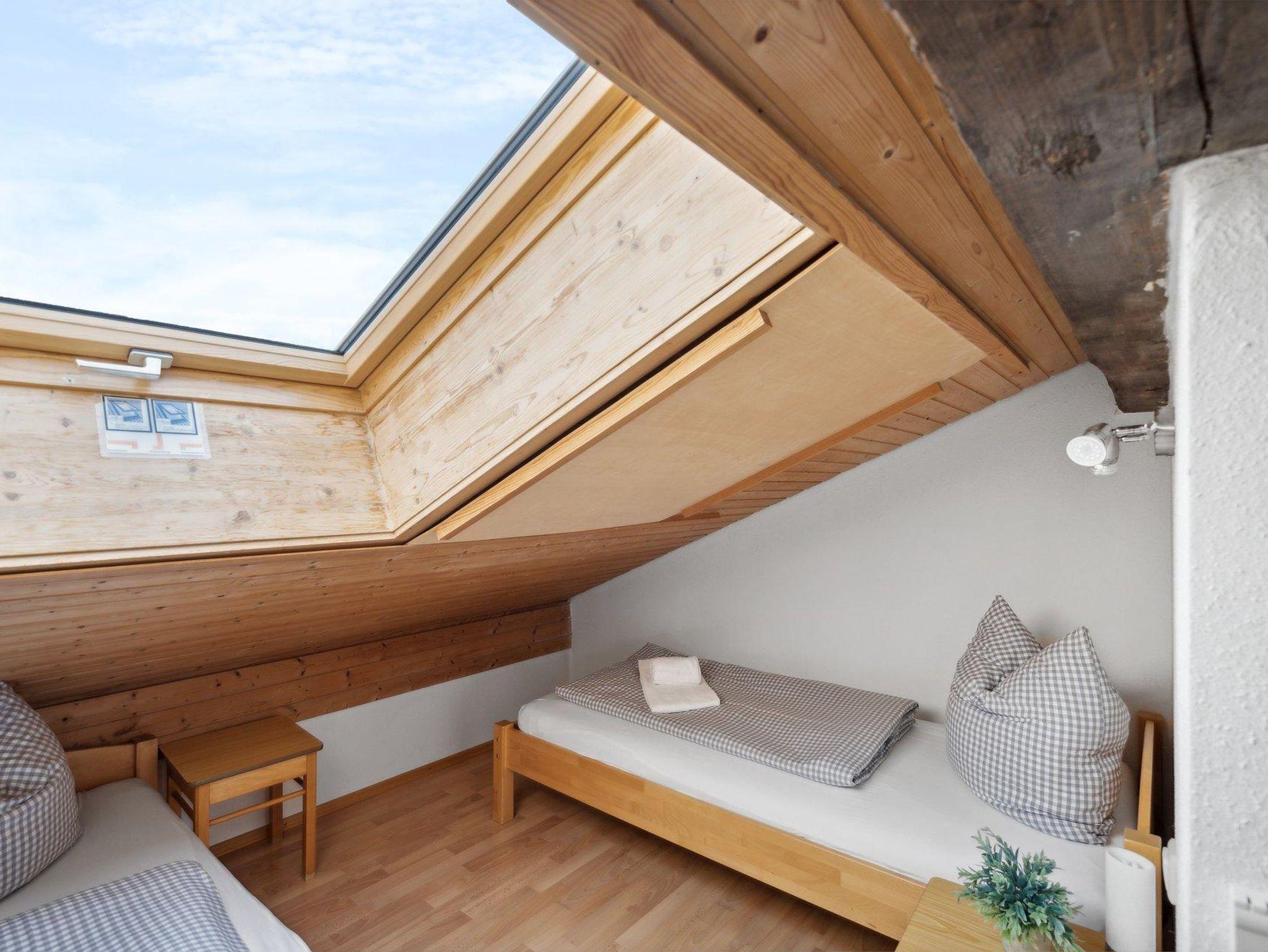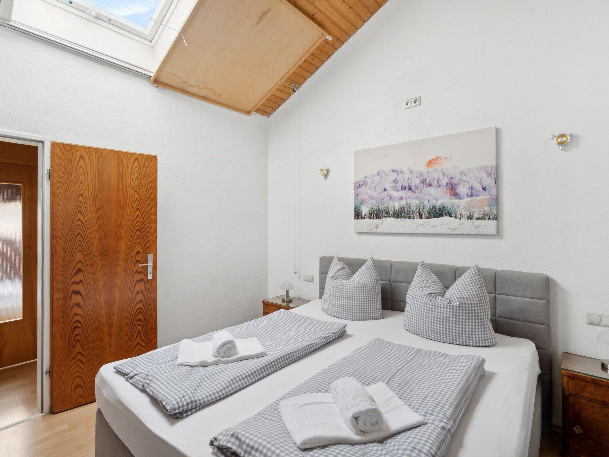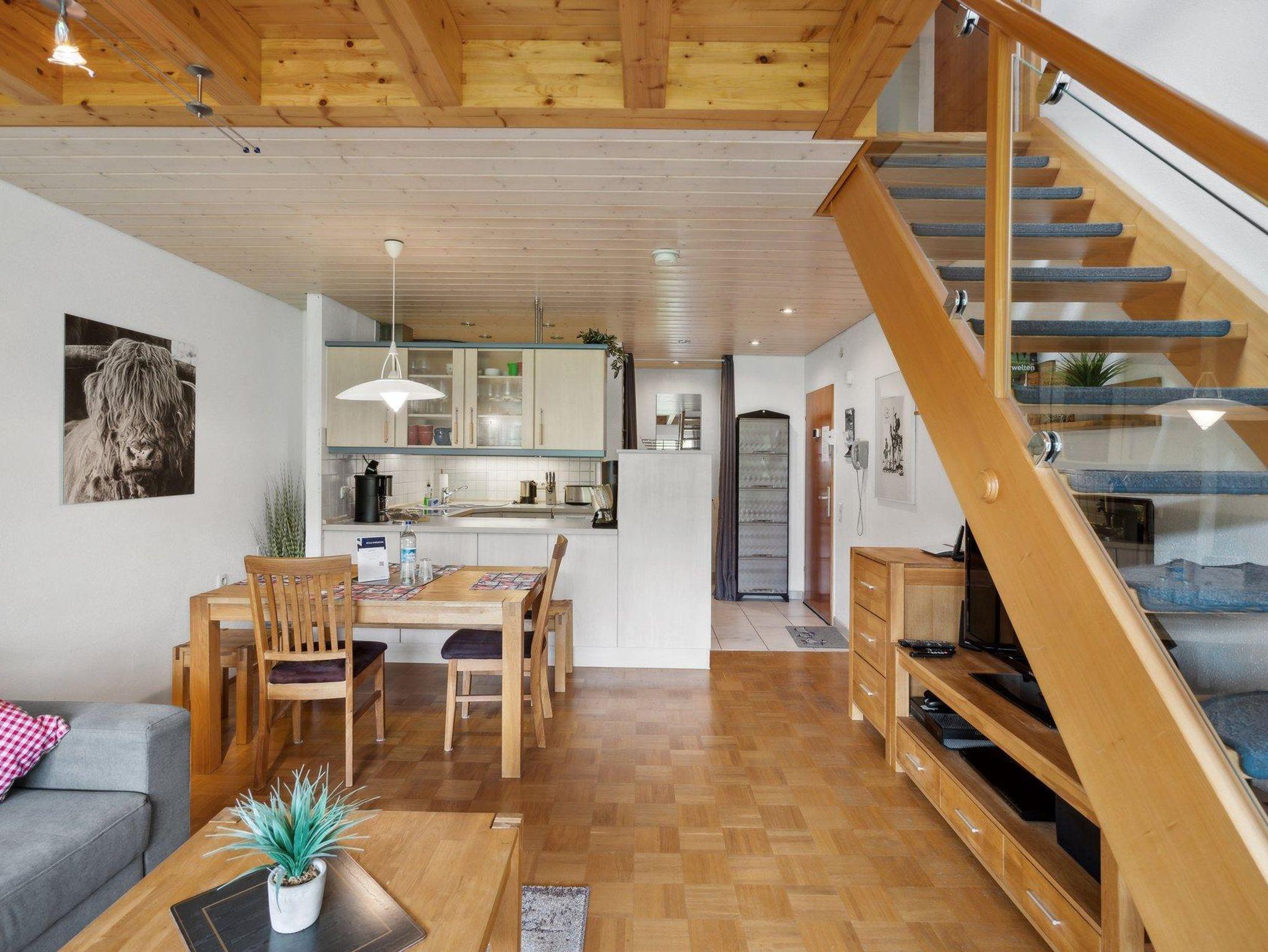 Genießen Sie unsere geräumige Wohnung über zwei Etagen mit ca. 60 qm Wohnfläche. Im oberen Geschoss erwarten Sie ein gemütliches Schlafzimmer mit einem Doppelbett für zwei Personen und ein kleines niedriges (Dachschräge) Zimmer mit zwei Einzelbetten. Das moderne Badezimmer mit Dusche und WC bietet höchsten Komfort.