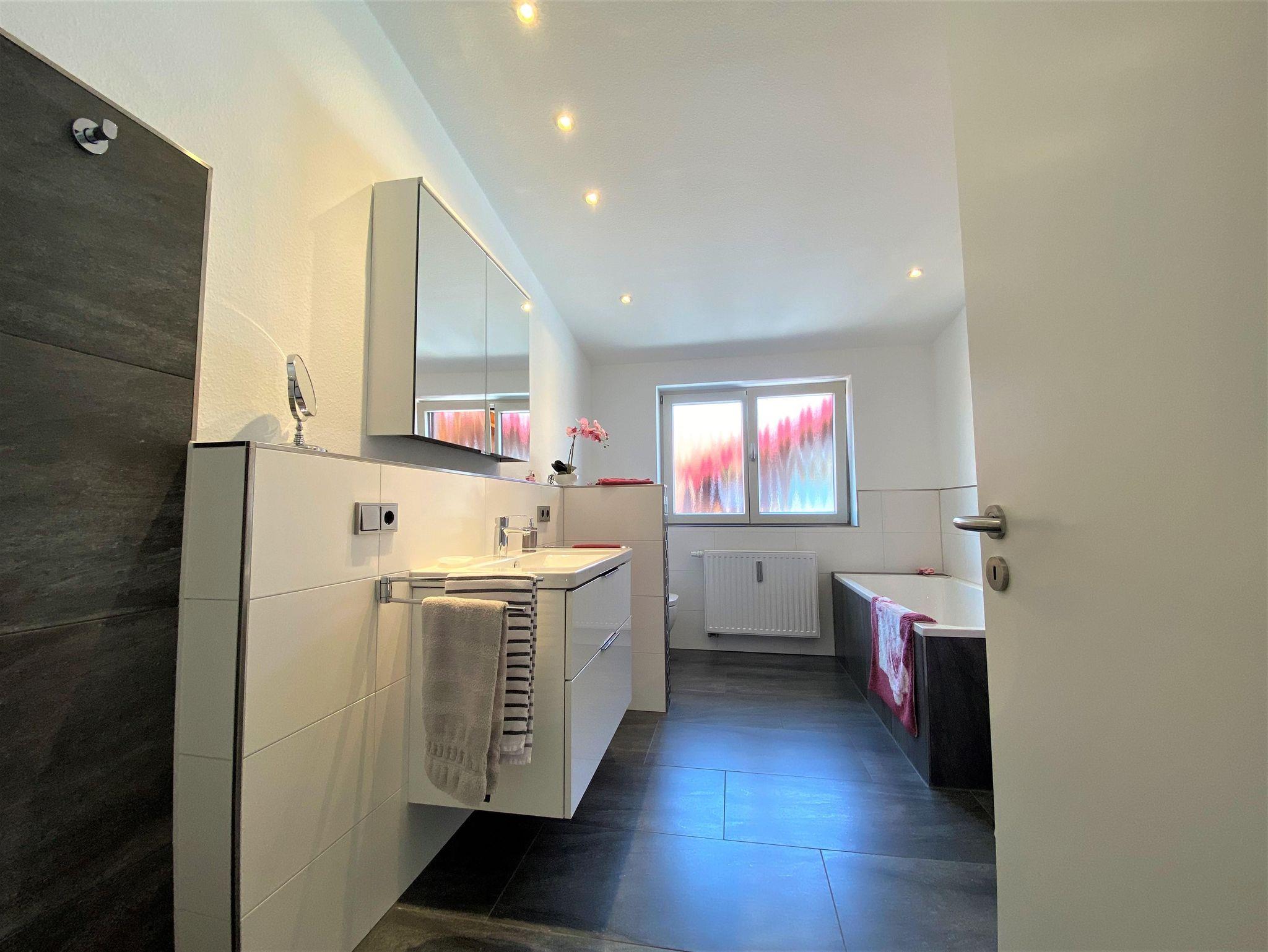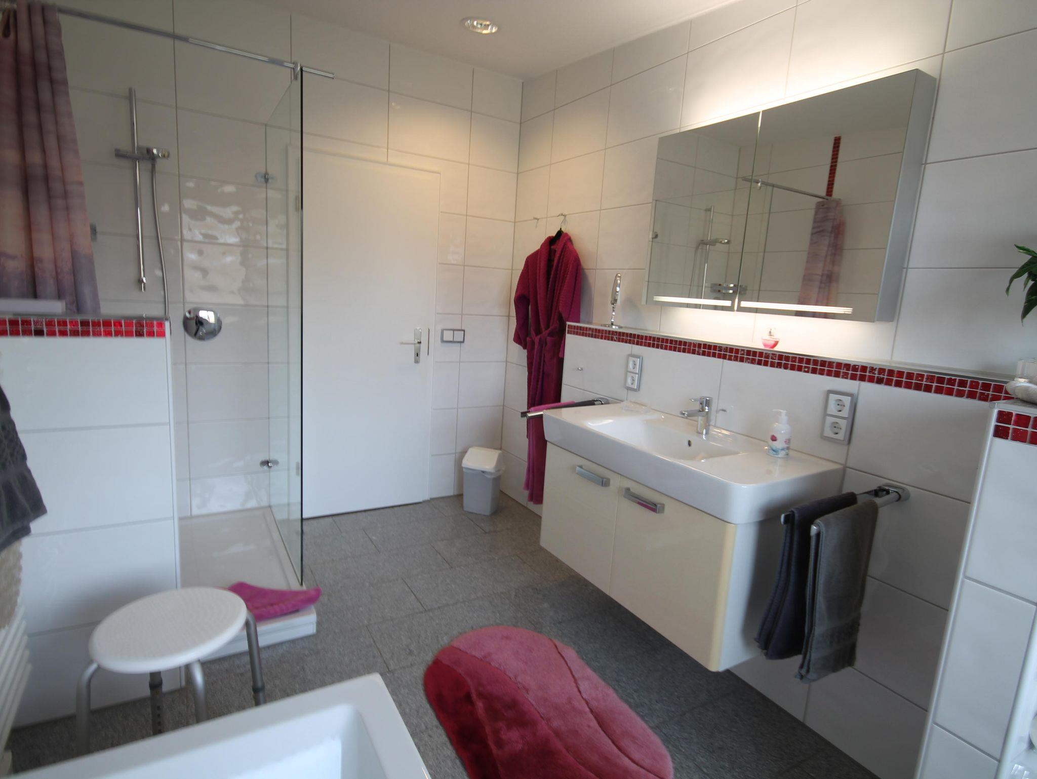 Bad mit großer flacher Duschwanne, Badewanne, Toilette, Waschtisch, Spiegelschrank, Ablage und Handtuchwärmer. Diele mit Garderobe und Schuhschrank.