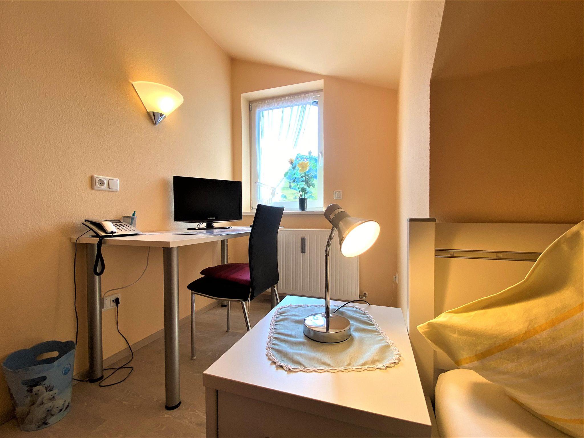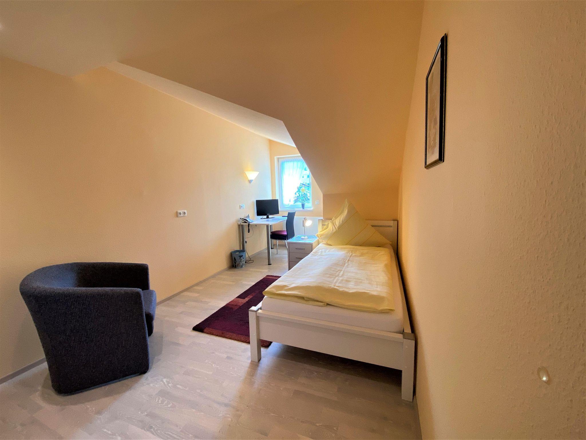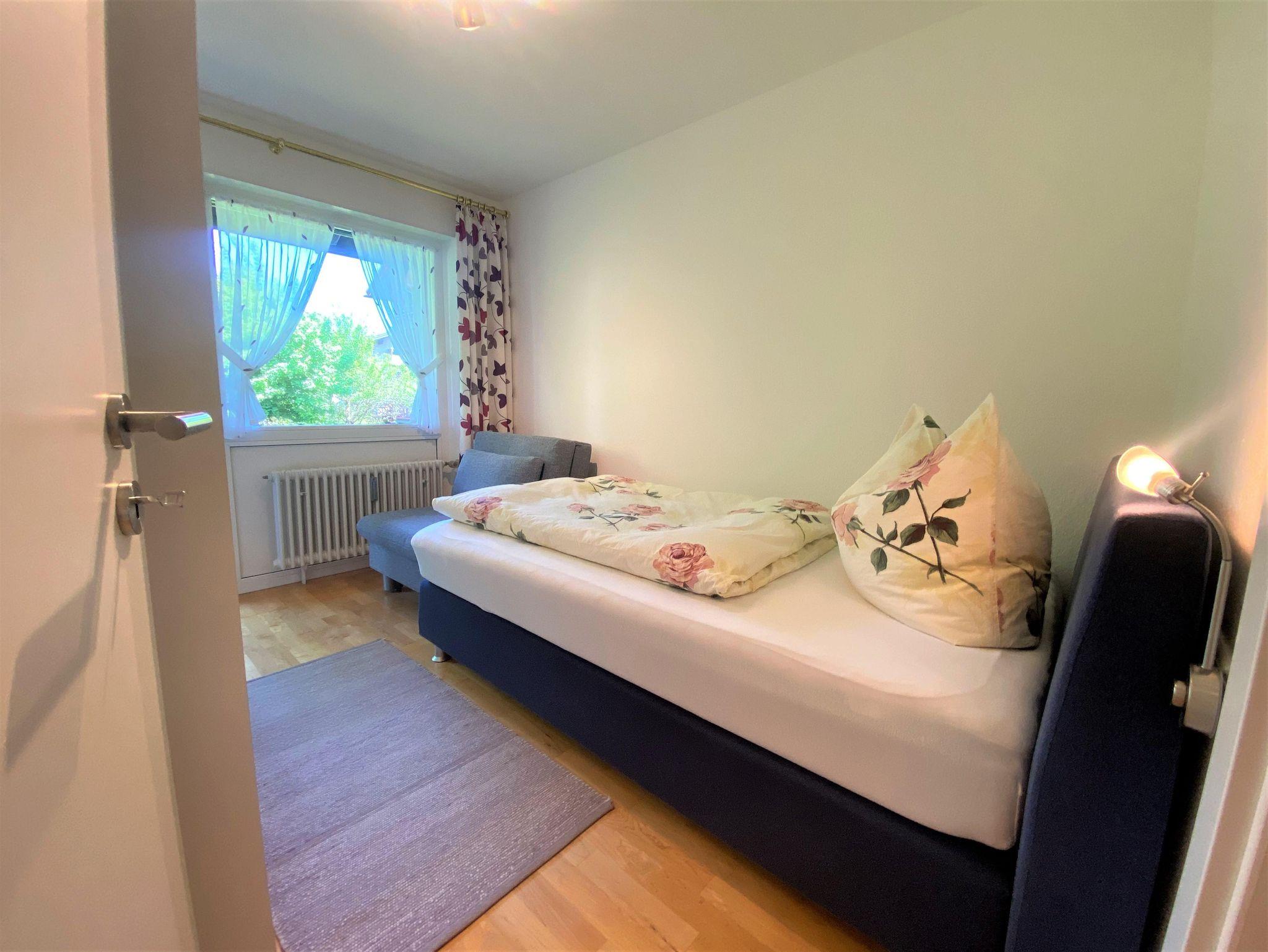 Schlafzimmer mit Parkettboden, Doppelbett 2x2 m und großem Kleiderschrank. Weiteres Zimmer mit Parkettboden, Schreibtisch, Einzelbett 2x1m und Kleiderschrank. Kabel-TV-Anschluß, Durchwahltelefon und LAN u.WLAN-Internetzugang.