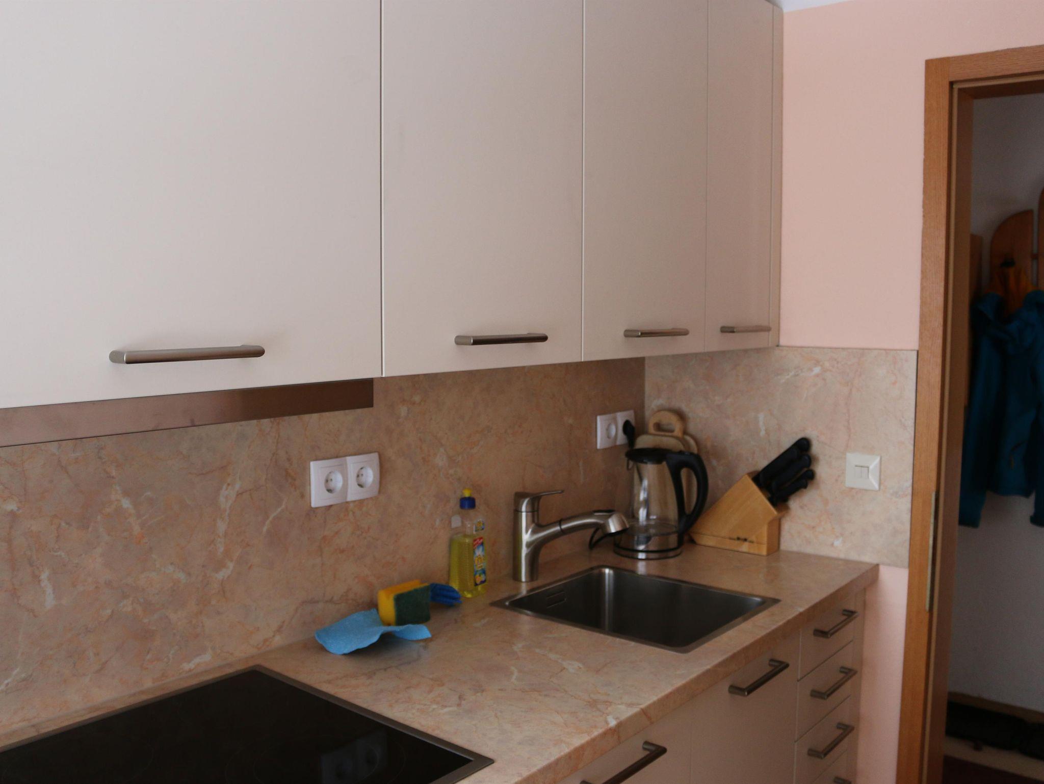 Die Küche ist ausgestattet mit Spüle, 4 Ceranfeldplatten, Backofen, Kühlschrank, Spülm. und Mikrowelle/Grill. Es gibt genügend Besteck, Geschirr, Töpfe und Pfannen.