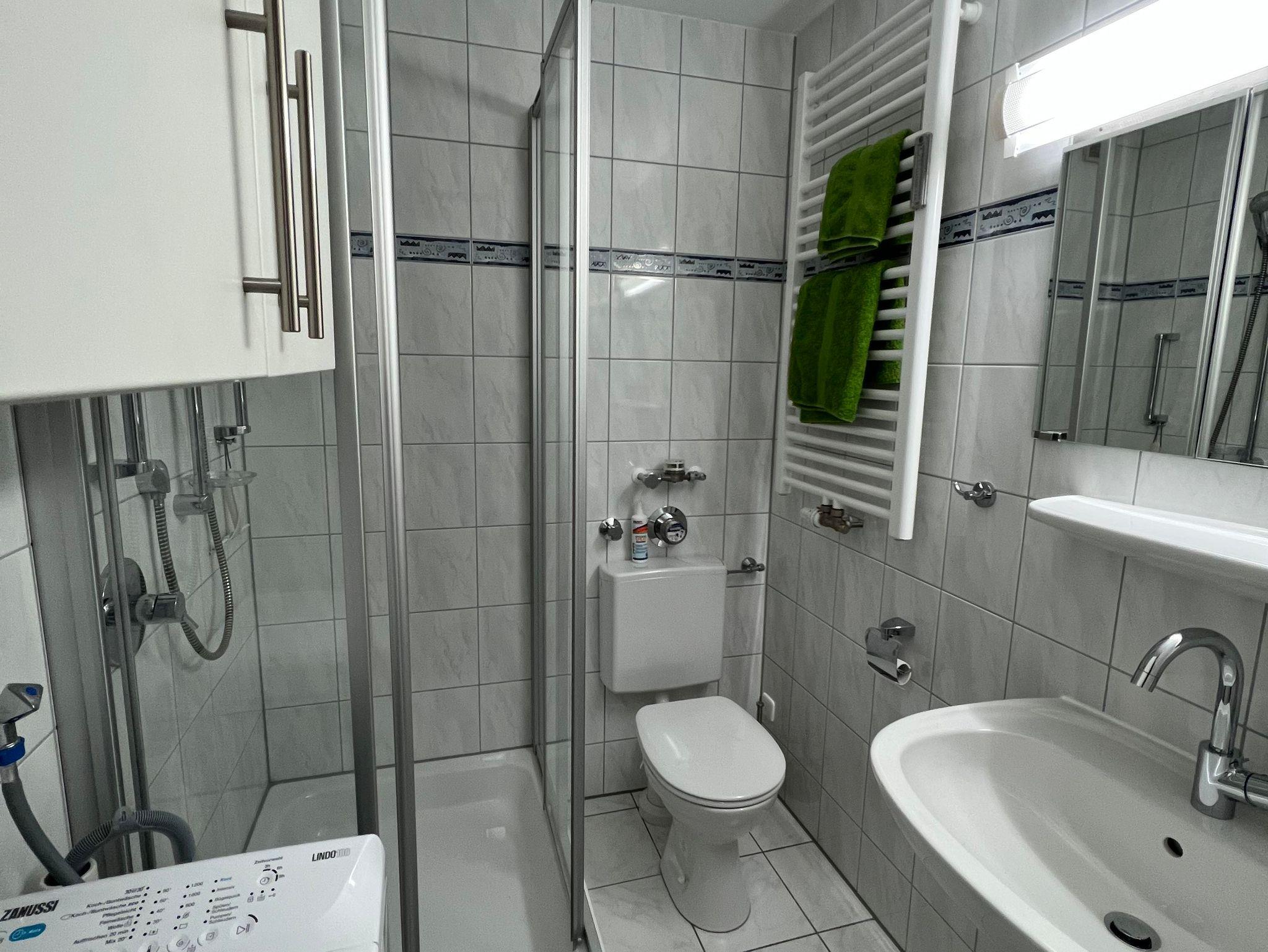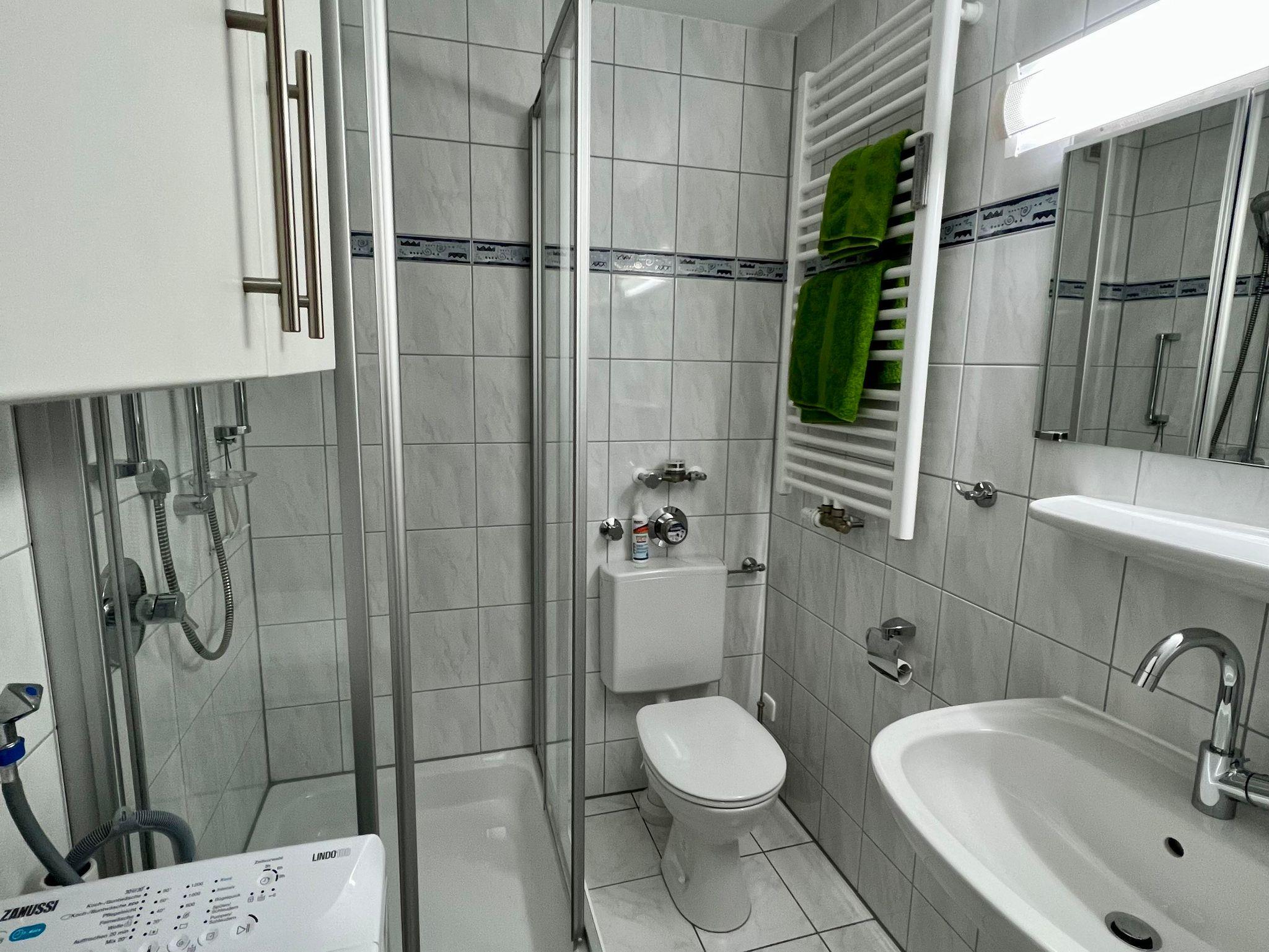Das Bad bietet Ihnen eine Dusche und eine Toilette. Die Ausstattung beinhaltet einen Spiegelschrank und eine Waschmaschine.