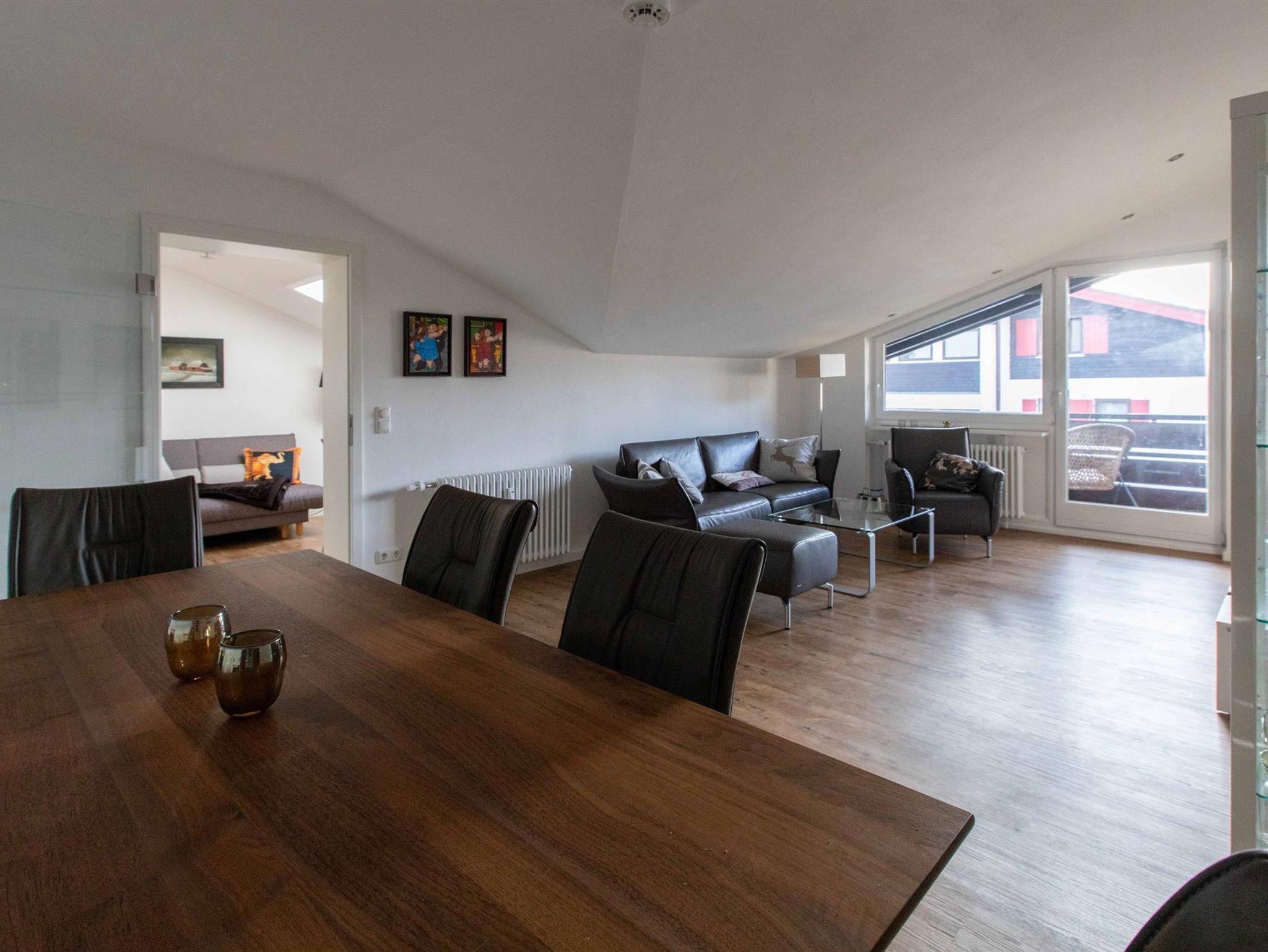 Das hochwertig möblierte Wohnzimmer bietet Entspannung beim Fernsehen oder Musikhören von modernster Technik (TV Soundbar, Blue-Ray-Player.)Besonders gemütlich ist die Essecke, wo Sie auf Lederstühlen oder der Bank am Massivholztisch Platz nehmen. Verschiedene echte Bilder und Grafiken tragen zu dem besonderen Ambiente bei.Vom Wohnzimmer gelangen Sie auf den Südbalkon und können es sich in den Loungesesseln bequem machen. Das Schlafzimmer ist ebenfalls mit bequemen und wertigen Möbeln ausgestattet. Der Kleiderschrank und eine Bank bieten ausreichend Platz für Ihre Garderobe. Hier nutzen Sie den zweiten Flachbildfernseher oder lassen sich von den großen Fotografien für besondere Träume inspirieren. Ein fest installierter Safe steht zur Verfügung.In Schlafzimmer, Küche und Wohnzimmer erlauben Plissees und elektrische Rollläden absolute Privatsphäre. Vom Schlafzimmer und von der Küche gelangen Sie auf den nach Osten gerichteten zweiten Balkon,wo ebenfalls ein Tisch und vier Stühle stehen
