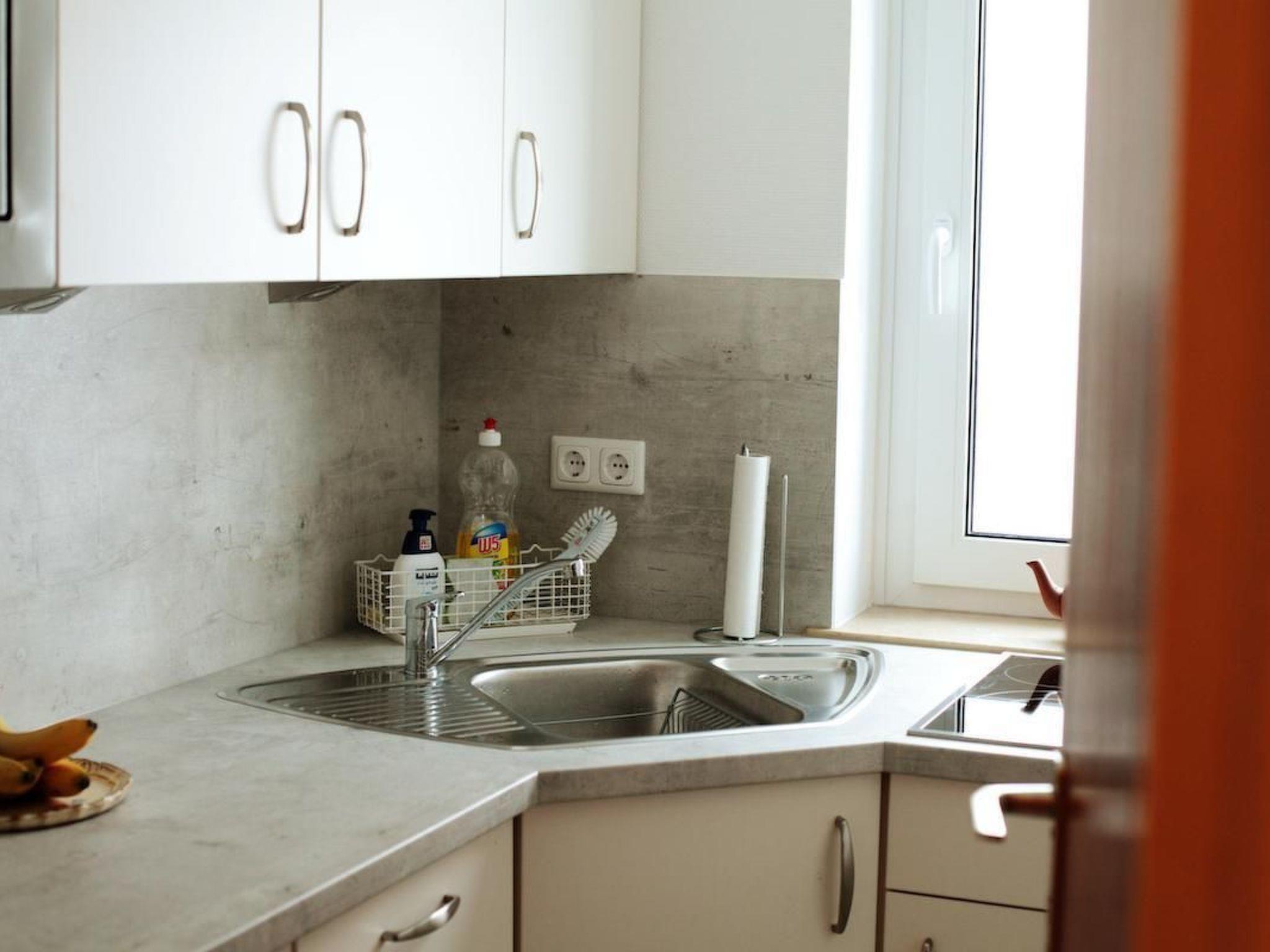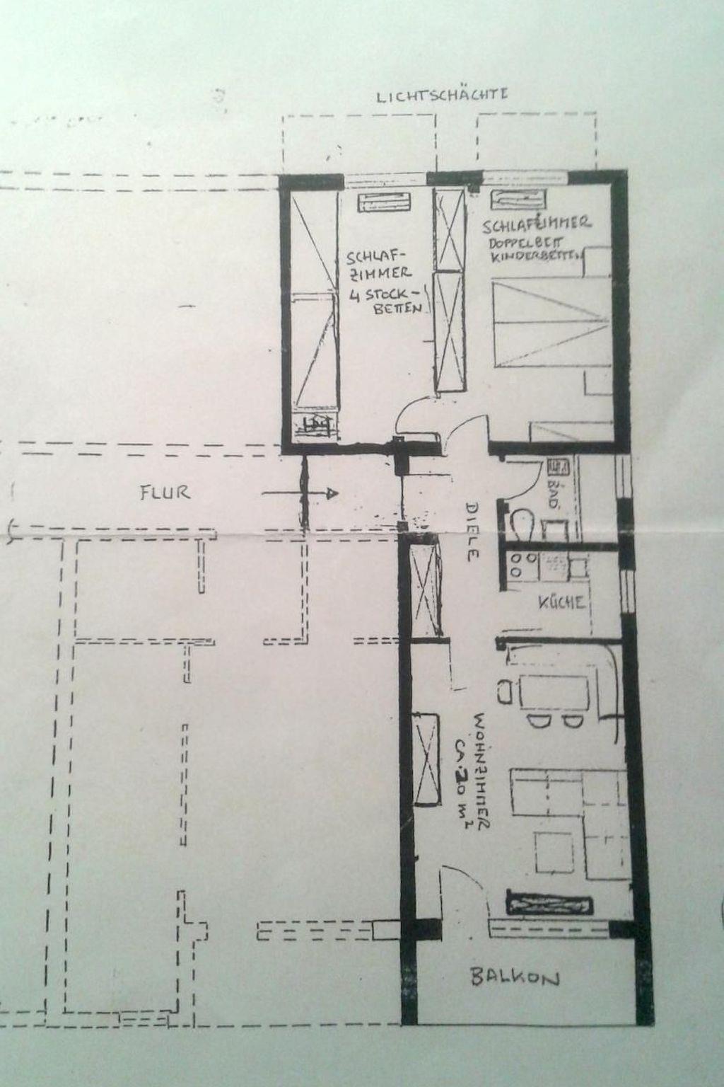 The 65 m² flat is located in the basement and comprises a master bedroom with a cot, a bedroom with two bunk beds, a bathroom with bathtub, a kitchen with dishwasher, small microwave with baking function, a living room with satellite TV, DVD player and cosy dining area as well as a balcony with deckchair.