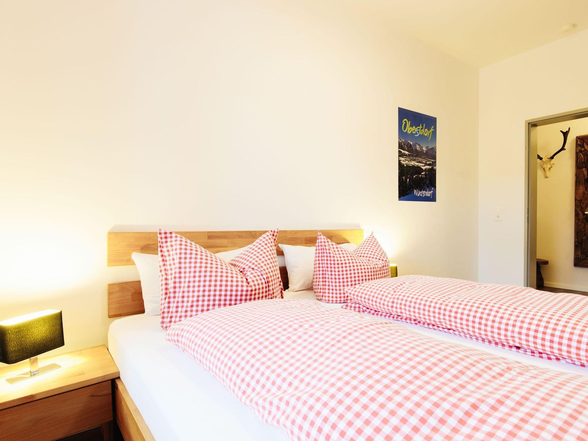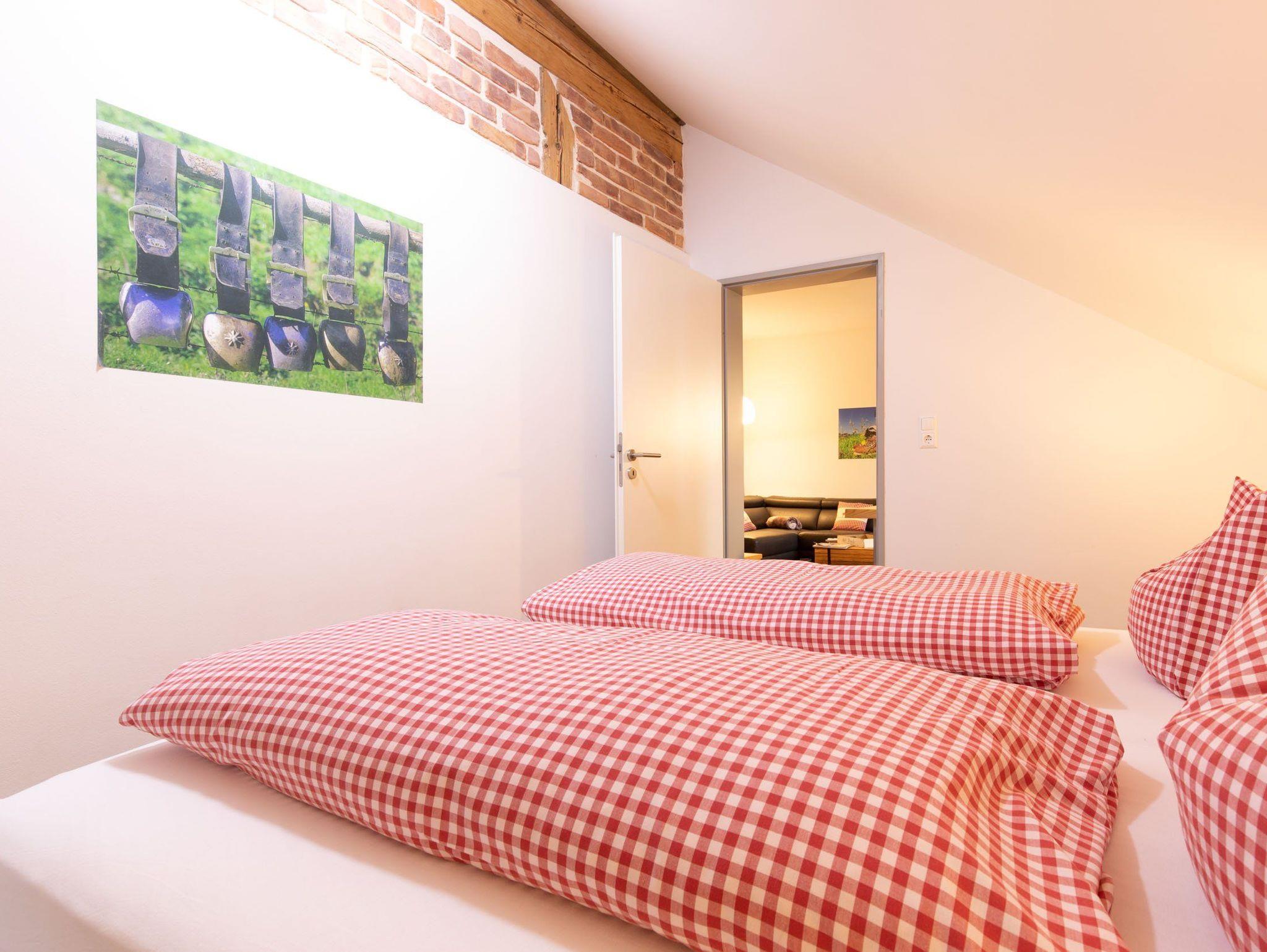 3 Zimmer Ferienwohnung mit 64 m² für 1 bis 4 Personen, 3 Räume mit 2 Schlafzimmern, Wohnzimmer, Küchenzeile in der geräumigen Diele, 2. Obergeschoß/Dachgeschoß, Südbalkon, Bergblick, Kinderzustellbett/-hochstuhl auf Anfrage möglich