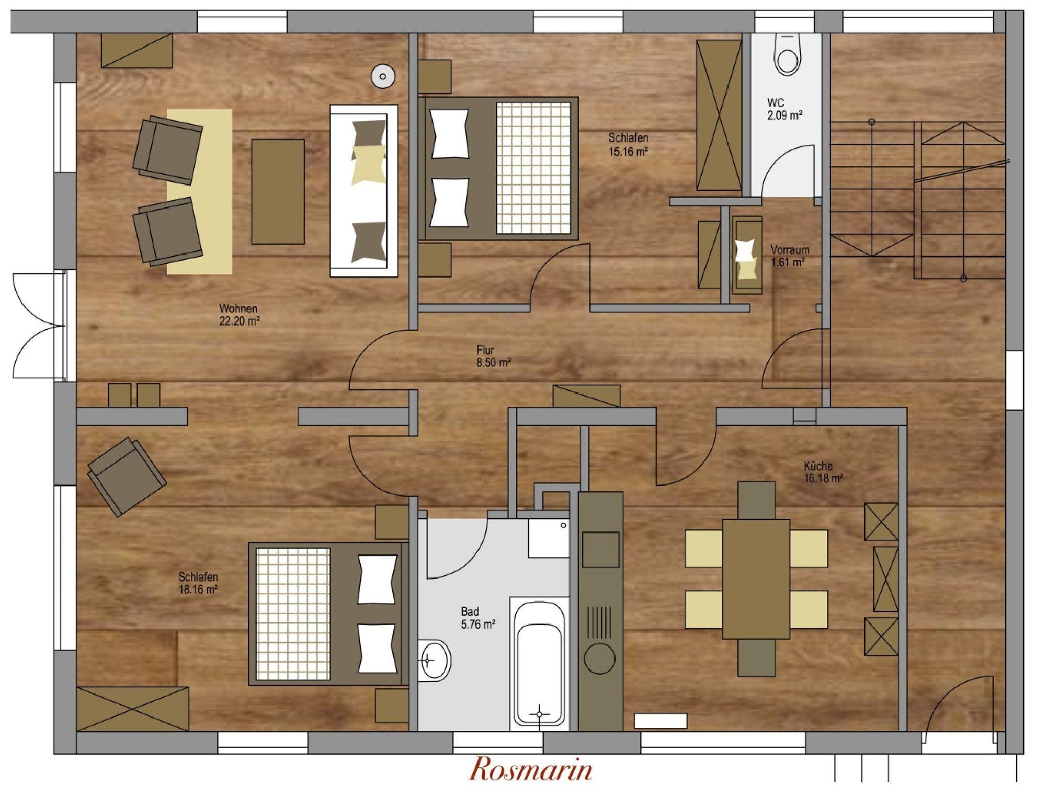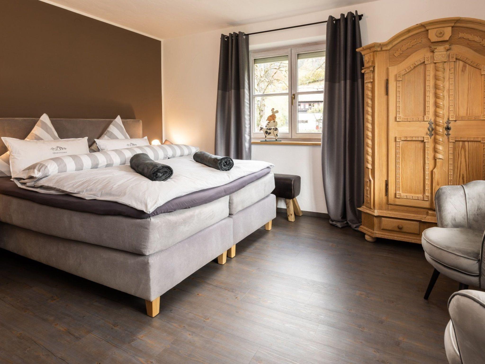 Die helle 5-Sterne-Ferienwohnung Rosmarin liegt im Erdgeschoss und hat eine sonnige Süd-Terrasse mit Blick über Wiesen bis in die Berge. Zwei Schlafzimmer und eine große Küche mit Esstisch im Landhausstil laden zum Entspannen ein.